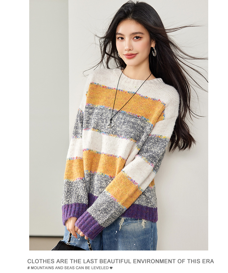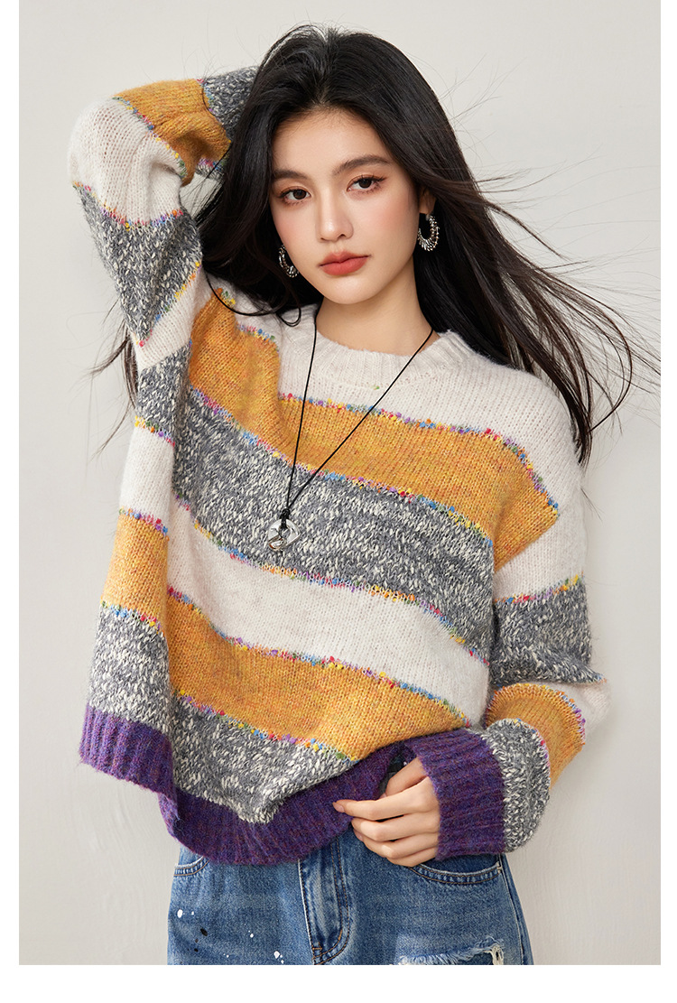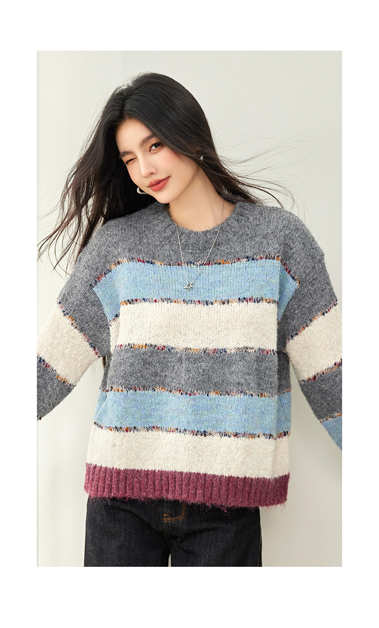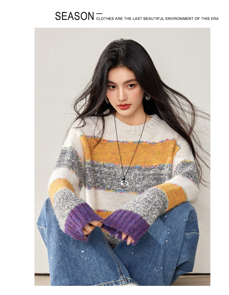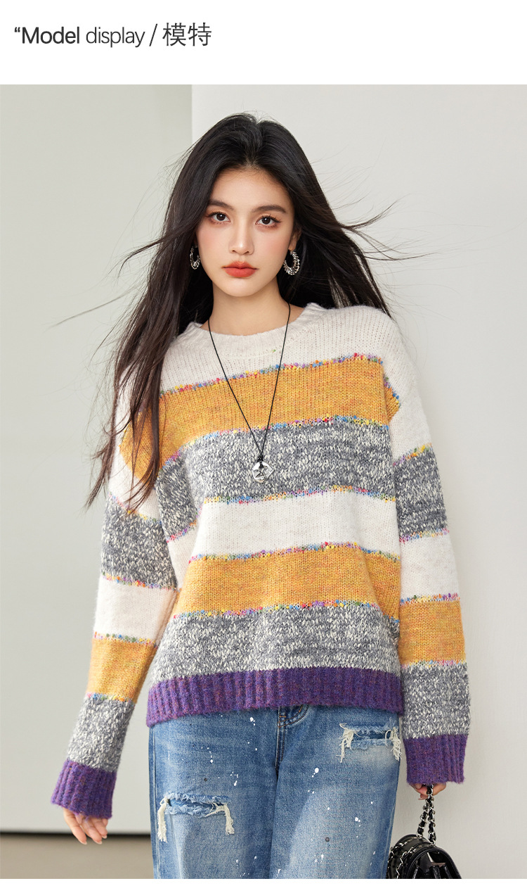 2024 년 겨울 새로운 한국 스타일 게으른 느슨한 부드러운 왁스 디자인 센스 컬러 스트라이프 풀오버 승무원 목 니트 스웨터