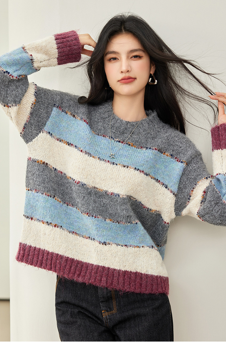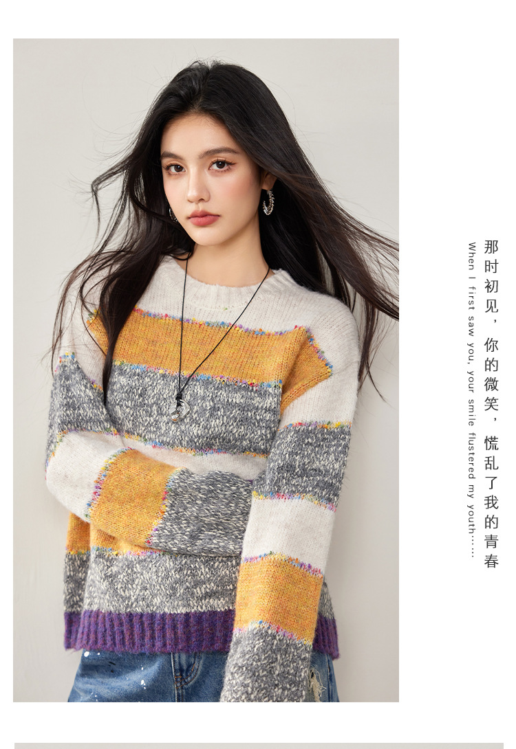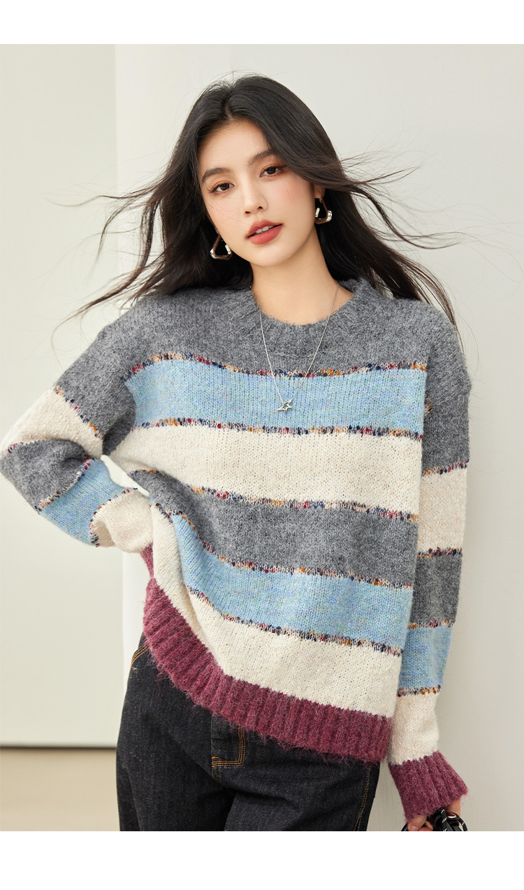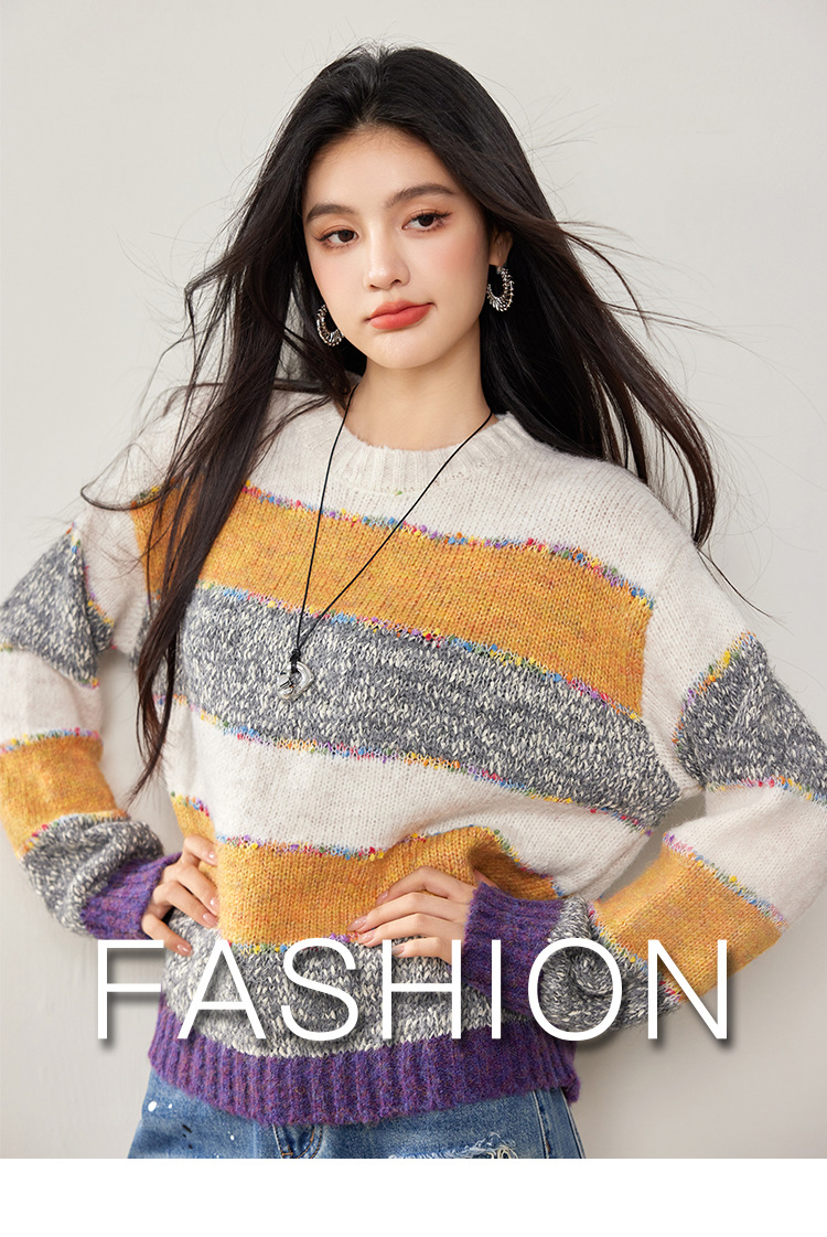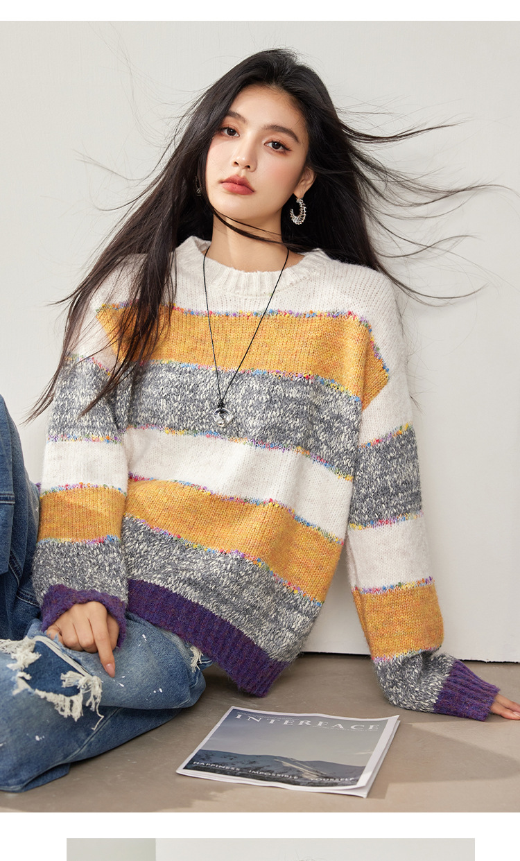 2024 년 겨울 새로운 한국 스타일 게으른 느슨한 부드러운 왁스 디자인 센스 컬러 스트라이프 풀오버 승무원 목 니트 스웨터