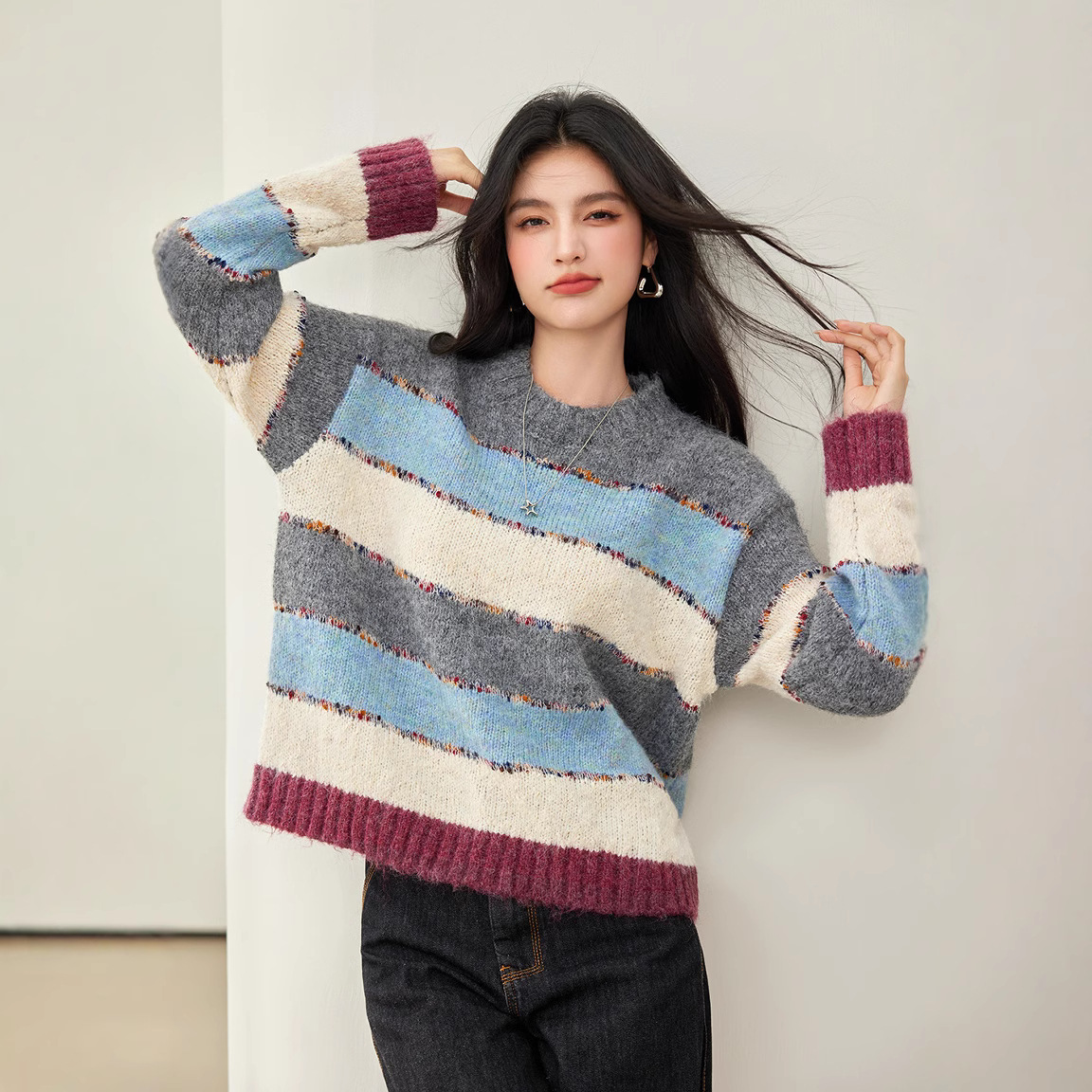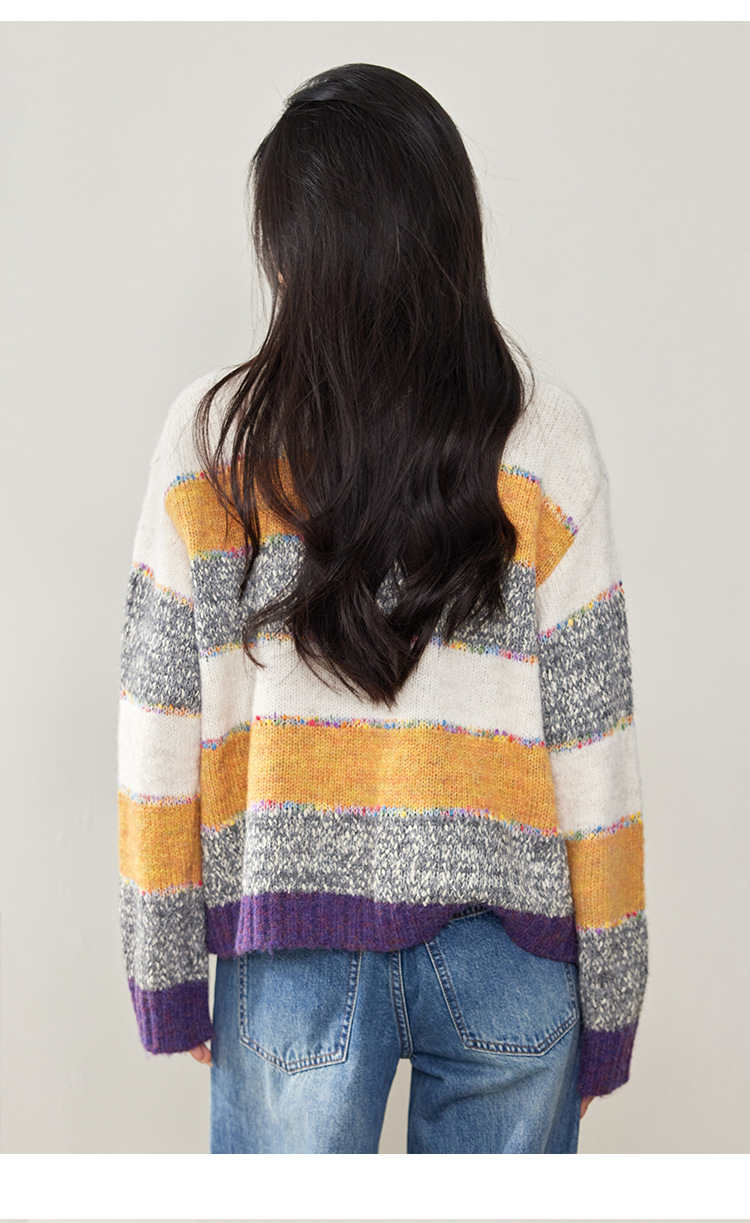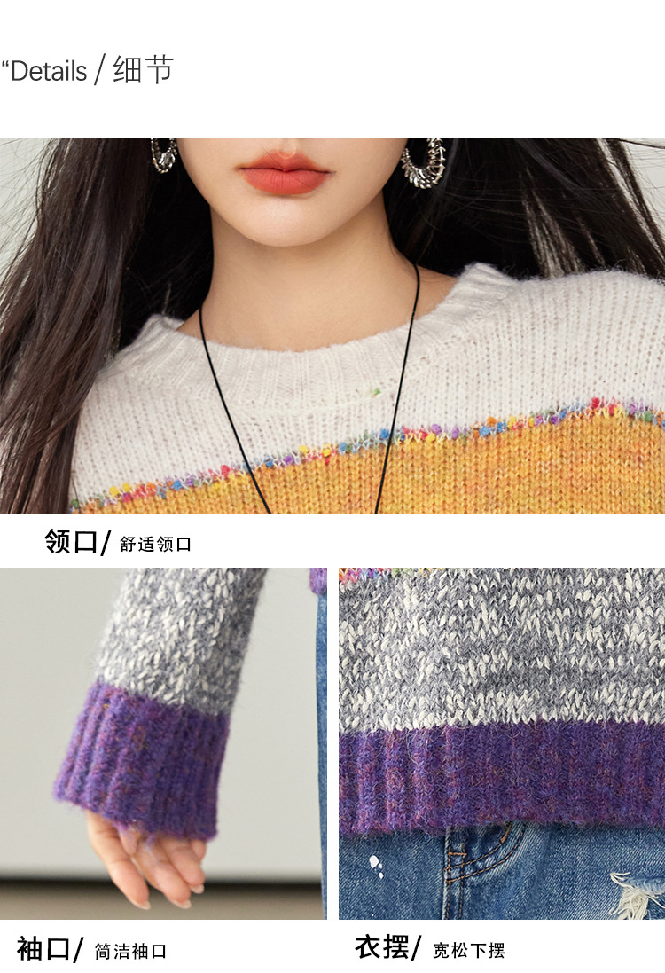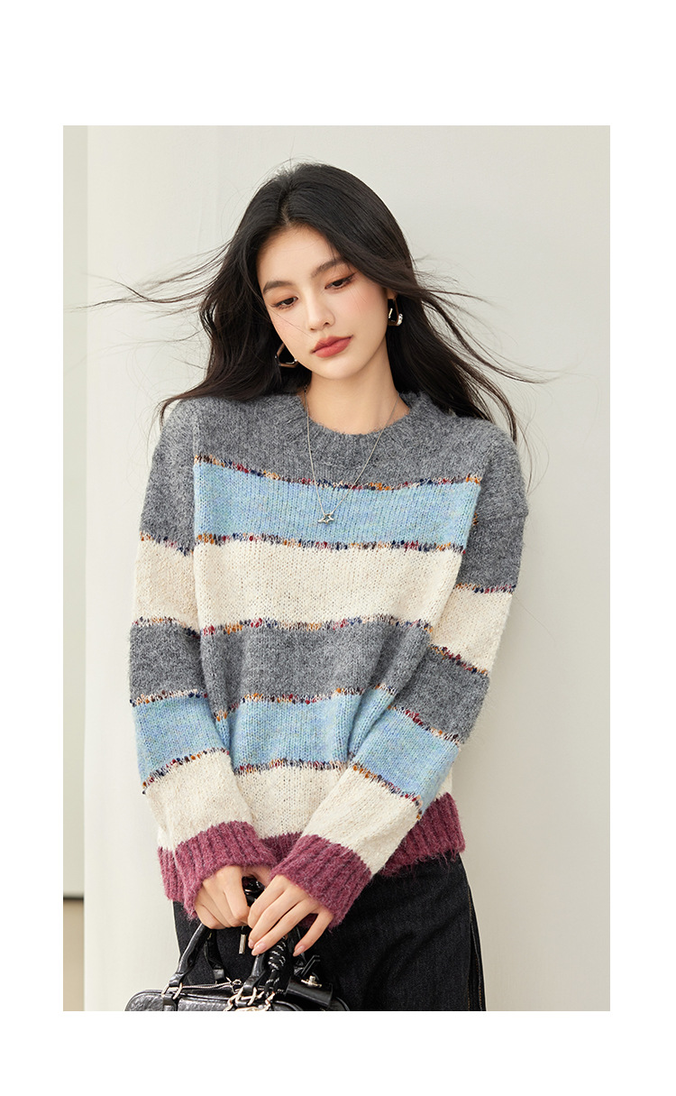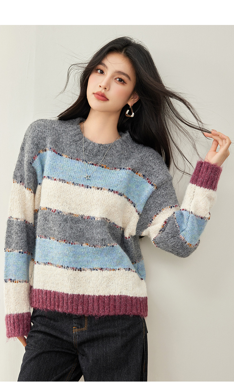 2024 년 겨울 새로운 한국 스타일 게으른 느슨한 부드러운 왁스 디자인 센스 컬러 스트라이프 풀오버 승무원 목 니트 스웨터