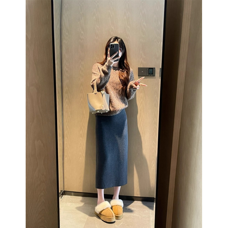 2024 가을과 겨울의 새로운 한국 버전 하이웨이스트 슬리밍 스트레이트 튜브 하이 엔드 올 매치 니트 울 힙 A 라인 스커트 어린이스토어 가기