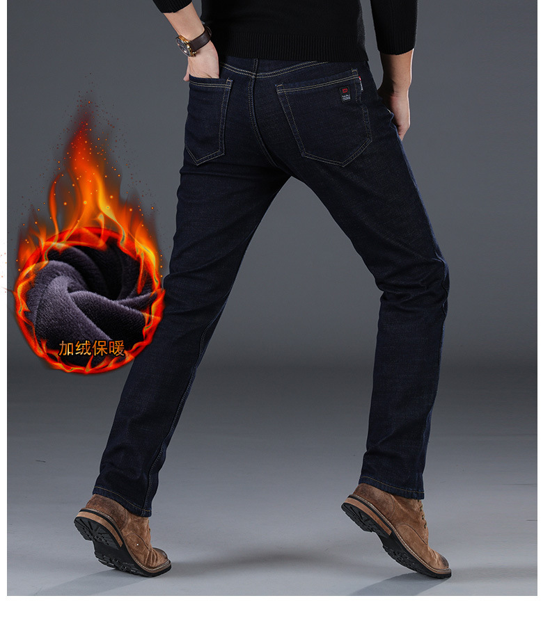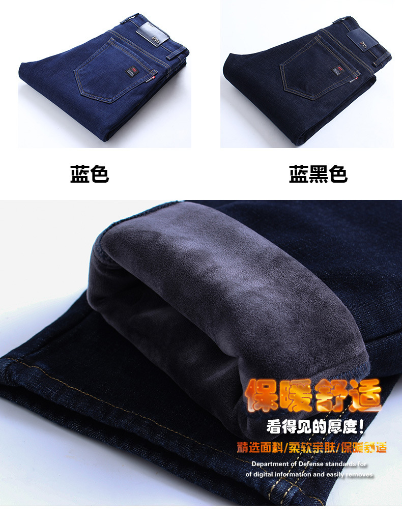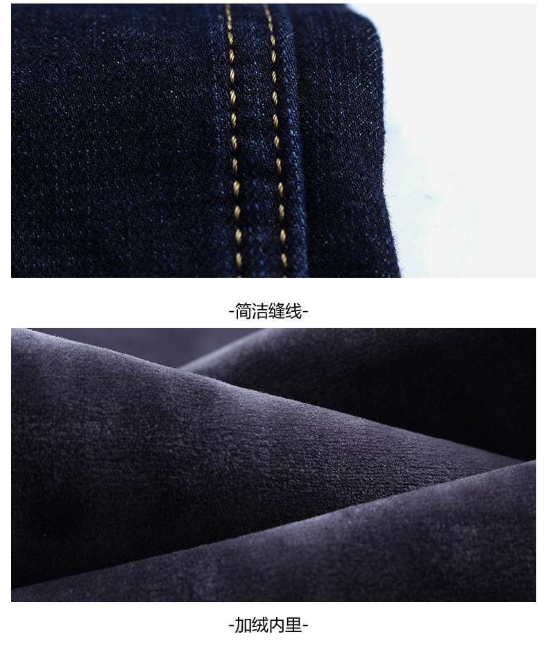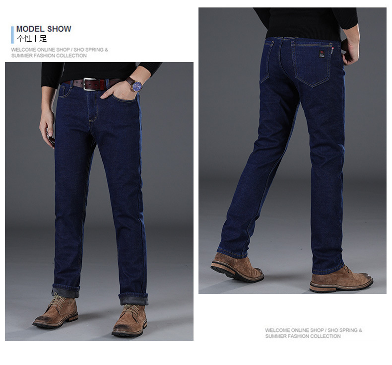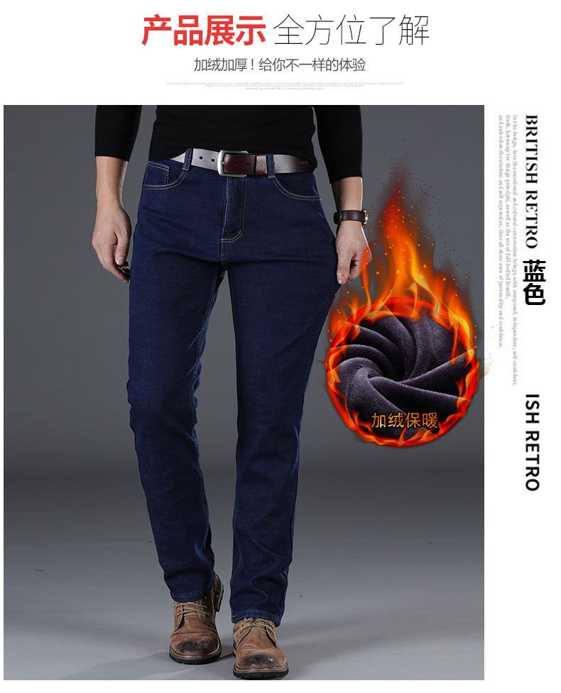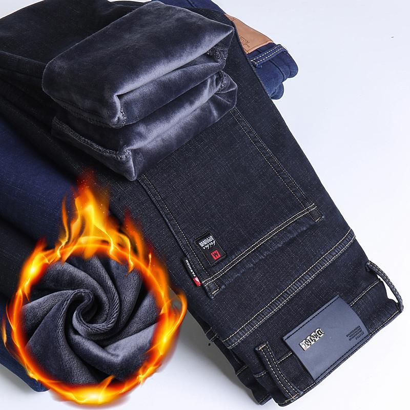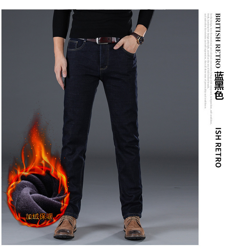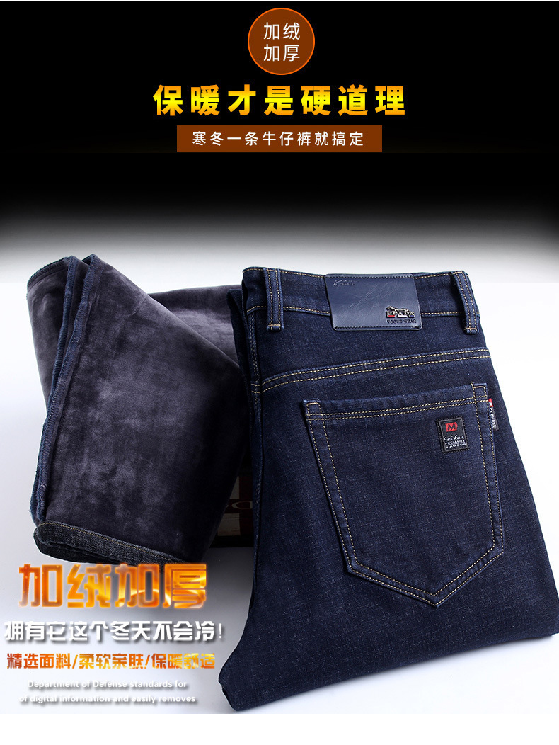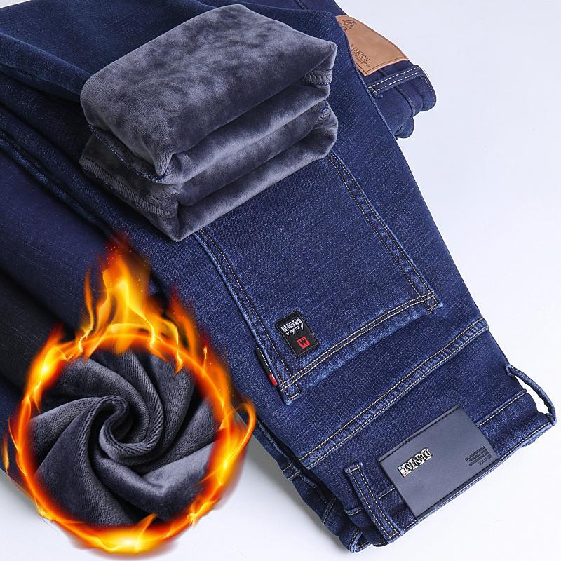 겨울 하이 엔드 기모 두꺼운 청바지 남성용 루즈 스트레이트 하이 웨이스트 남성용 코튼이있는 중년 캐주얼 롱 바지스토어 가기