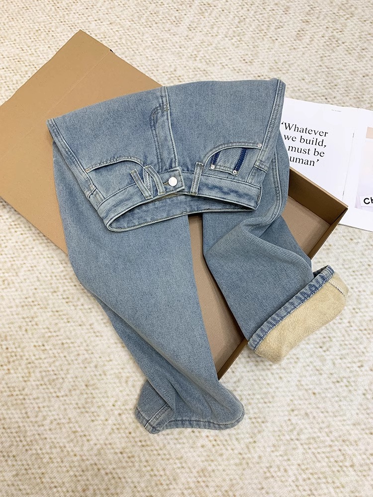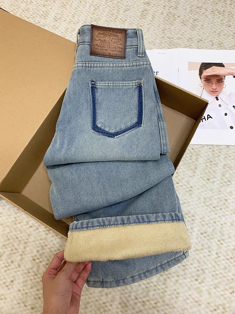 기모 두꺼운 청바지 여성의 겨울 높은 허리 Draping 대조 컬러 포켓 세척 넓은 다리 바지 슬림 룩 긴 바지
