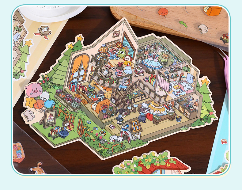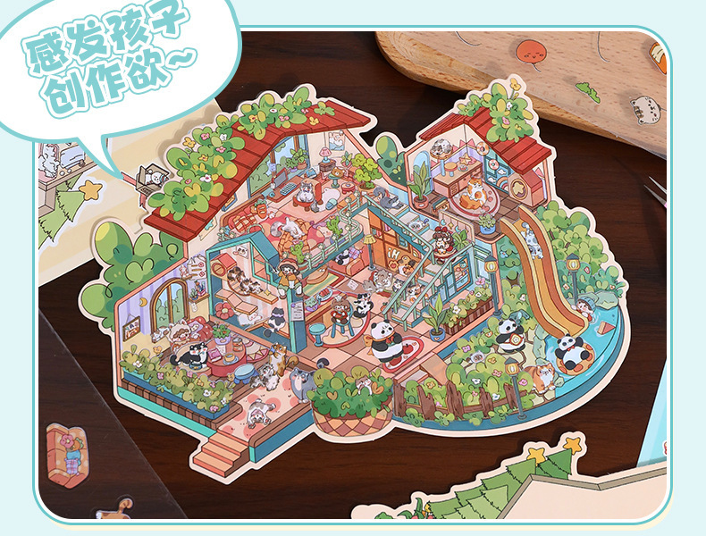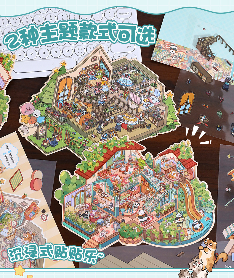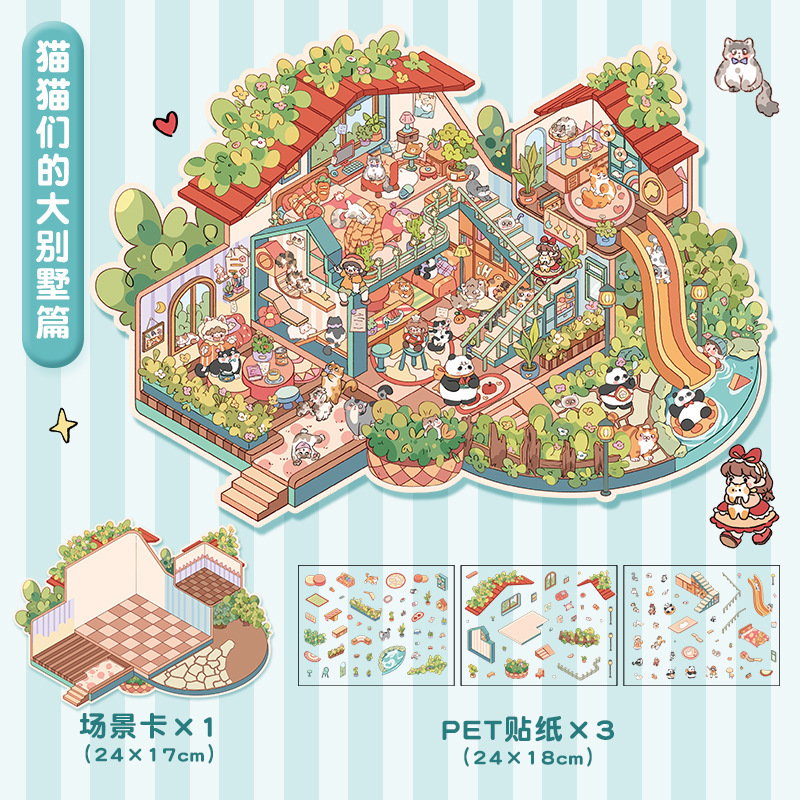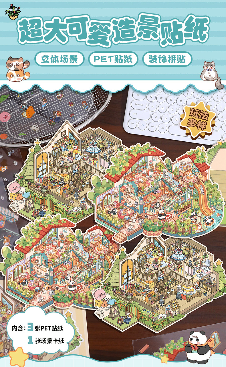 귀여운 슈퍼 대형 마이크로 스케일 장면 스티커 만화 Guofeng 팬더 빌라 쌓인 3D 스테레오 스티커스토어 가기