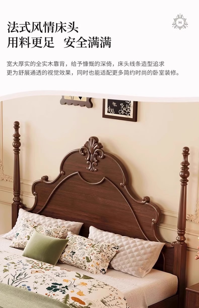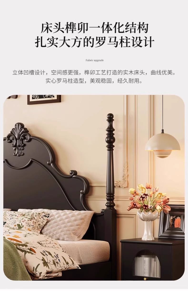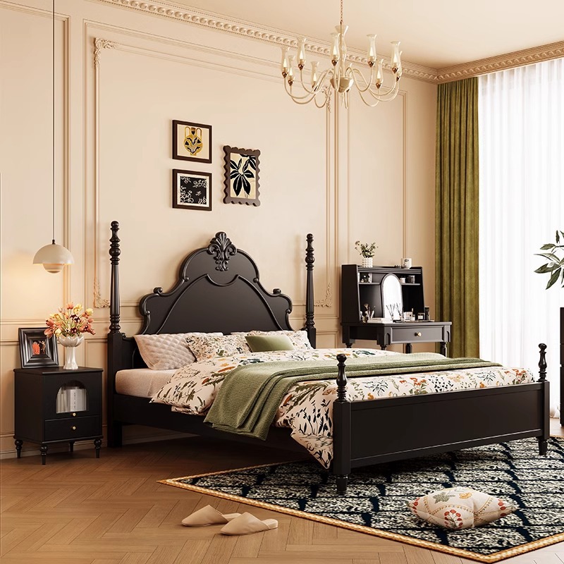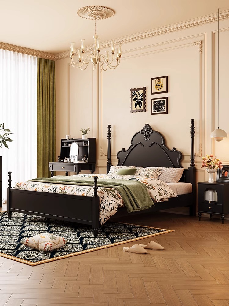 프랑스 레트로 블랙 솔리드 우드 침대 에펠 골동품 더블 침대 마스터 침실 1.8M 가정용 높은 상자 보관