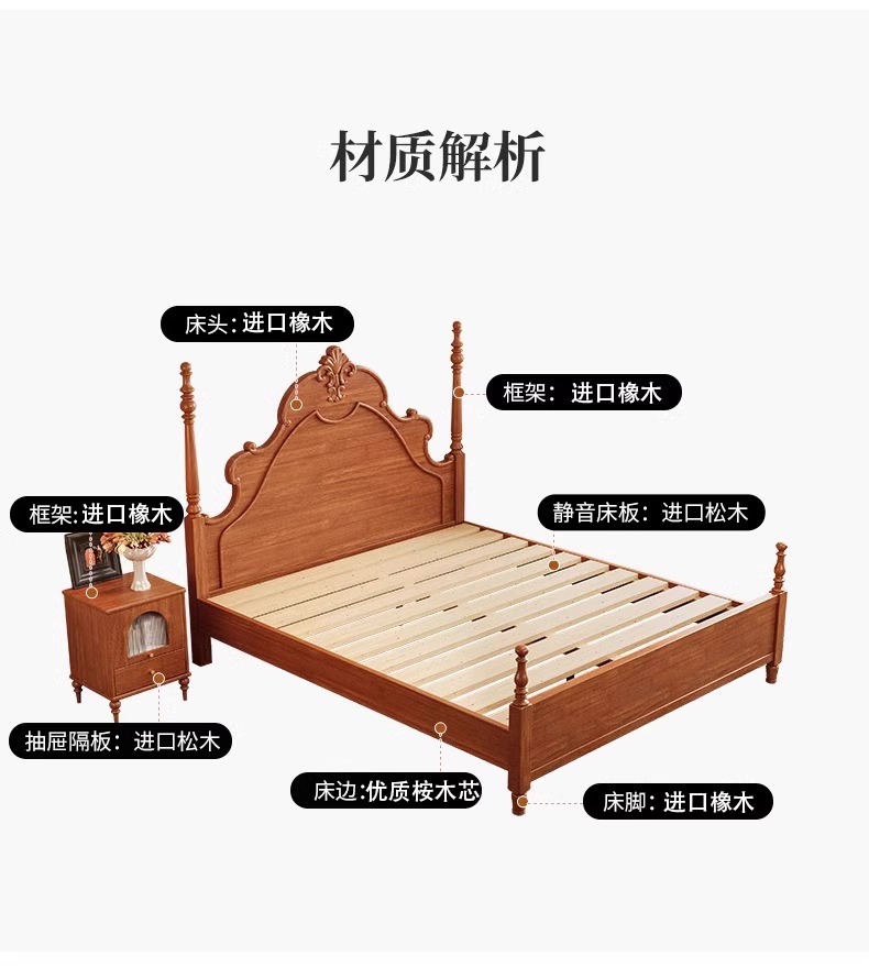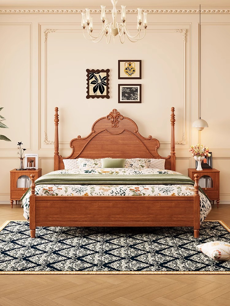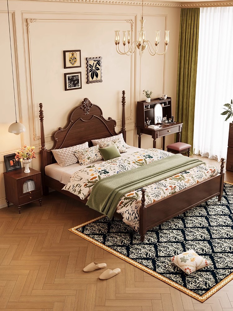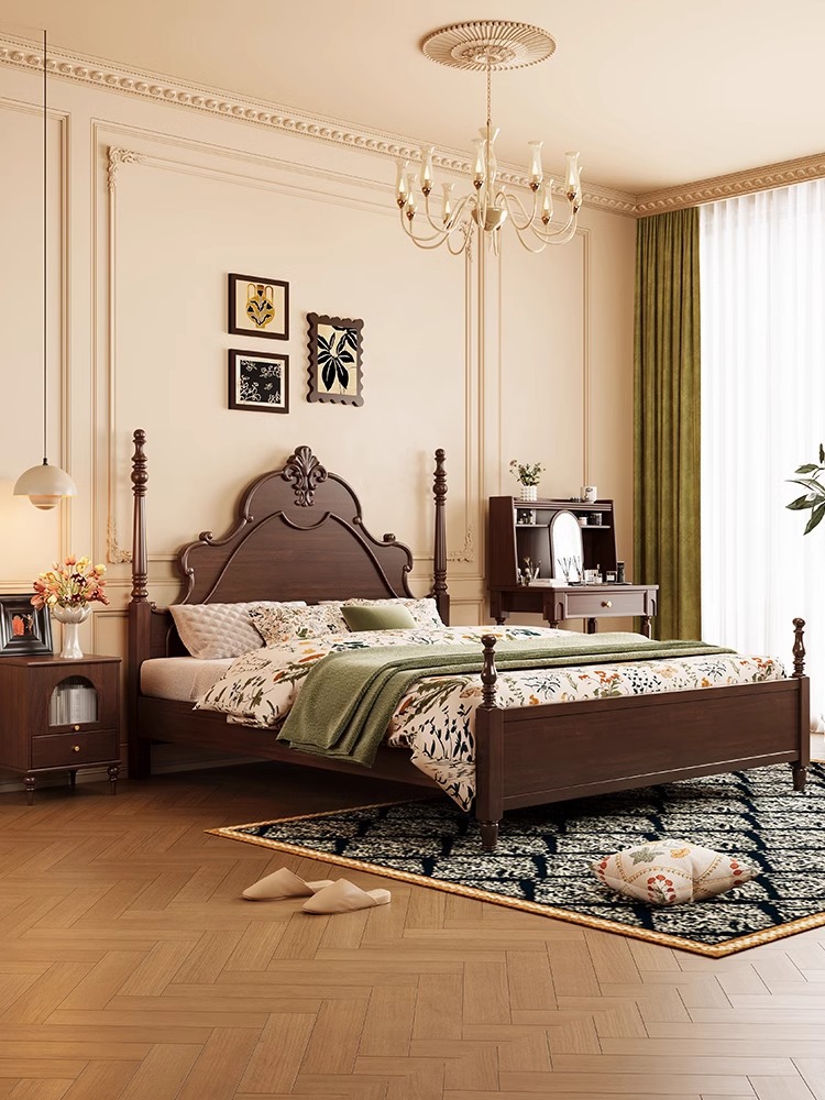 프랑스 레트로 블랙 솔리드 우드 침대 에펠 골동품 더블 침대 마스터 침실 1.8M 가정용 높은 상자 보관