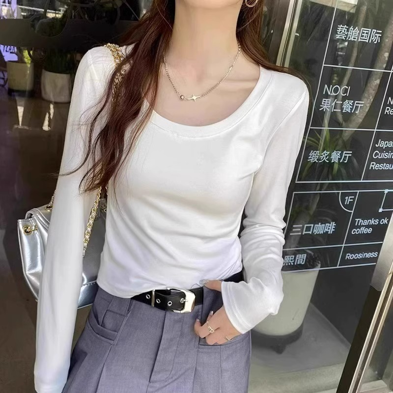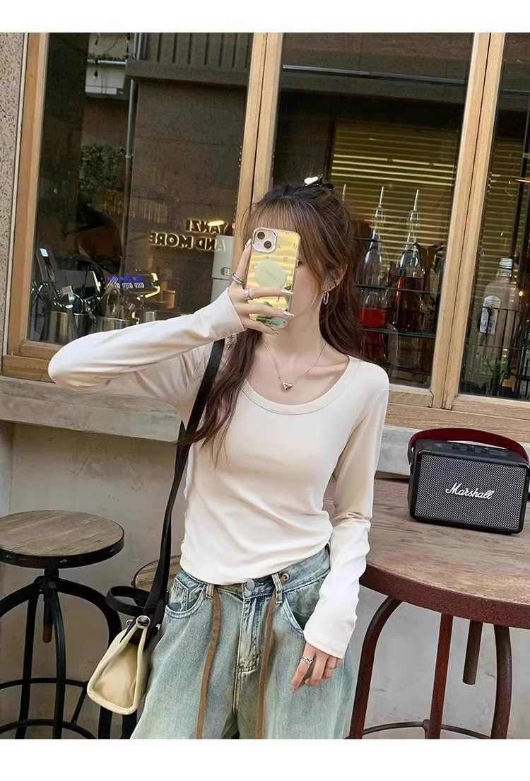 솔리드 컬러 U 넥 칼라 본 긴팔 양털베이스 셔츠 여성의 가을 및 겨울 새로운 한국 스타일 큰 목 내부 슬림 탑
