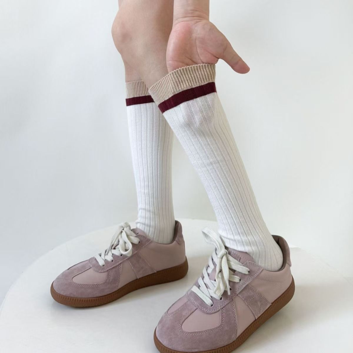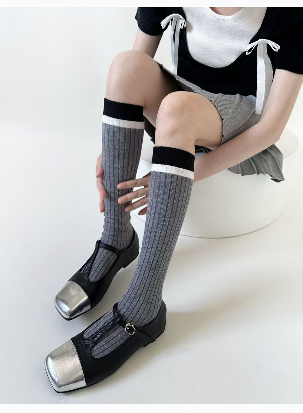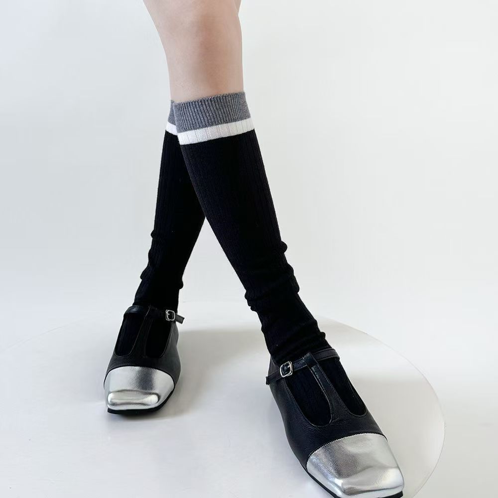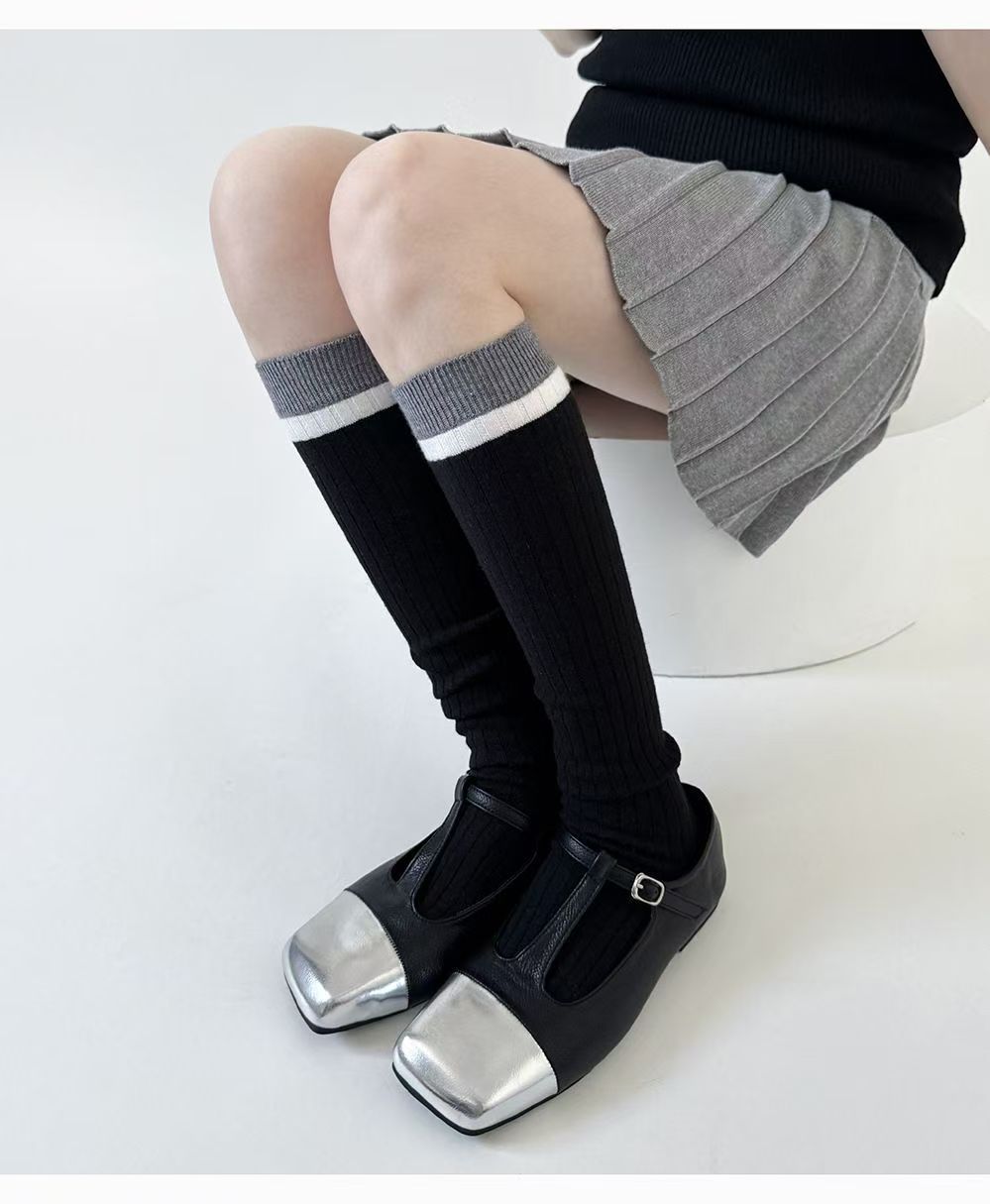 새로운 봄과 가을 줄무늬 송아지 양말 유행 반 무릎 양말 학술 스타일 대비 컬러 캐주얼 일본 회색 더미 양말스토어 가기