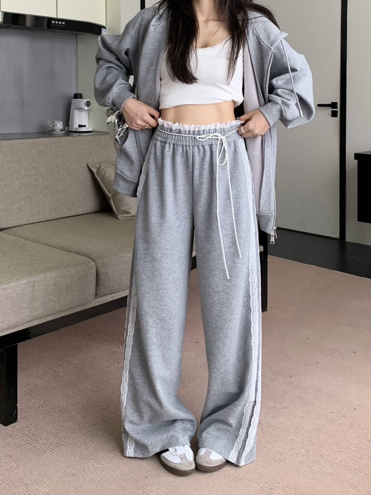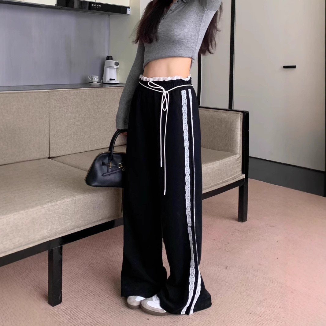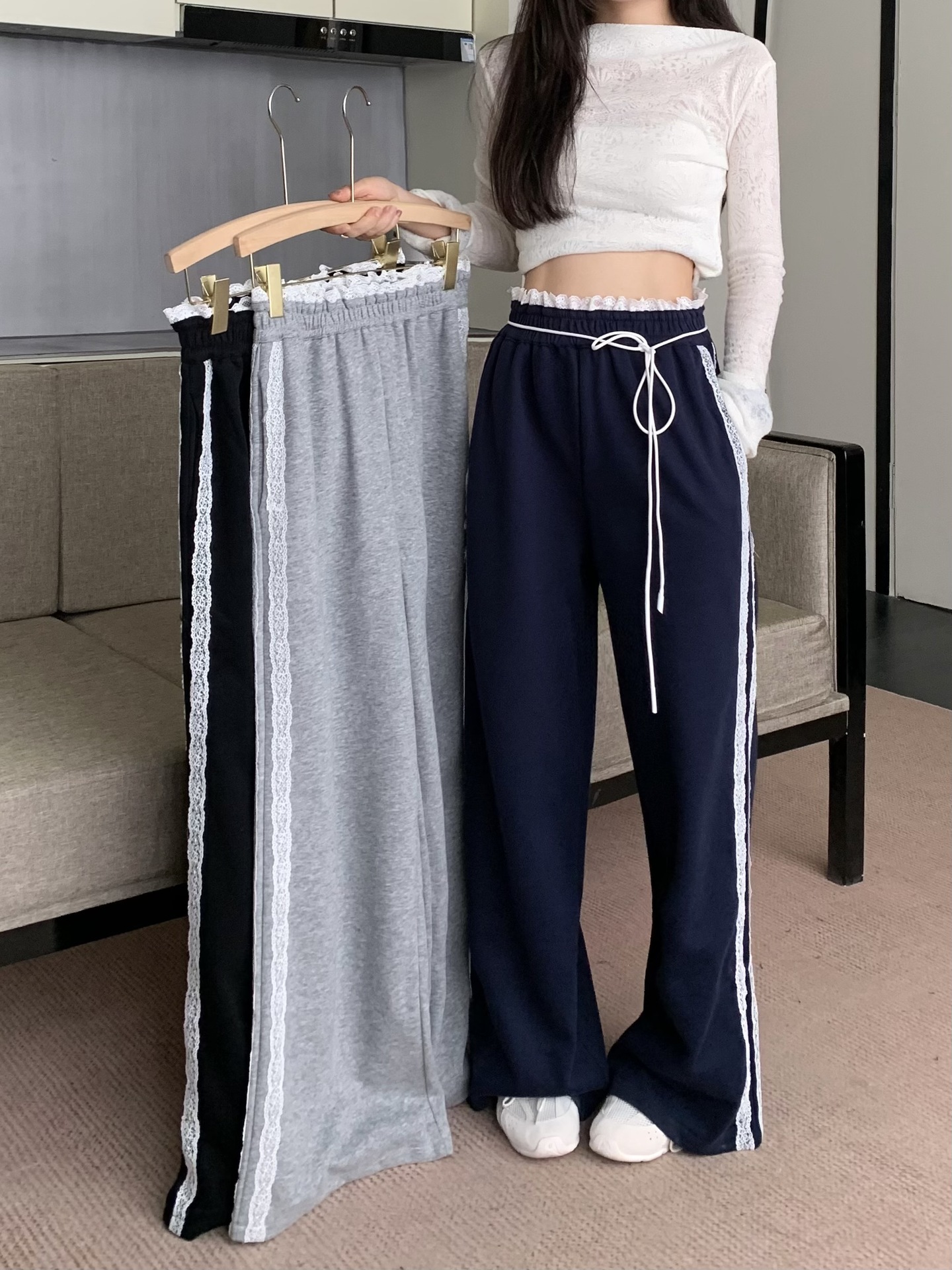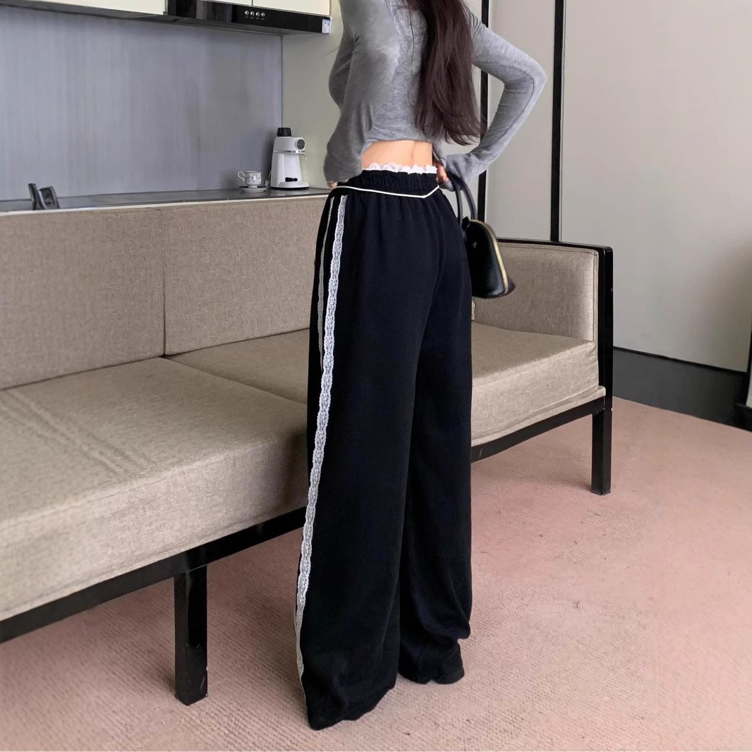 한국식 디자인 레이스 엣지 캐주얼 바지 여성 가을과 겨울 하이 웨이스트 헐렁한 스포츠 바지 드레이프 와이드 레그 팬츠 트렌디 한 바지