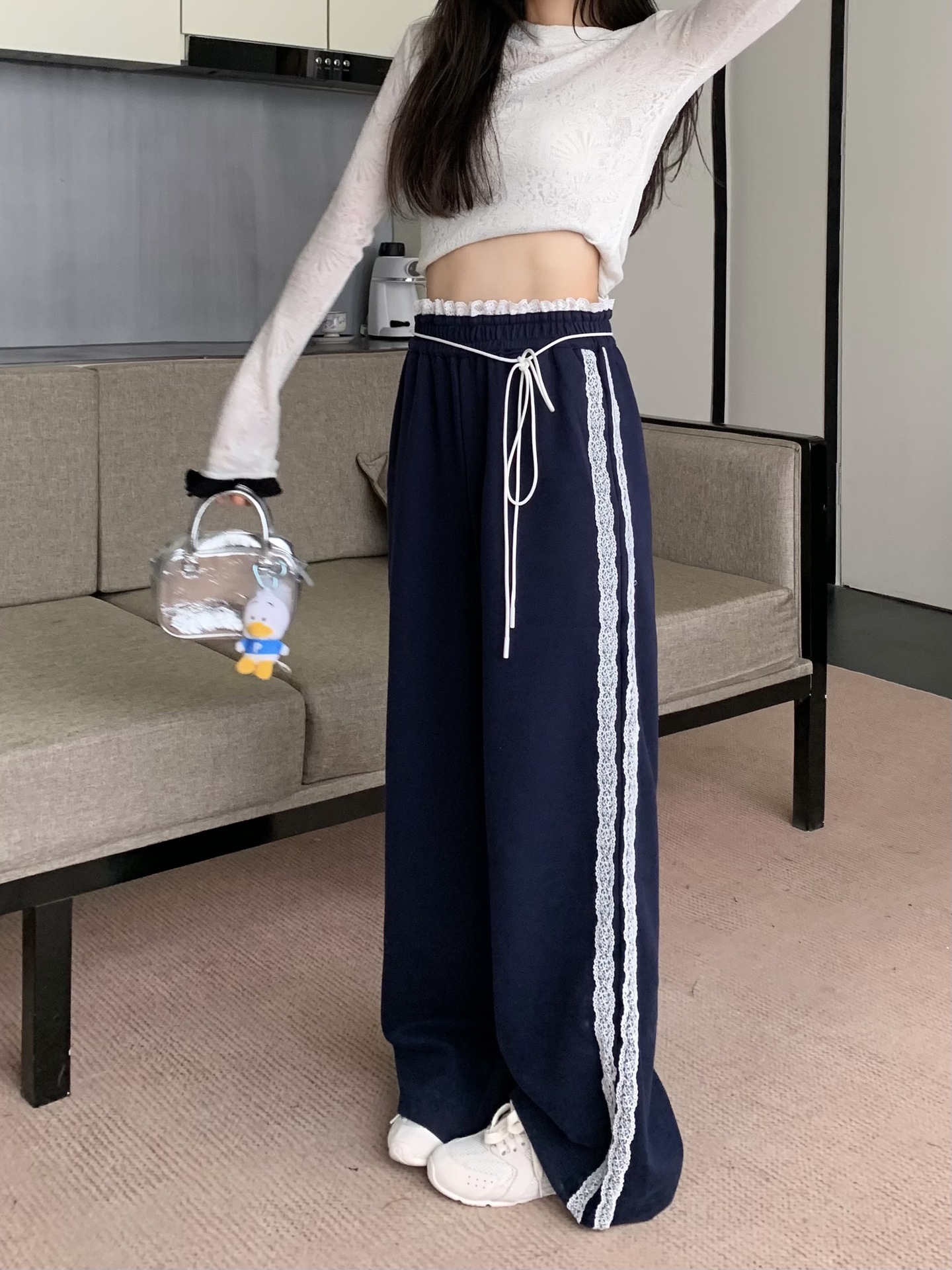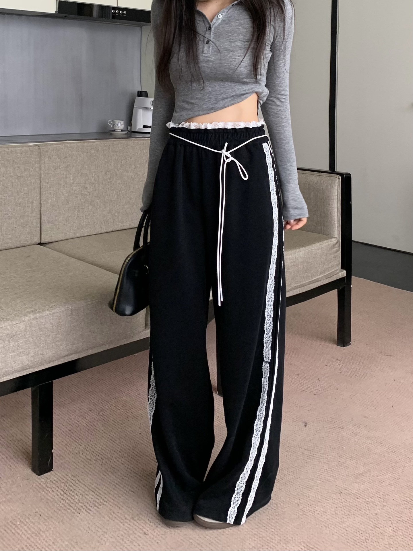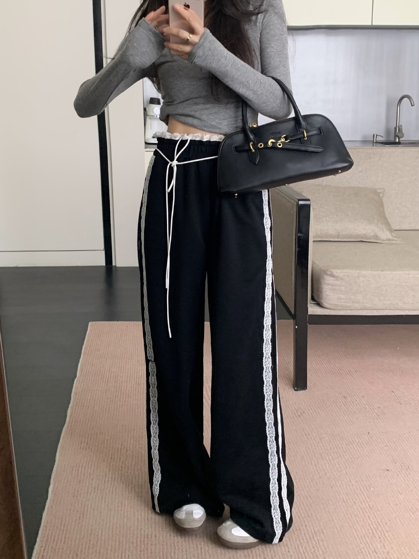 한국식 디자인 레이스 엣지 캐주얼 바지 여성 가을과 겨울 하이 웨이스트 헐렁한 스포츠 바지 드레이프 와이드 레그 팬츠 트렌디 한 바지