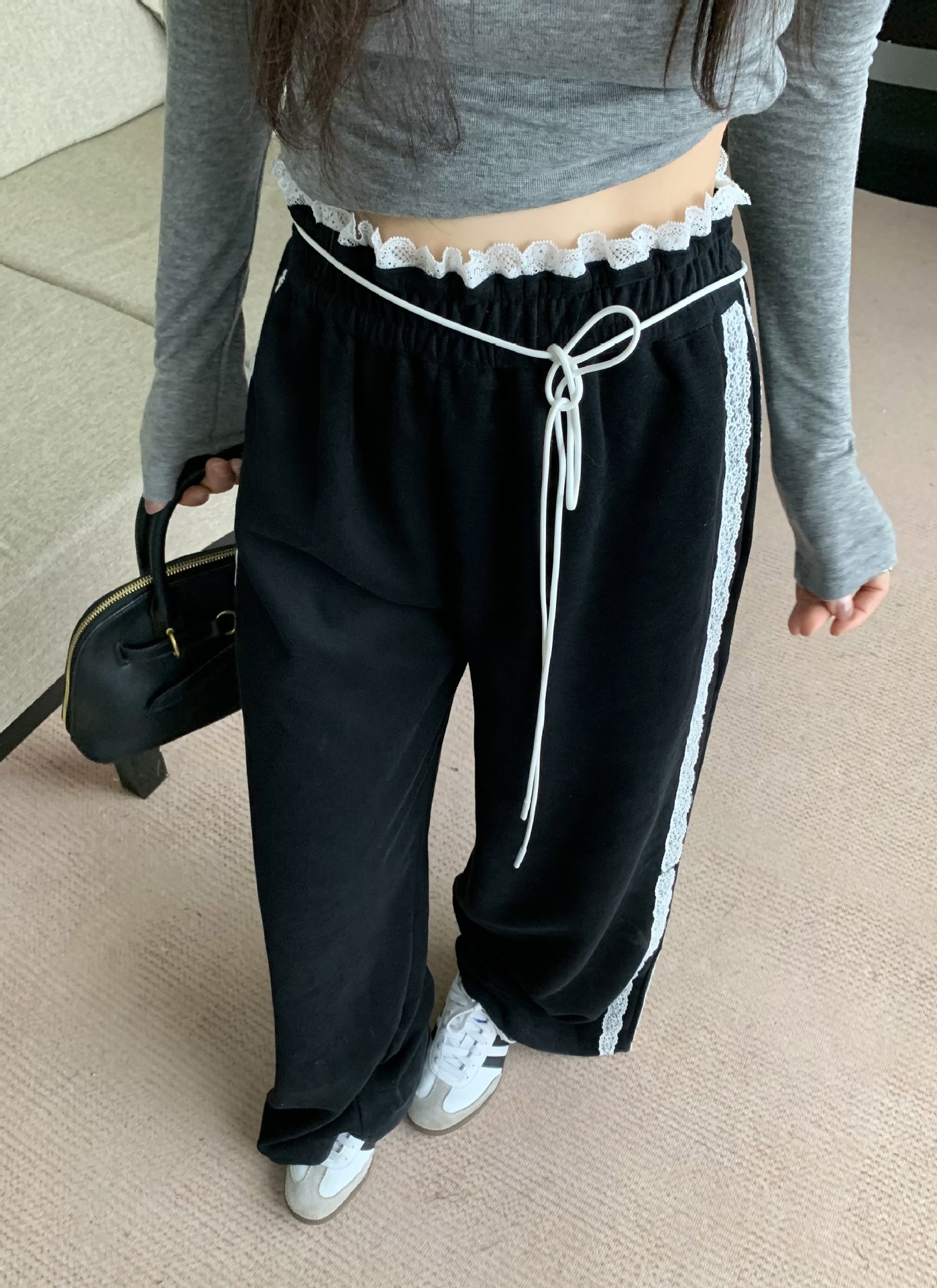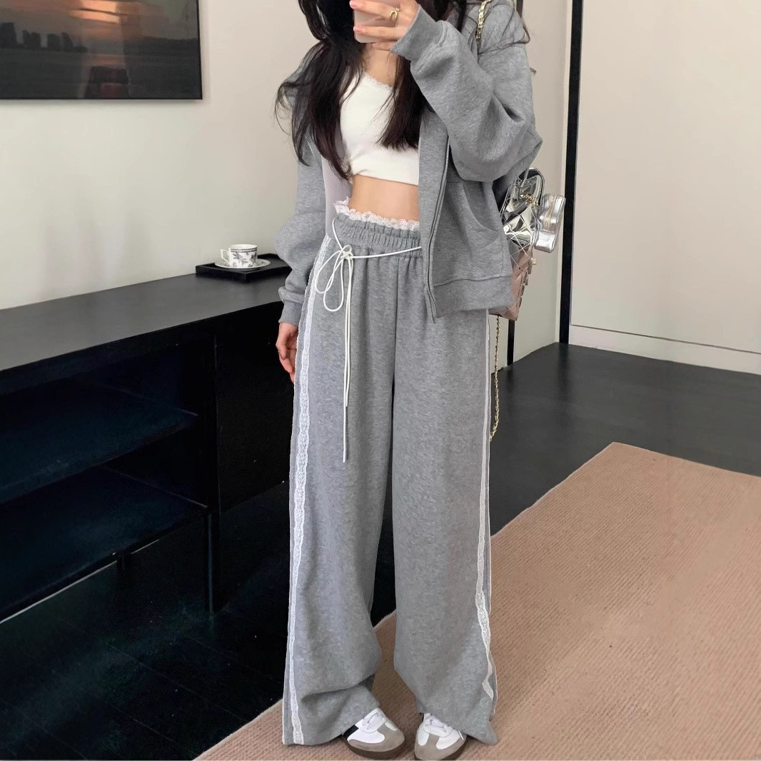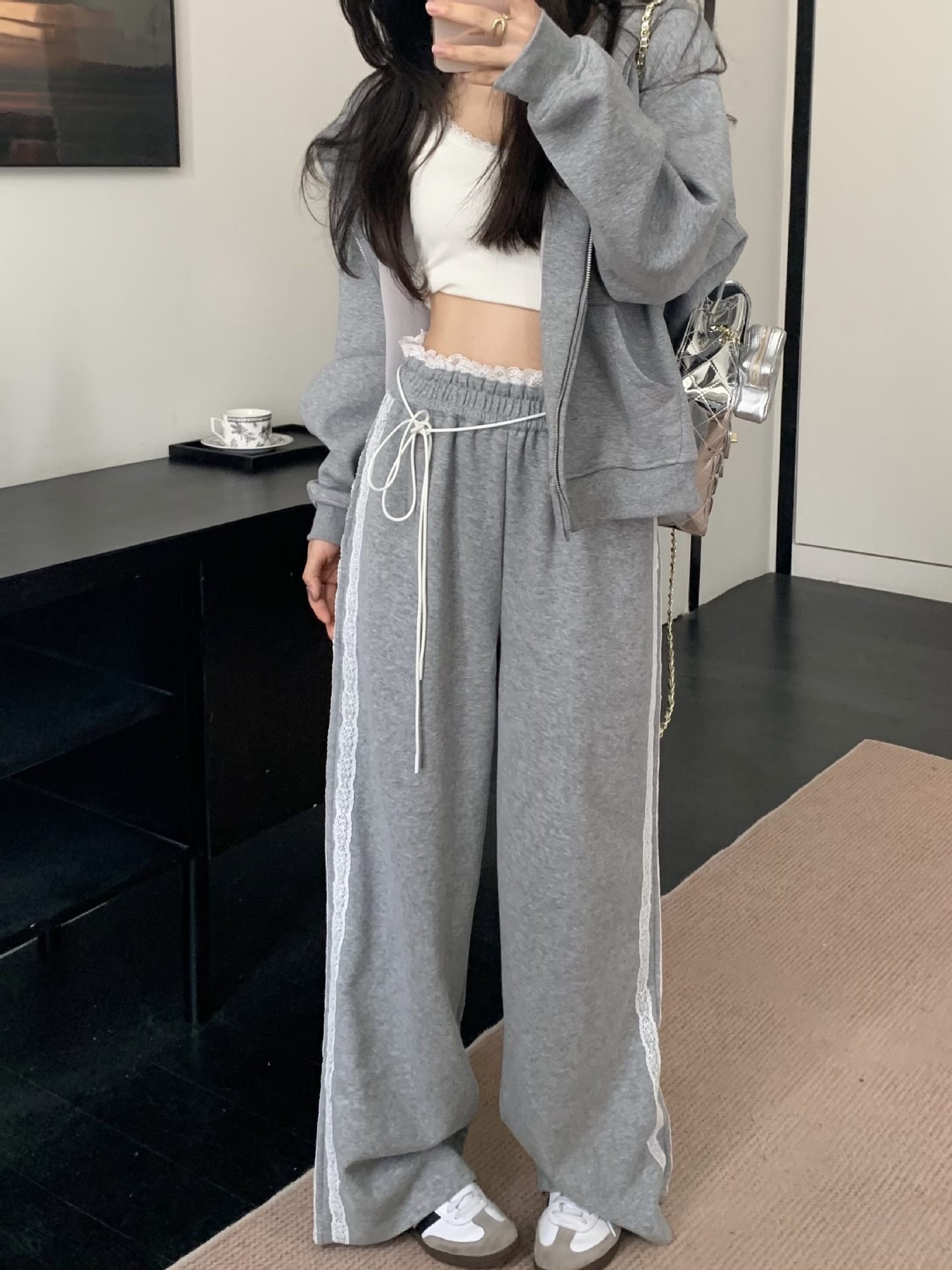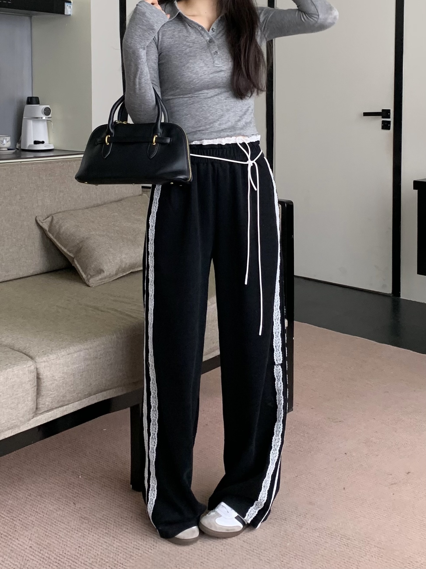 한국식 디자인 레이스 엣지 캐주얼 바지 여성 가을과 겨울 하이 웨이스트 헐렁한 스포츠 바지 드레이프 와이드 레그 팬츠 트렌디 한 바지