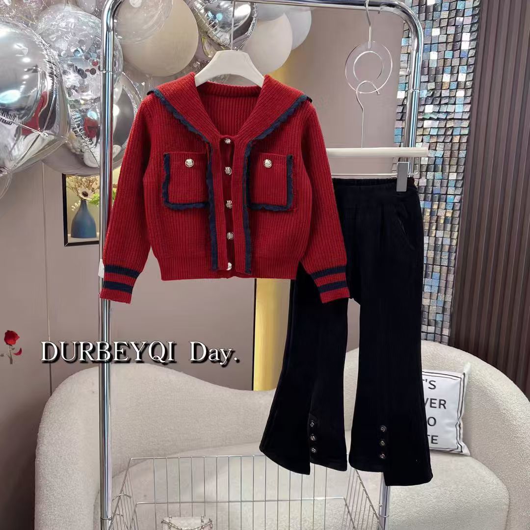 소녀의 가을과 겨울 붉은 세트 2024 새로운 스타일 어린이 컬러 니트 스웨터 기모 플래 팬츠 유행 투피스 세트