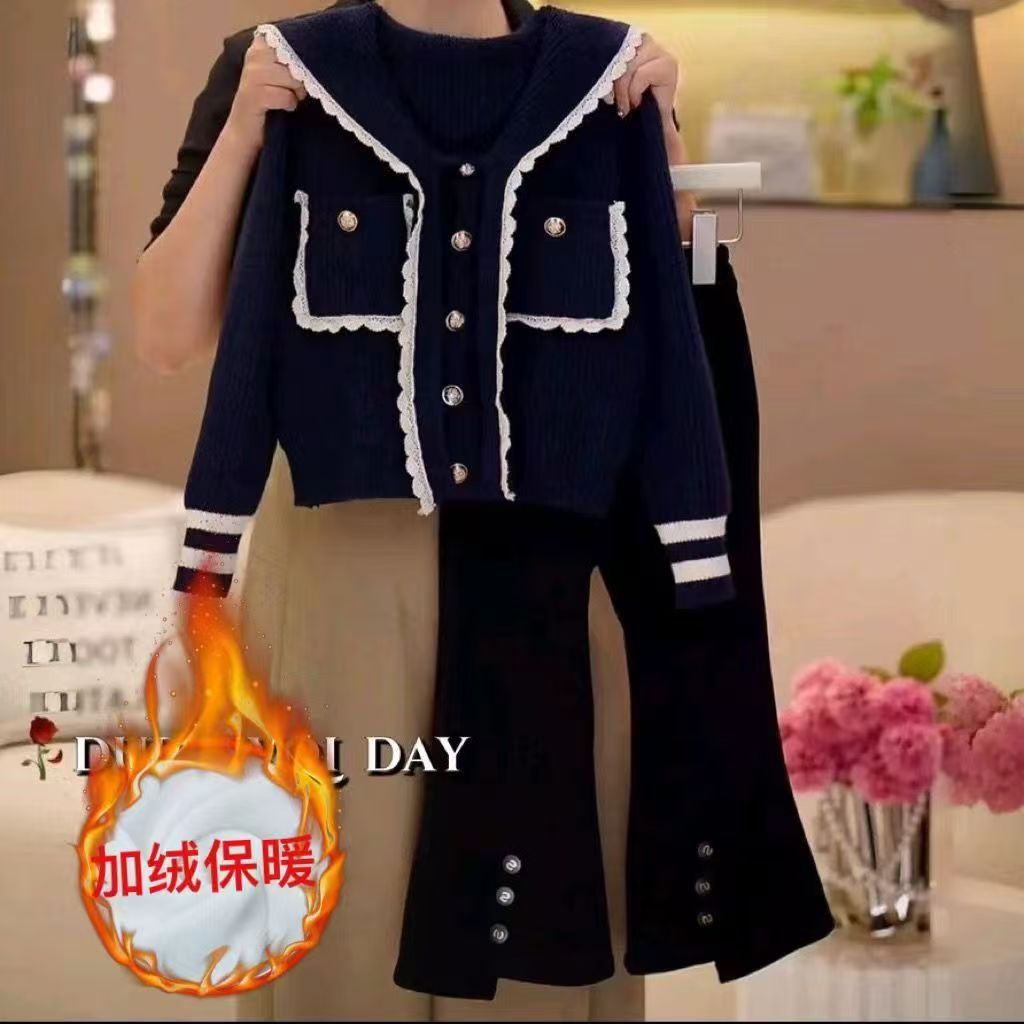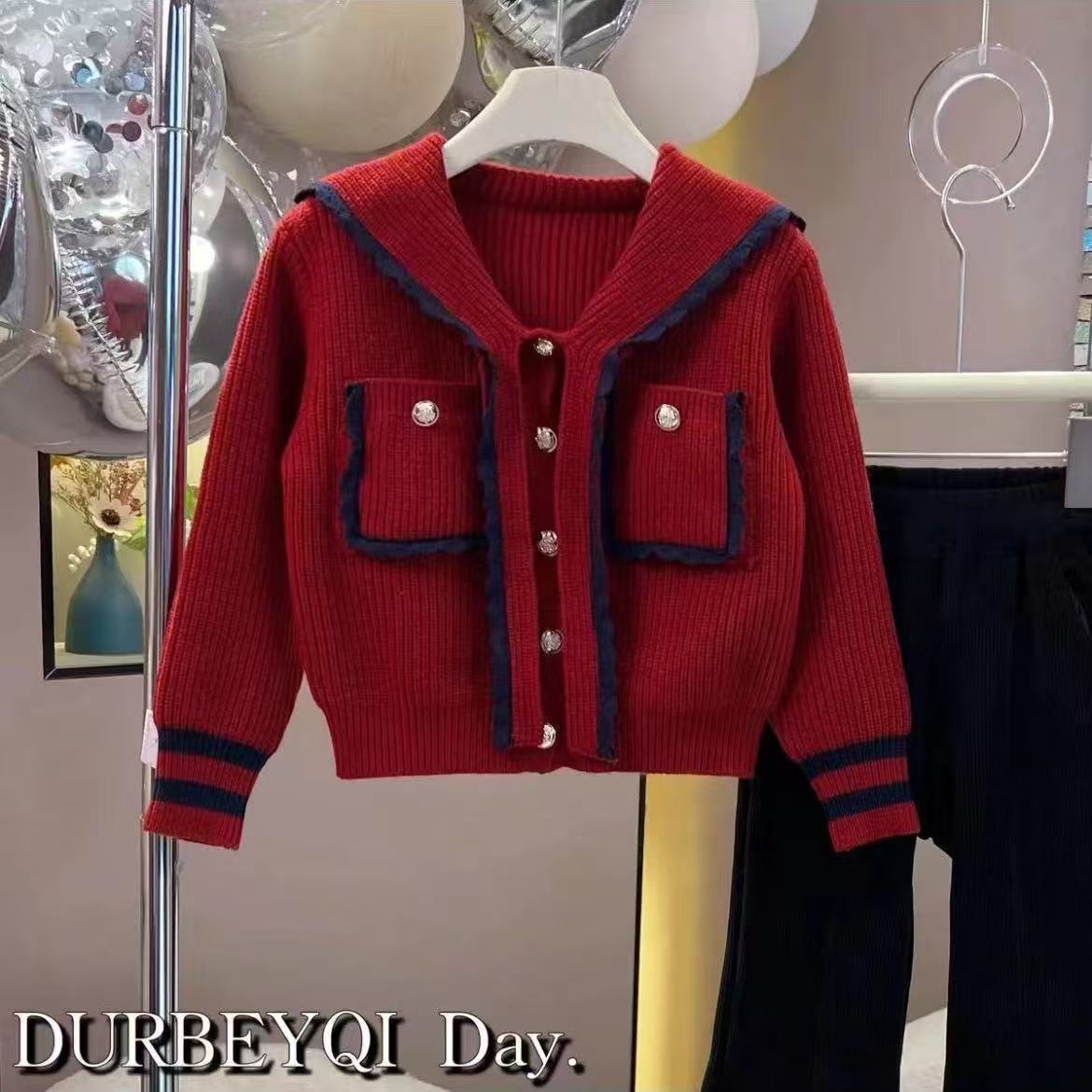소녀의 가을과 겨울 붉은 세트 2024 새로운 스타일 어린이 컬러 니트 스웨터 기모 플래 팬츠 유행 투피스 세트스토어 가기