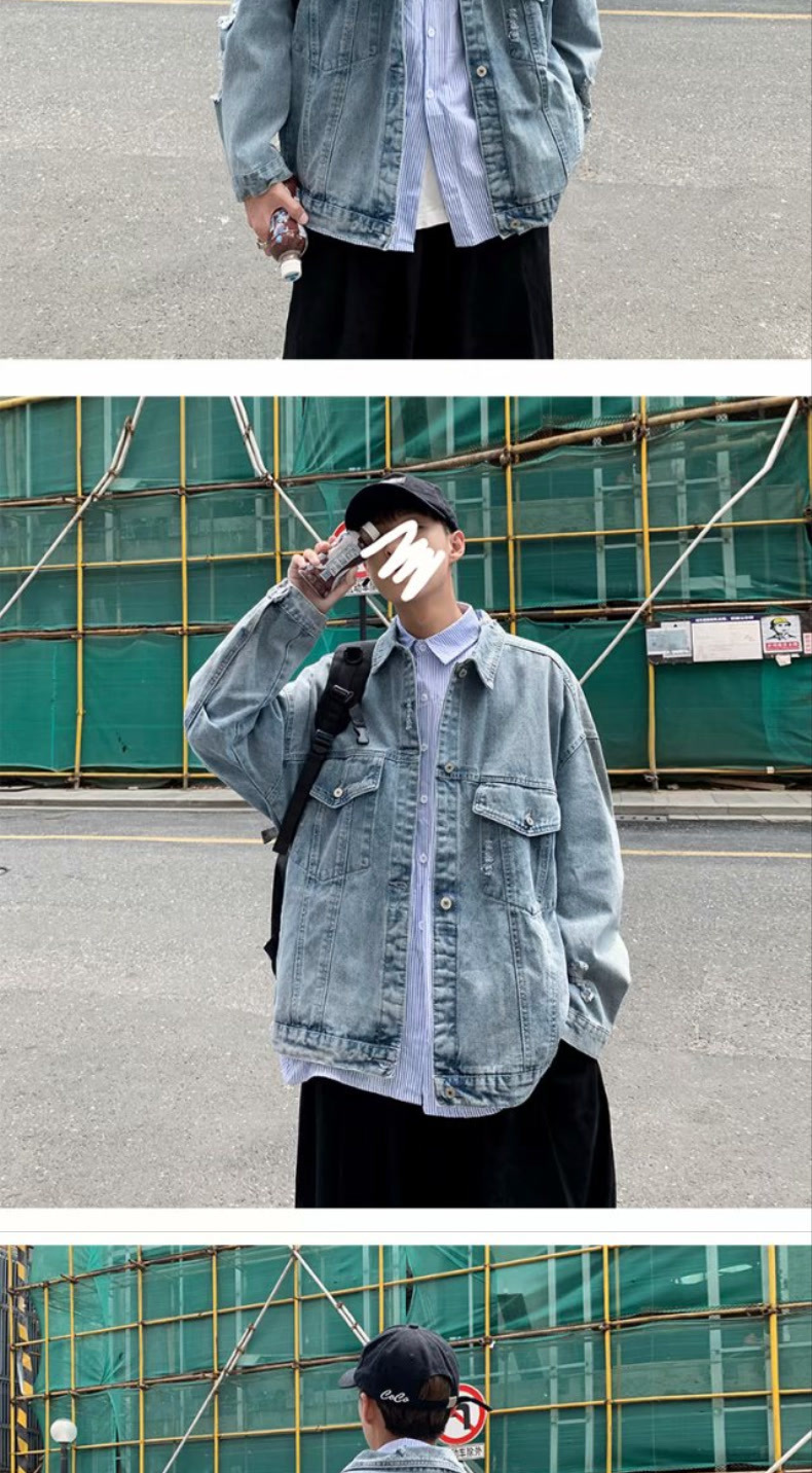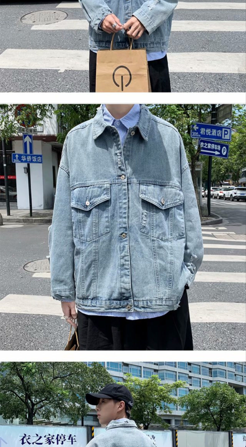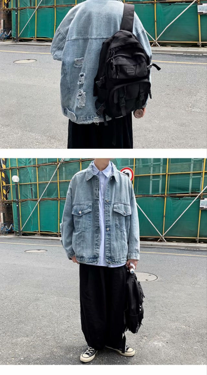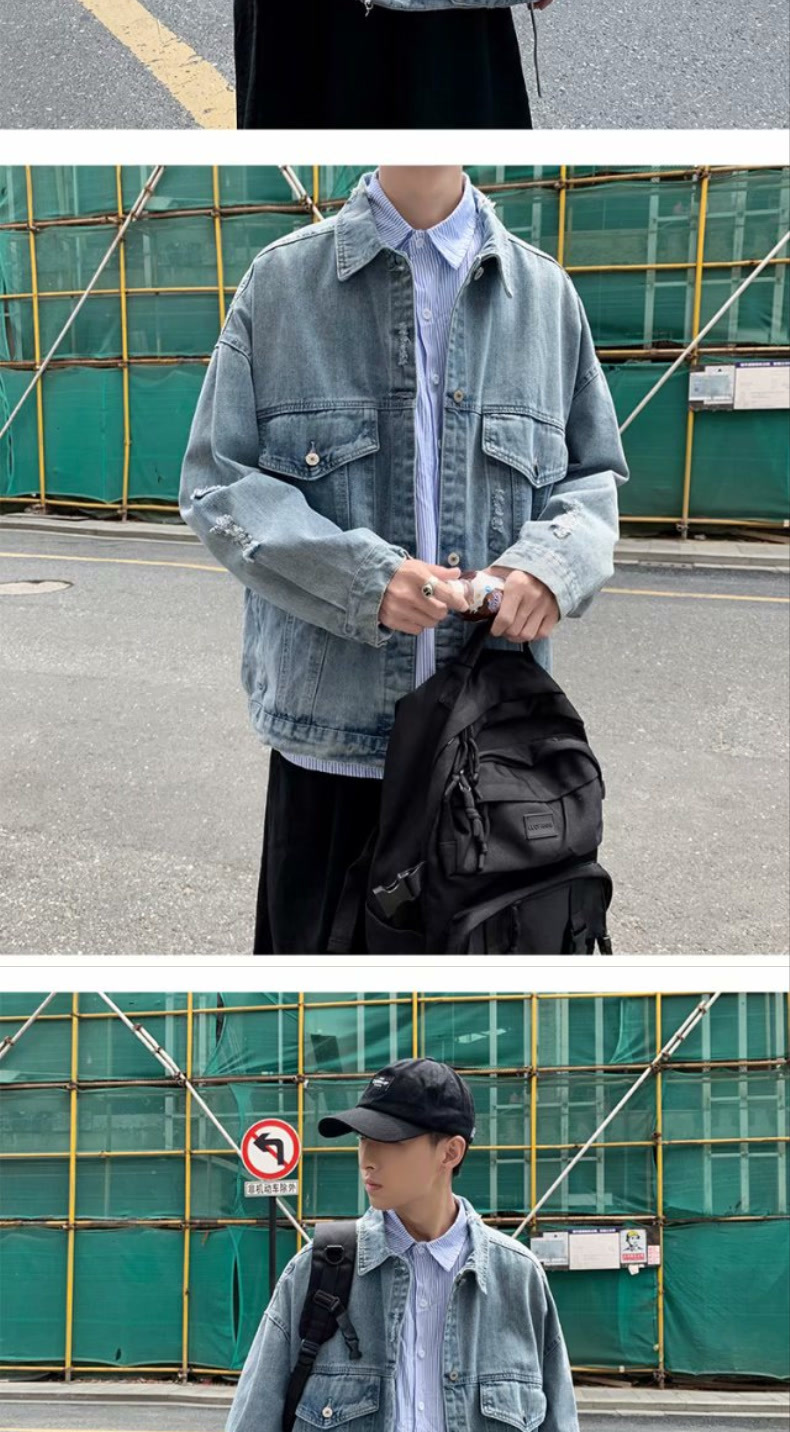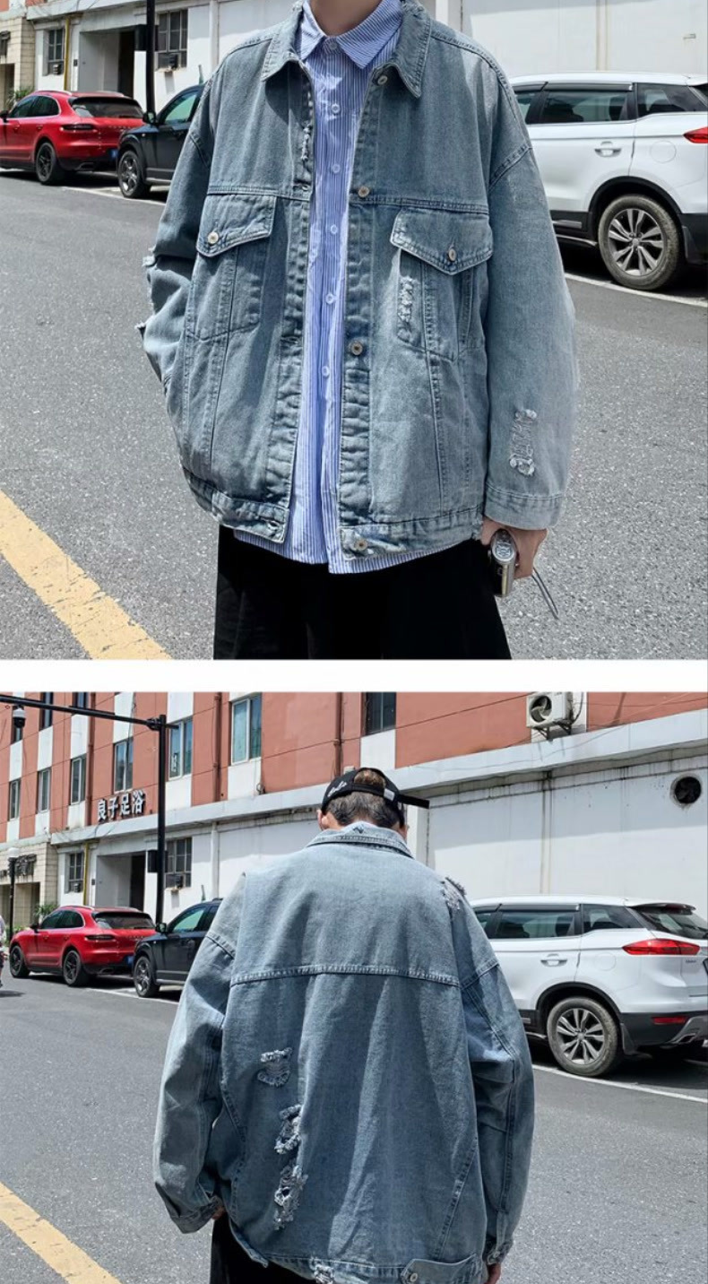 빈티지 Distressed 데님 재킷 남자 느슨한 홍콩 스타일 힙합 올 매치 데님 재킷 Instagram 인기 브랜드 봄과 가을 재킷