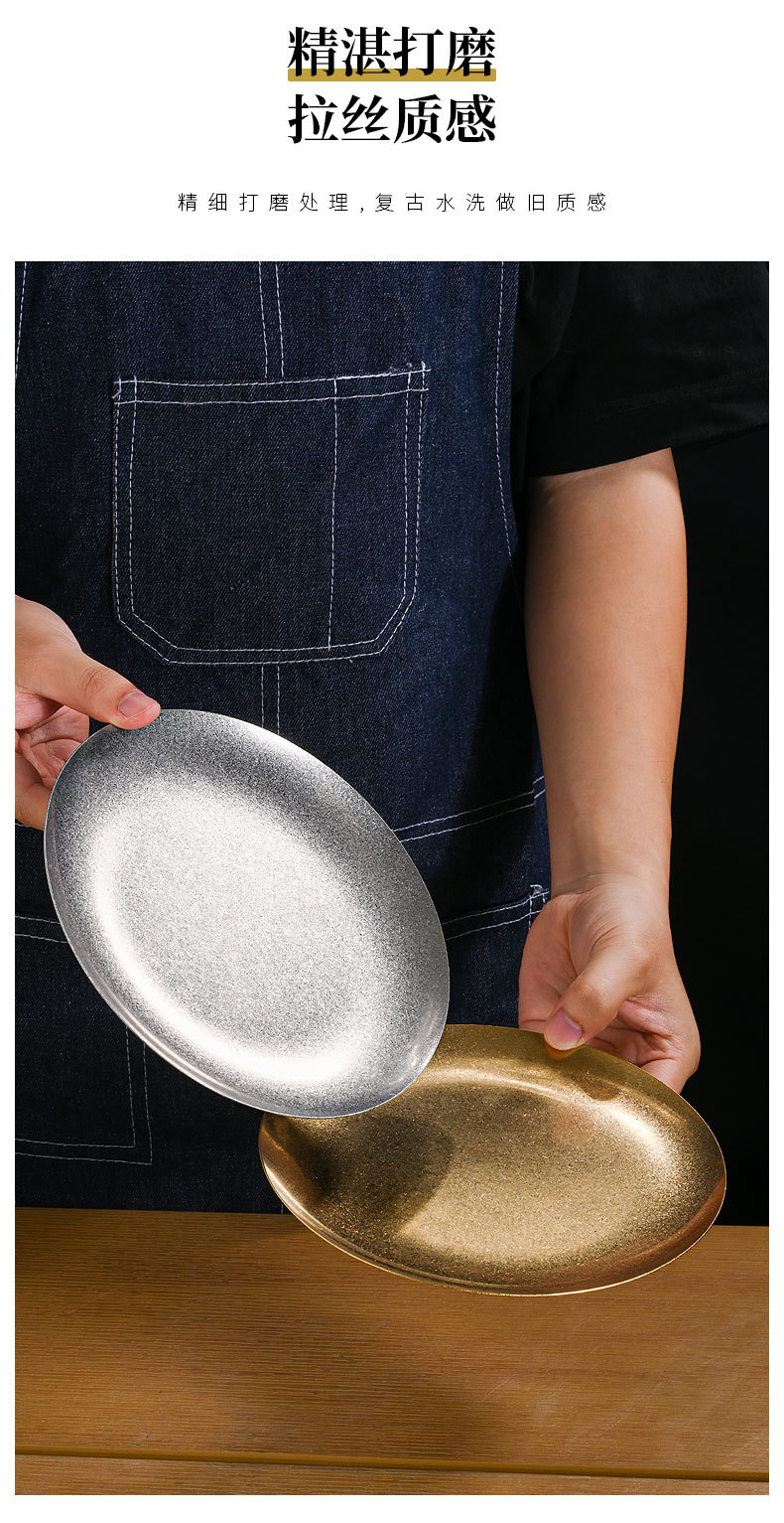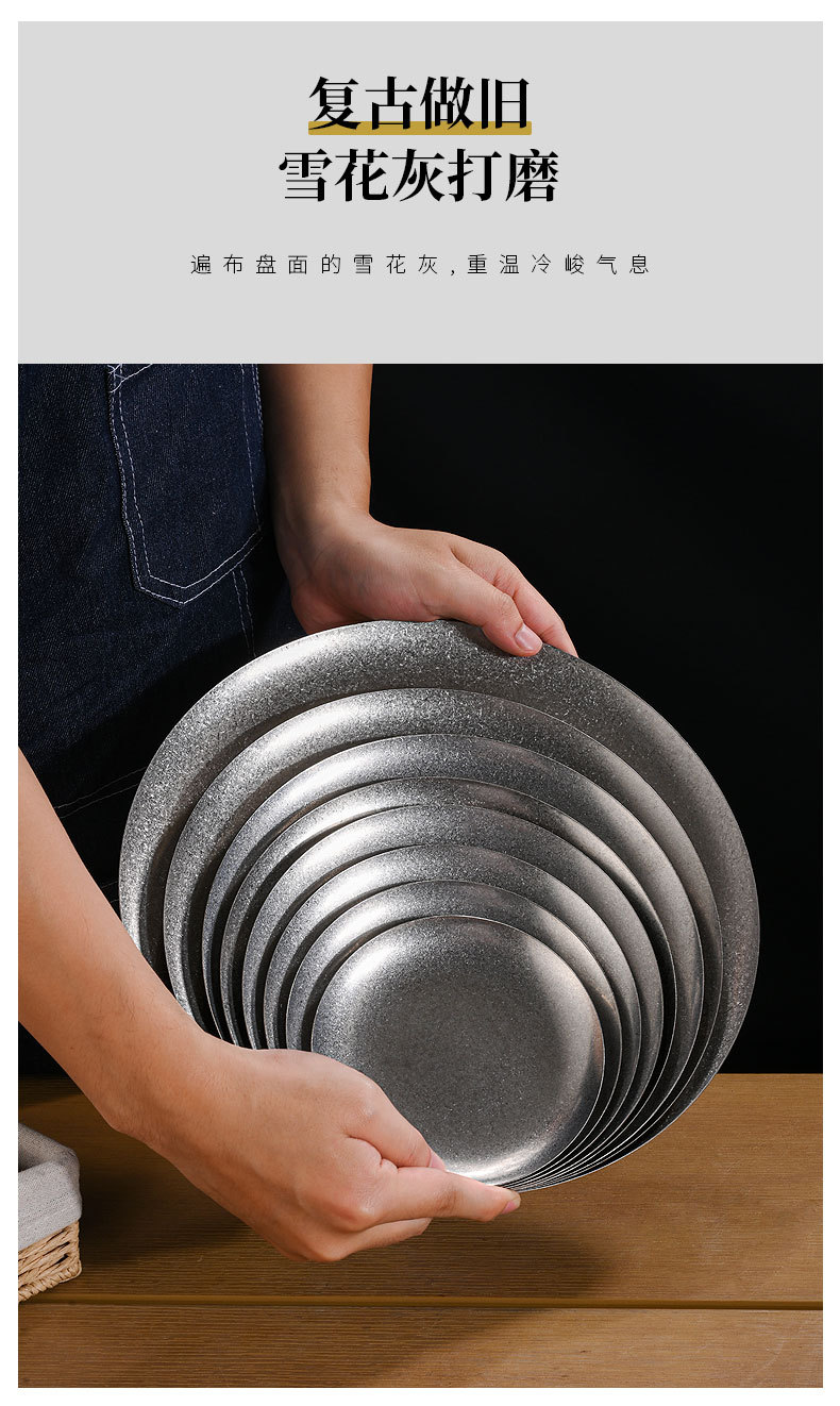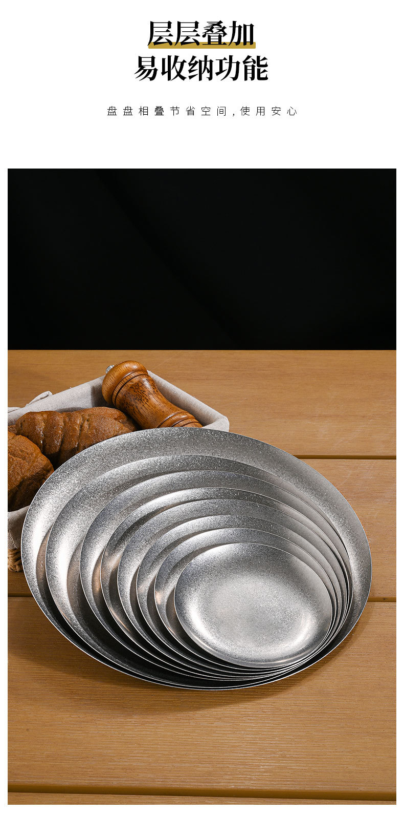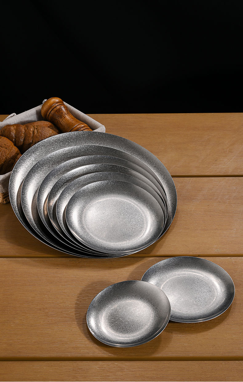 빈티지 스테인레스 스틸 디스크 오래 된 산업 스타일 얕은 플레이트 플랫 하단 바베큐 플레이트 뼈 플레이트 작은 플레이트 달콤한 플레이트 케이크 플레이트스토어 가기