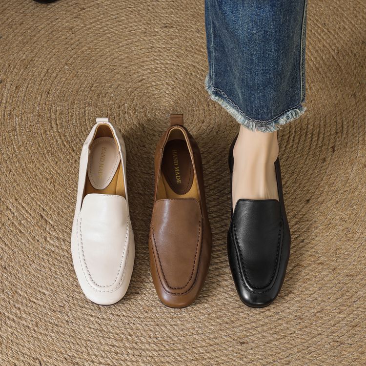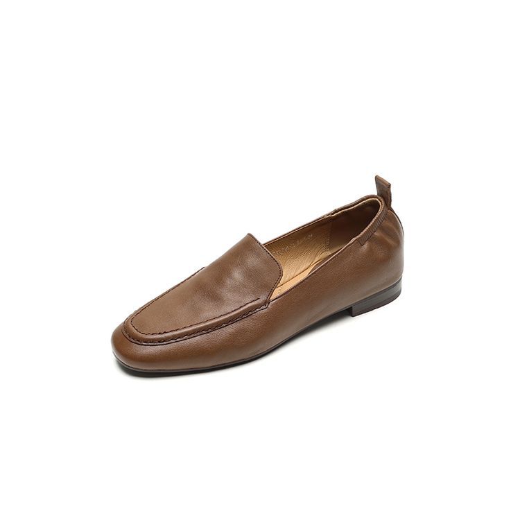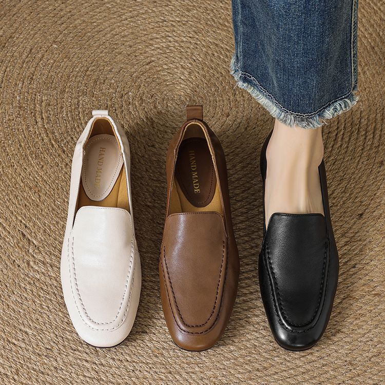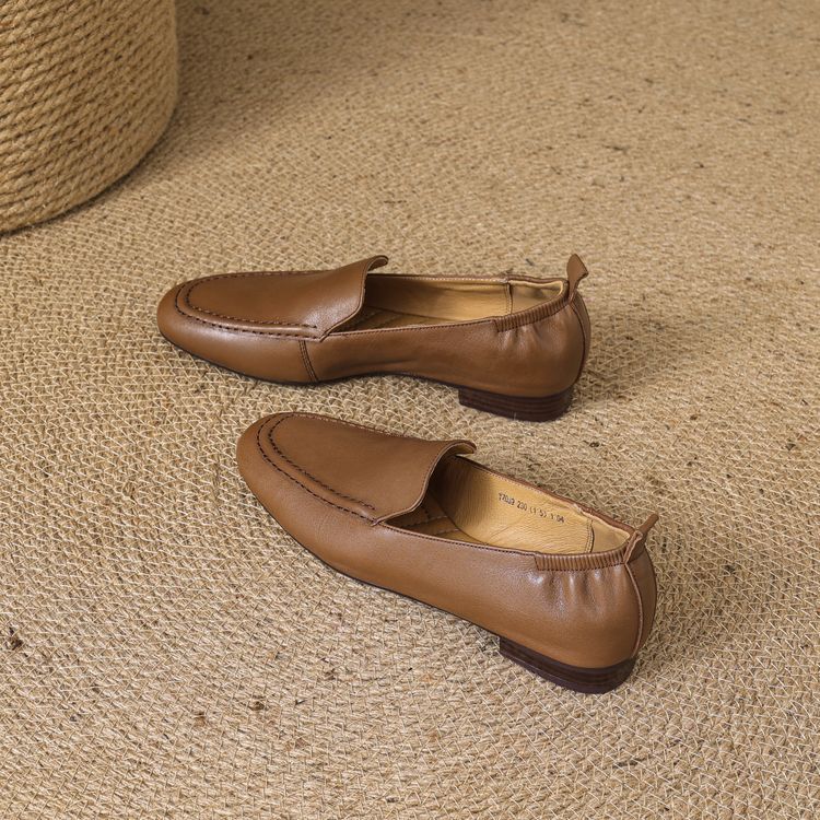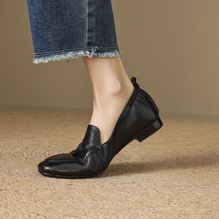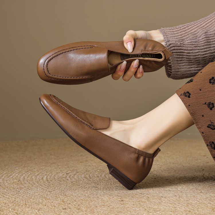 새로운 Cowhide Loafers 여성용 둥근 발가락 편안한 깊은 입 싱글 레이어 신발 세트 피트 크기 플랫 힐 로우 힐 신발 풀 가죽스토어 가기
