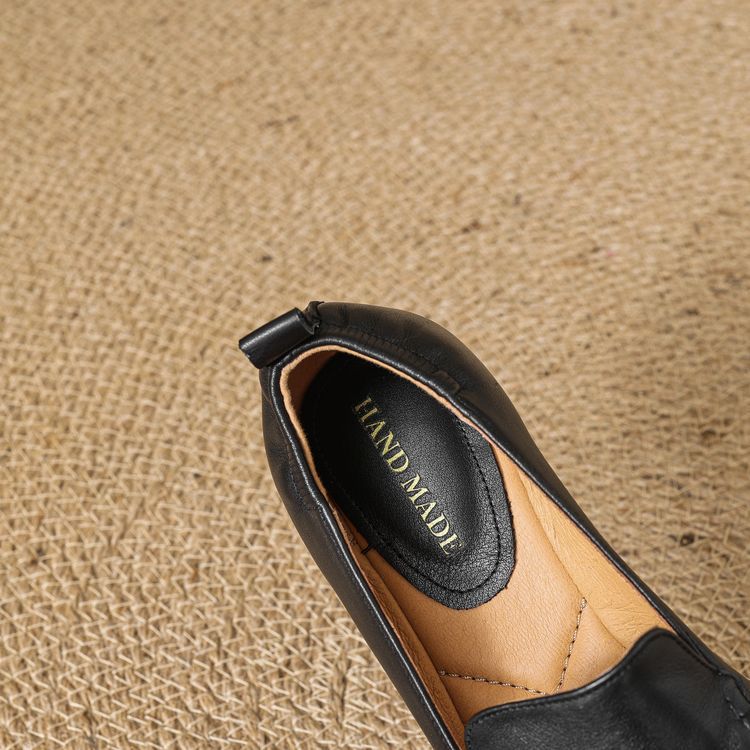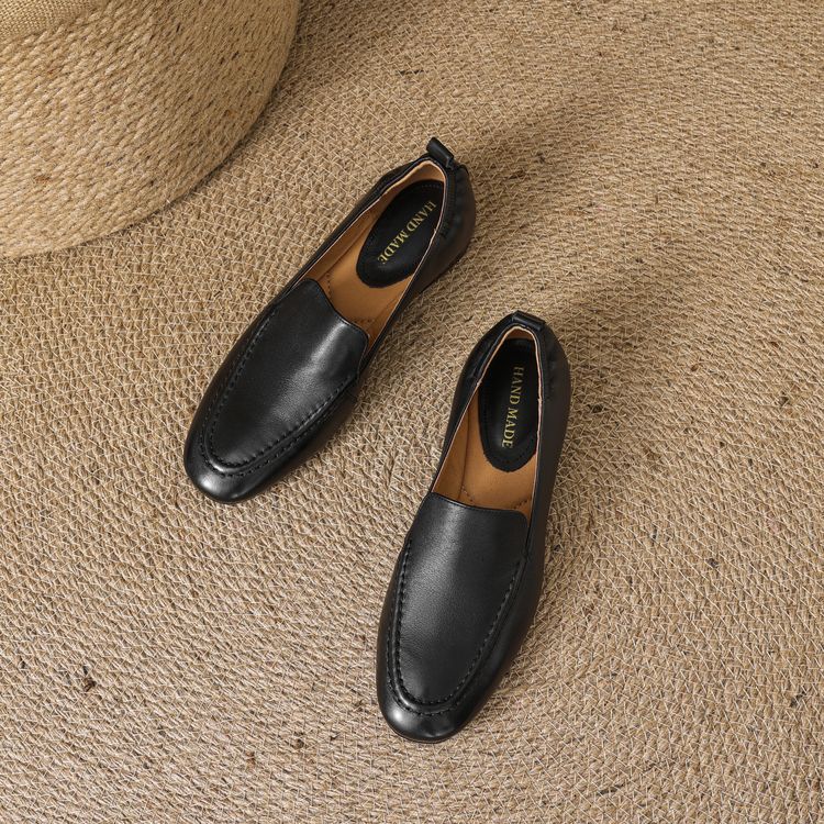 새로운 Cowhide Loafers 여성용 둥근 발가락 편안한 깊은 입 싱글 레이어 신발 세트 피트 크기 플랫 힐 로우 힐 신발 풀 가죽