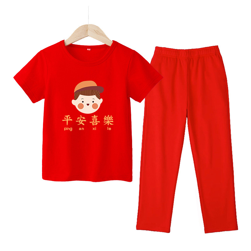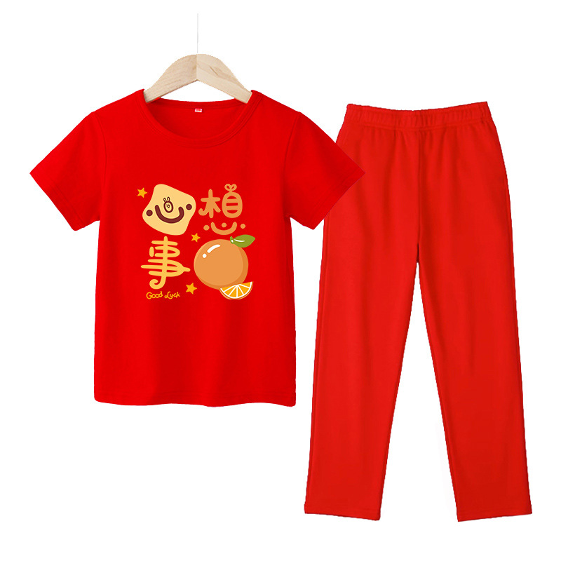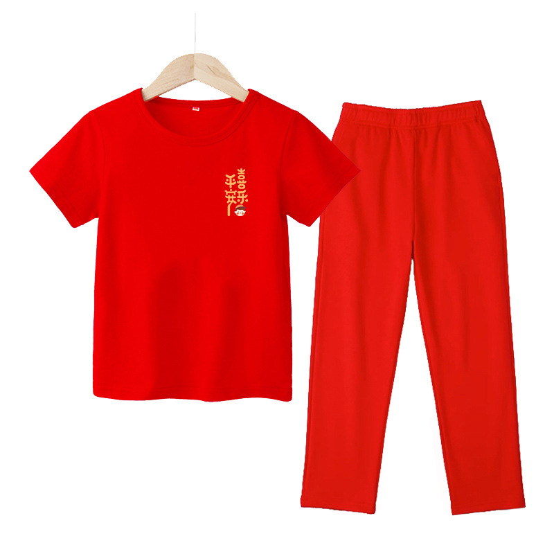 2026년 말년 신년 의류 어린이 가정복 순면 남아용 빨간색 반팔 바지 세트 여아용스토어 가기