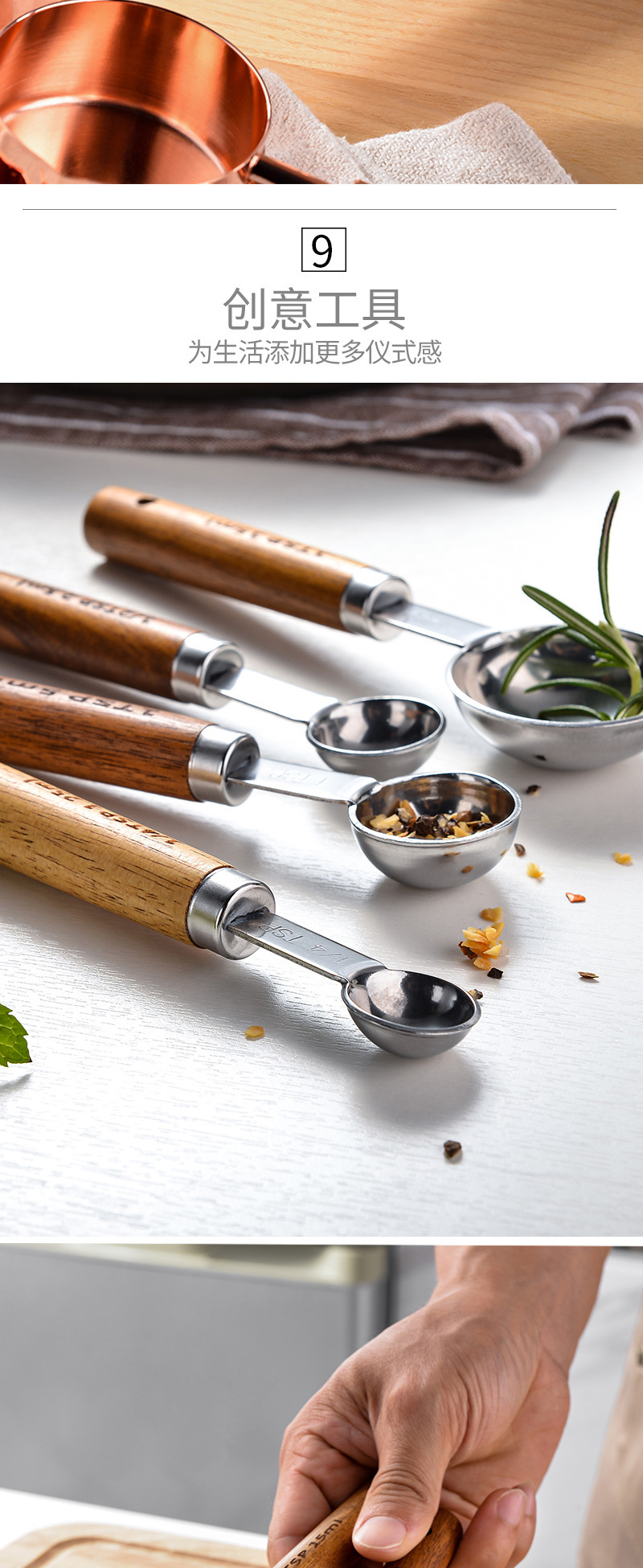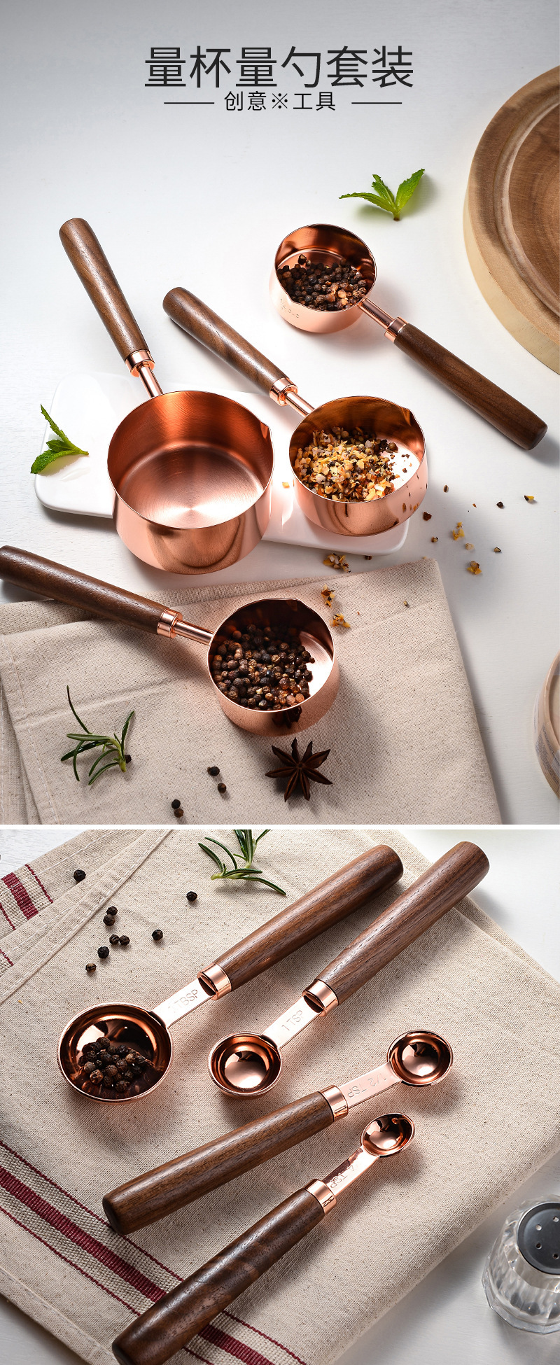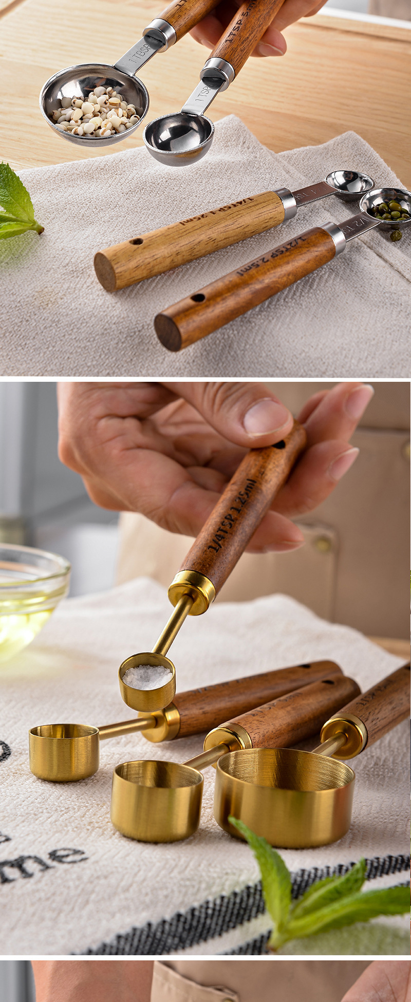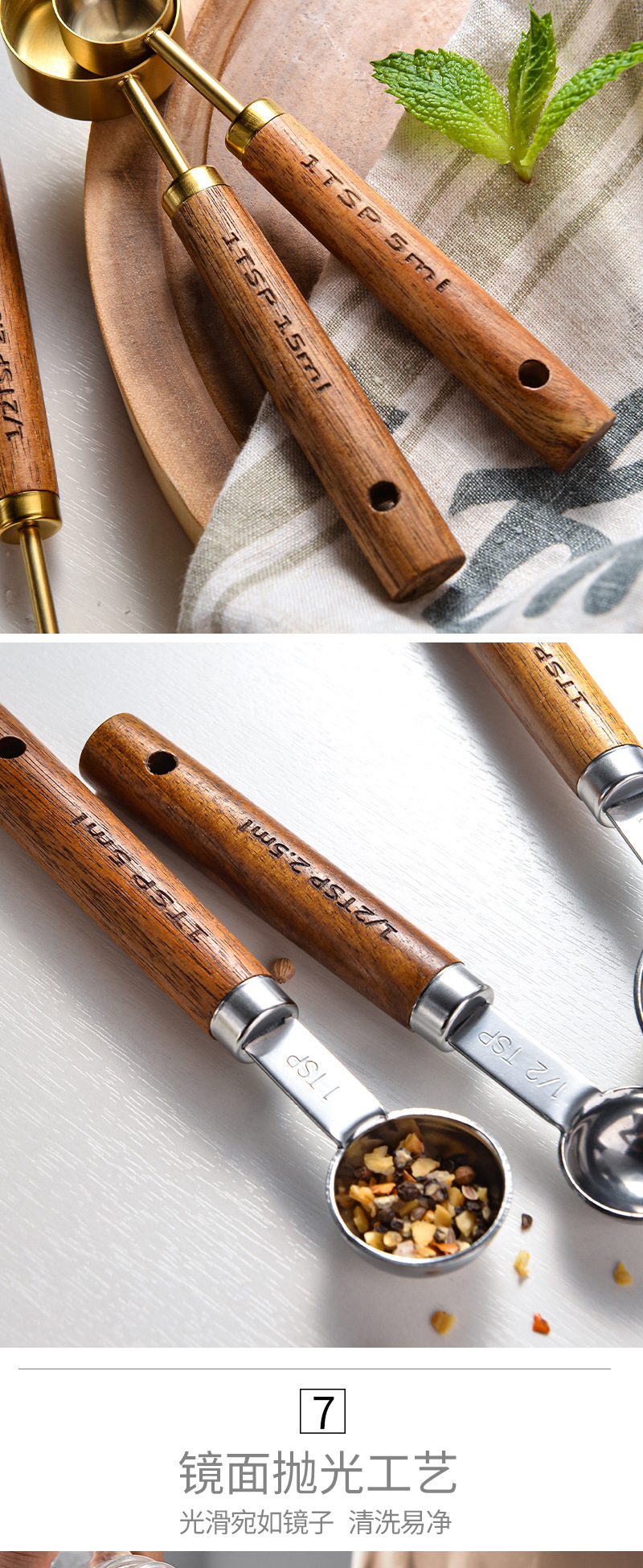 금도금 스테인레스 스틸 측정 컵 측정 숟가락 아카시아 나무 손잡이 측정 숟가락 측정 도구 8 피스 주방 베이킹 도구 세트스토어 가기