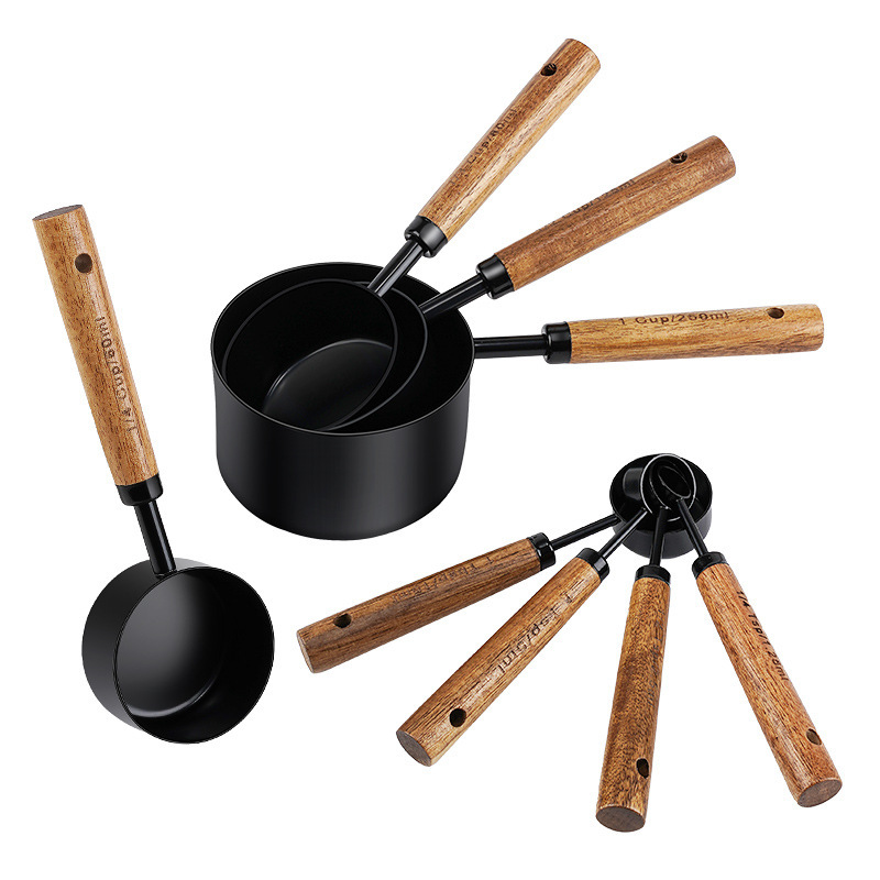 • 아카시아나무 손잡이 계량컵 계량스푼 8종세트(블랙)