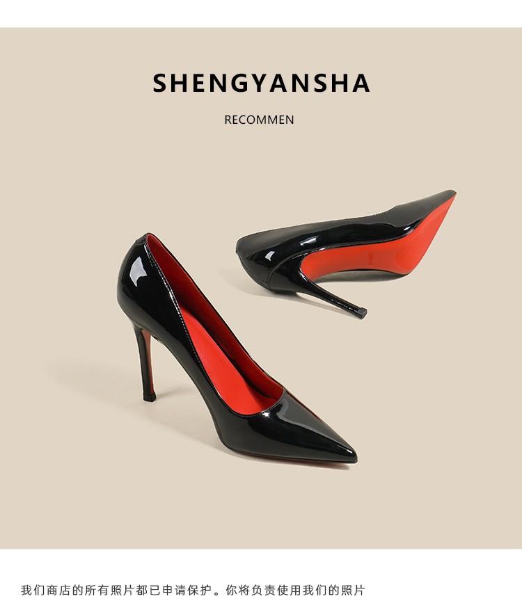 블랙 레드 솔 하이힐 여성 2023 봄 새 뾰족한 스틸레토 섹시한 우울한 우아한 싱글 슈즈 특허 가죽 여성 신발스토어 가기