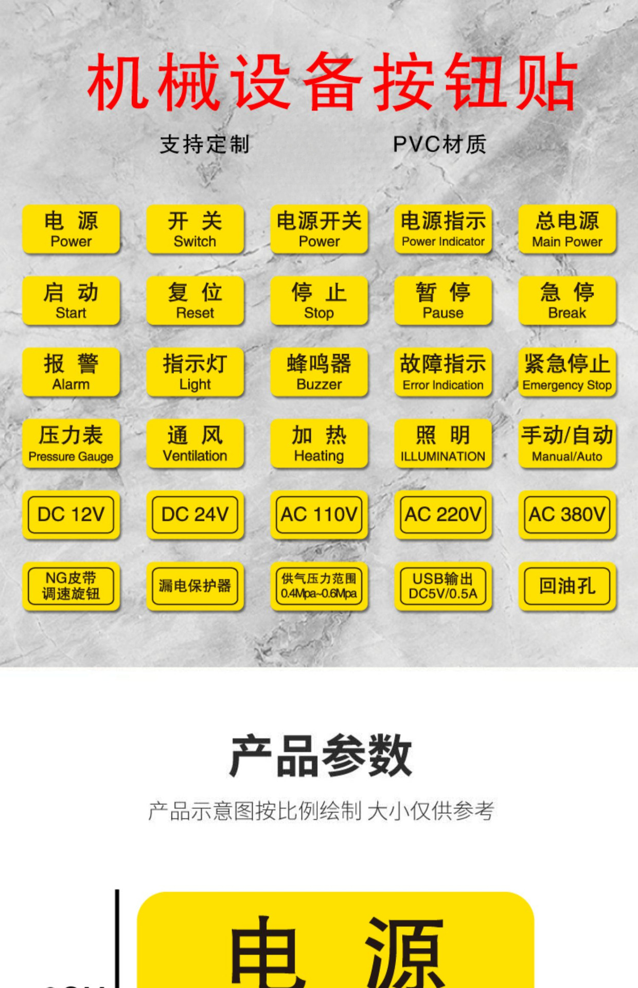 기계 장비 버튼 라벨 방수 접착 PVC 스티커 전원 스위치 재설정 정지 신호 비상