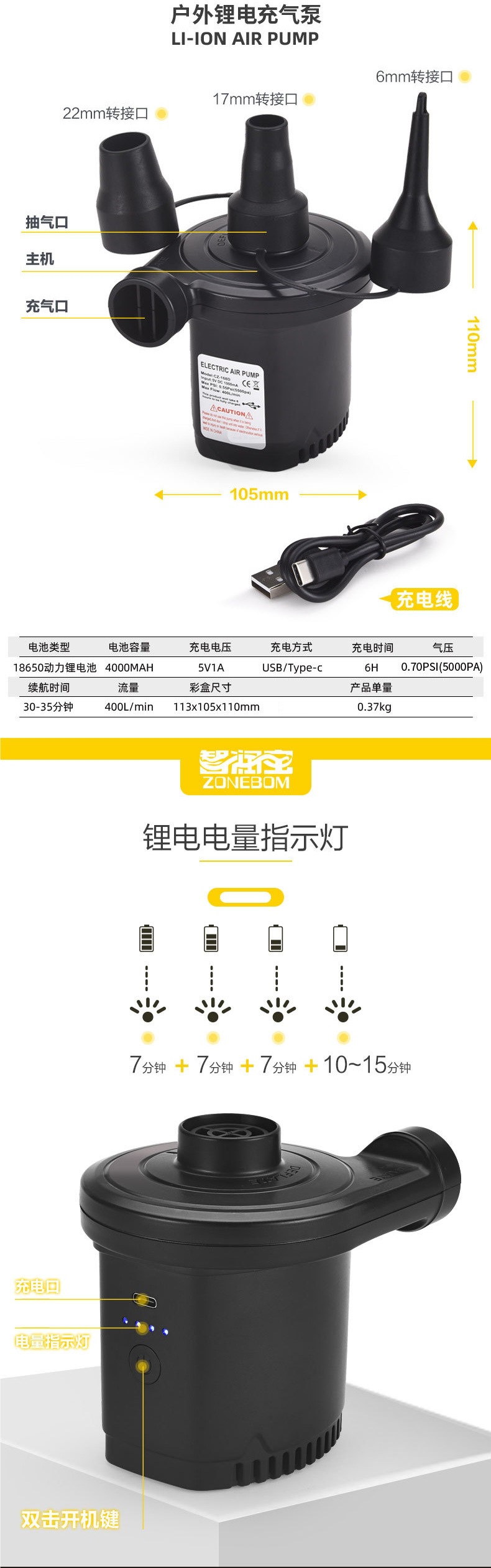 • 리튬 배터리 모델 4000mA + 고무 보트 밸브, 약 13개의 더블 침대 충전