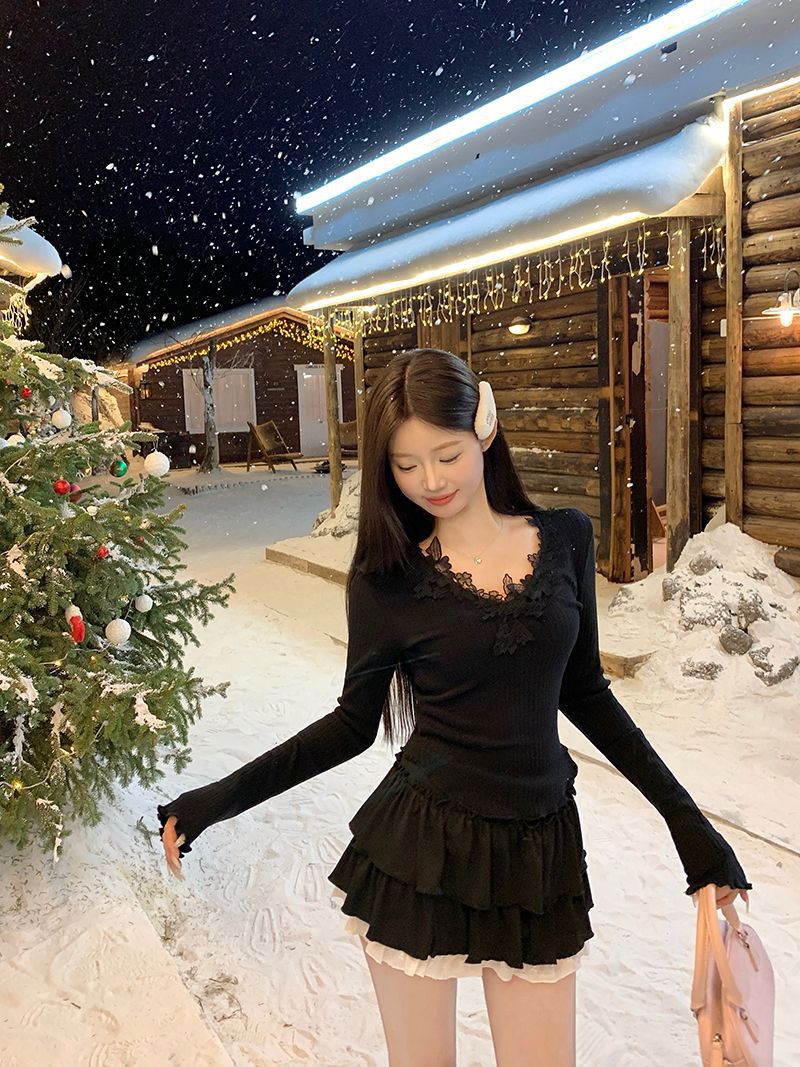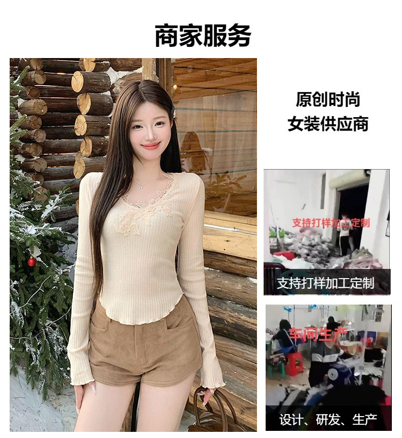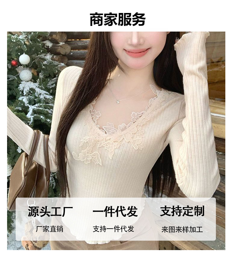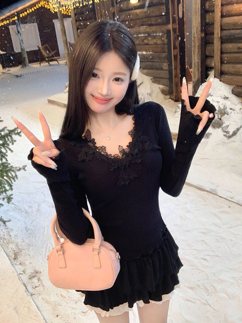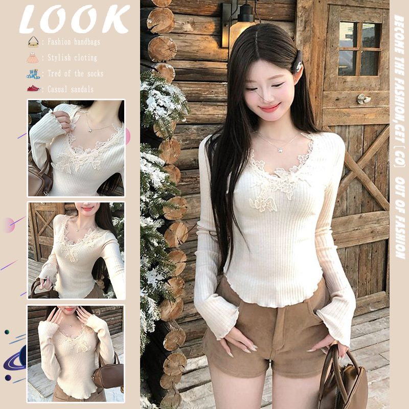 순수한 긴 소매 니트 바닥 셔츠 여성의 2024 가을과 겨울 달콤한 매운 레이스 스웨터 독특한 아름다운 탑을 살구색 싶다스토어 가기