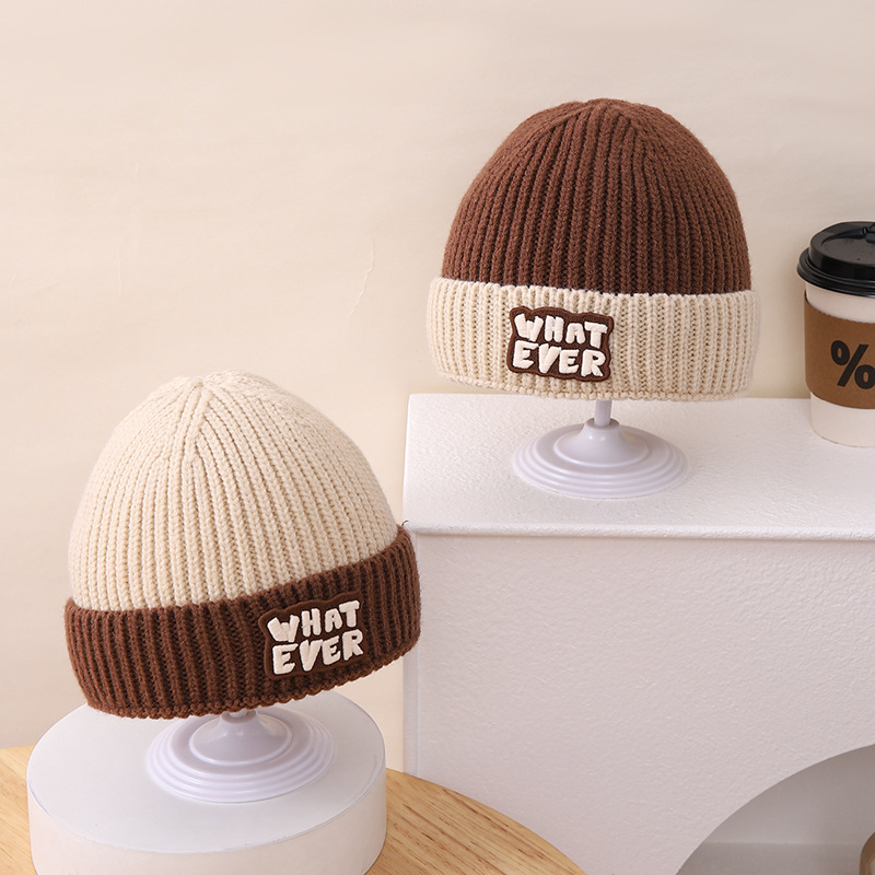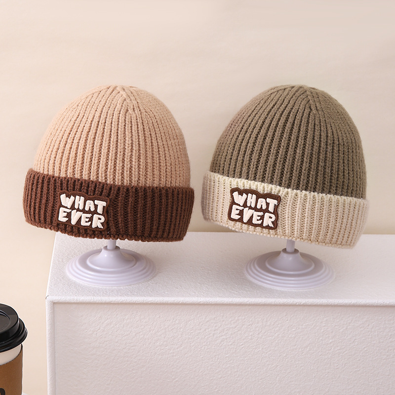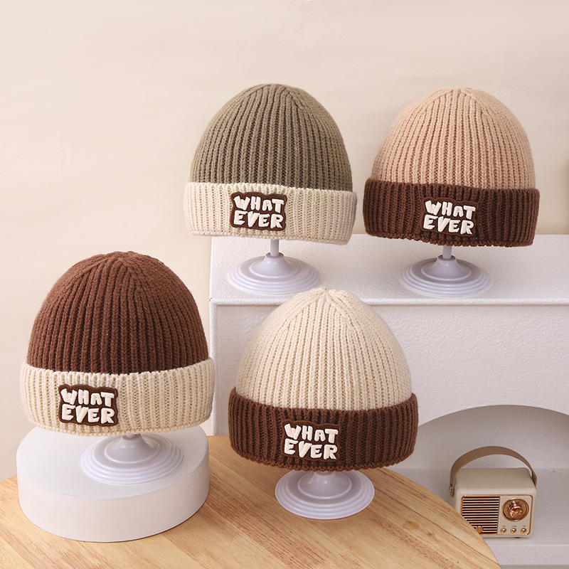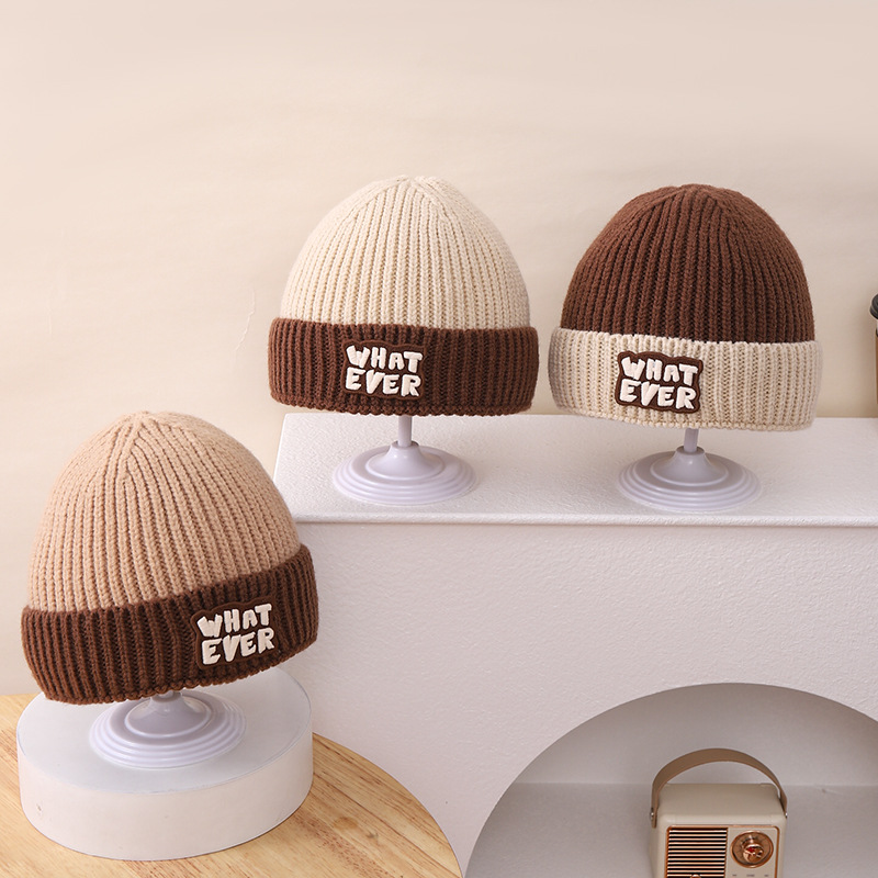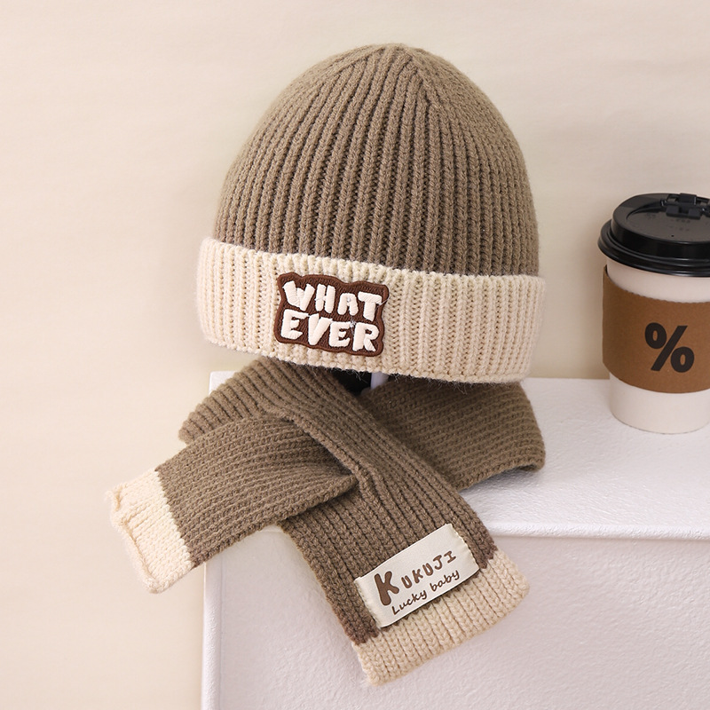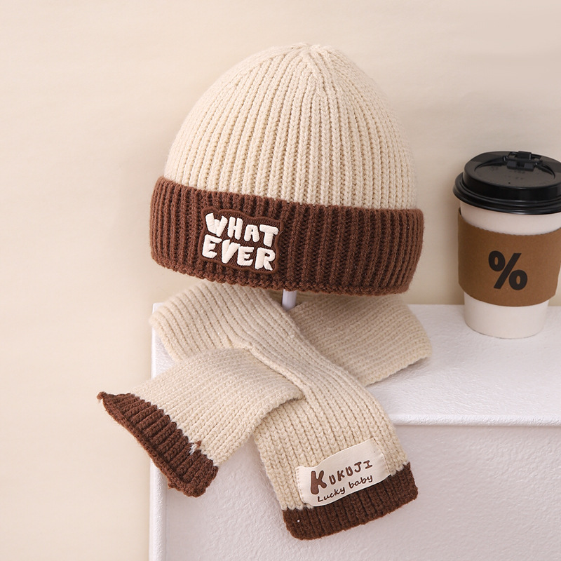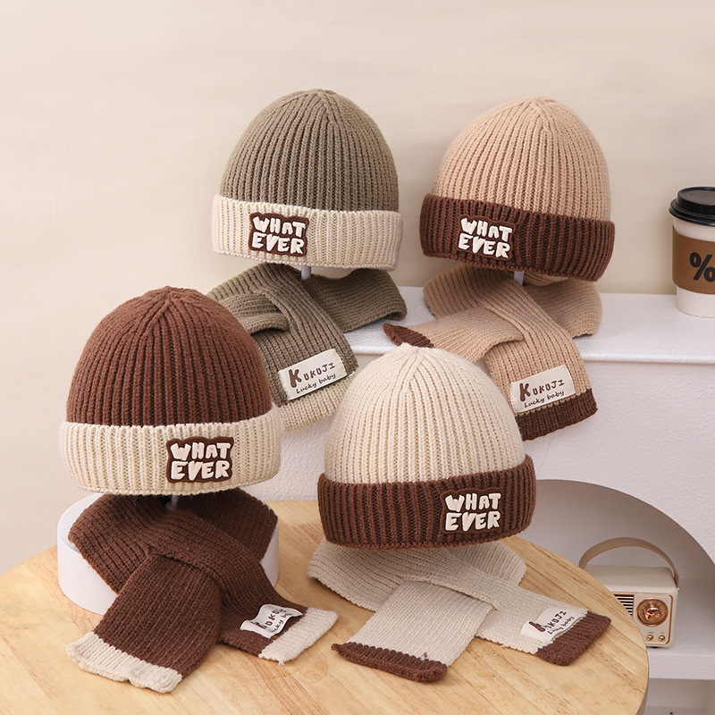 영어 편지 가죽 라벨 한국식 아기 니트 모자 풀오버 캡 올 매치 패션 귀여운 같은 색 스카프 모자 세트스토어 가기