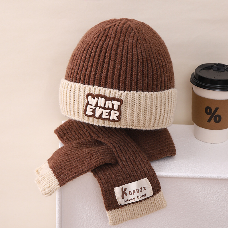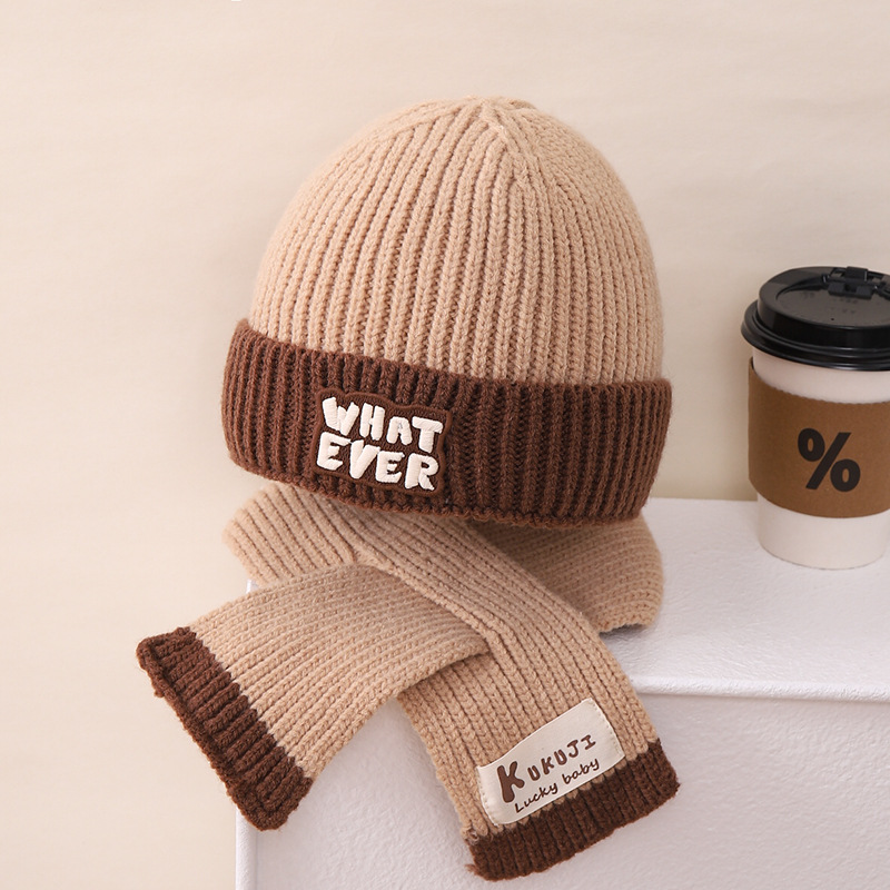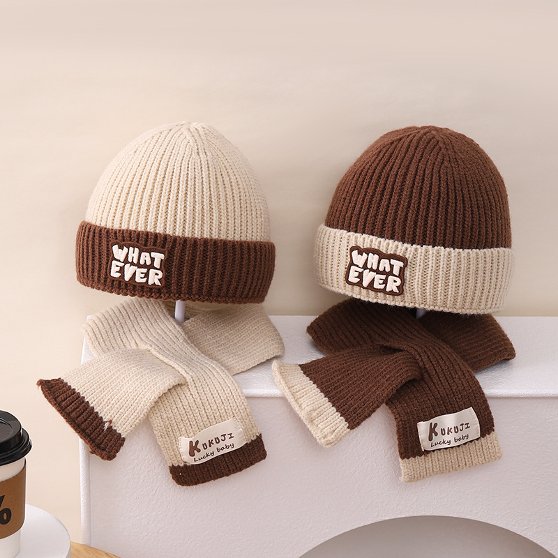 영어 편지 가죽 라벨 한국식 아기 니트 모자 풀오버 캡 올 매치 패션 귀여운 같은 색 스카프 모자 세트