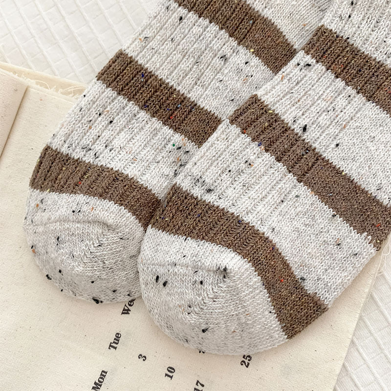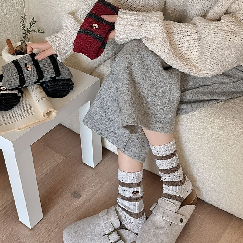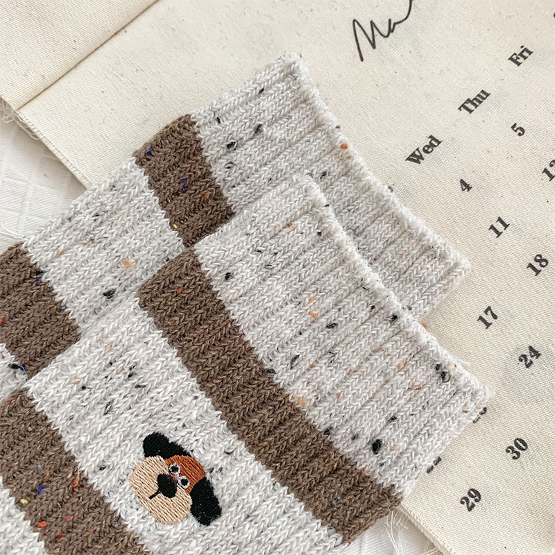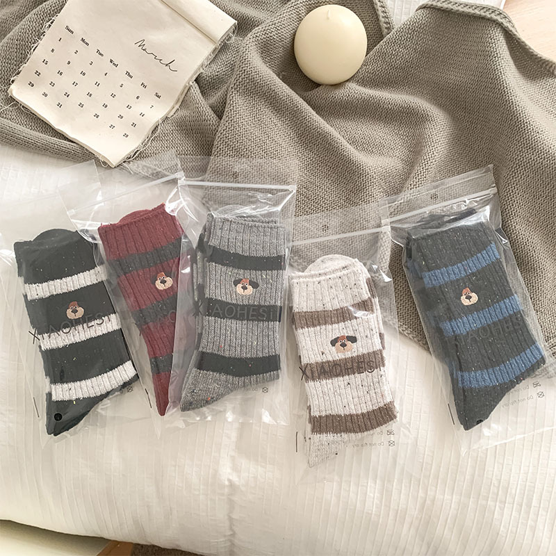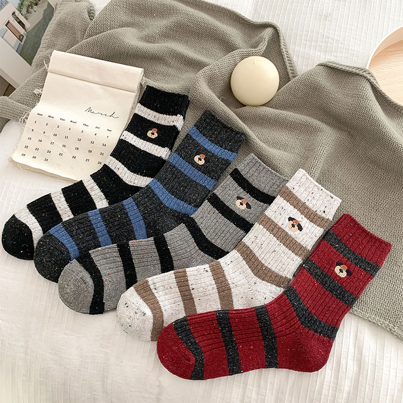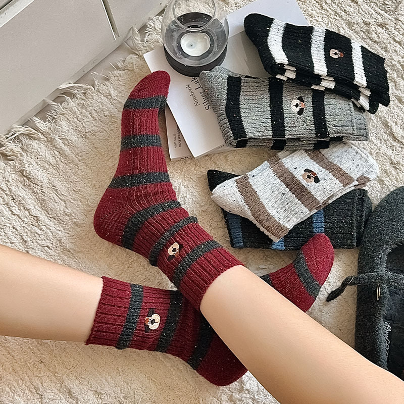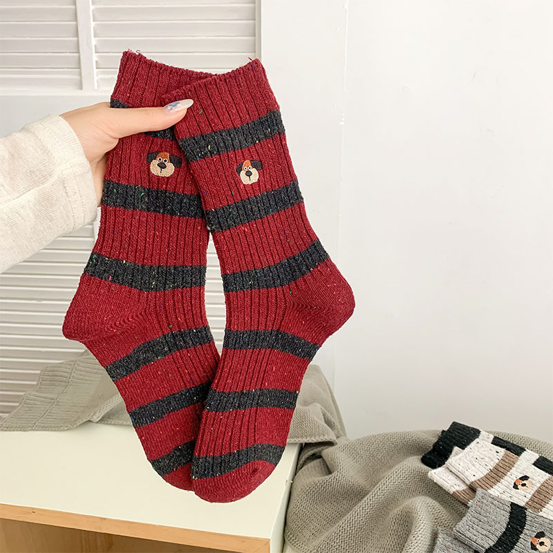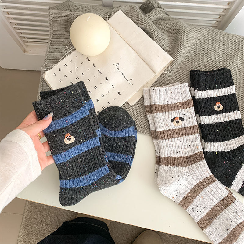 도트 원사 줄무늬 양말 어린이 Ins 가을과 겨울 두꺼운 따뜻한 일본 스타일 만화 강아지 자수 양모