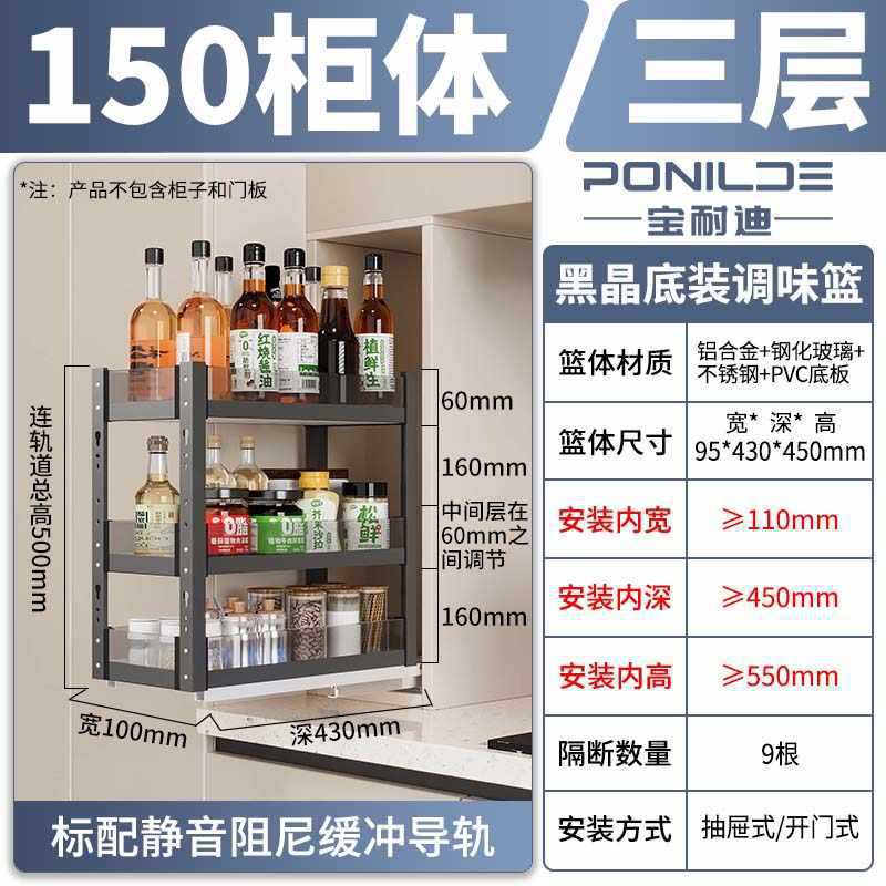 • 43 깊이 - [3단] 블랙 크리스탈 150 캐비닛 바닥 조미료 바구니 [하단 트랙 고정]