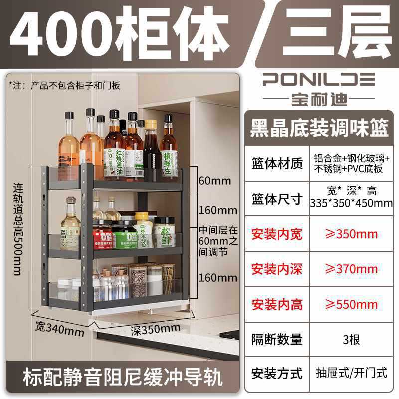 • 깊이 35 - [3단] 블랙 크리스탈 400 캐비닛 바닥 조미료 바구니 [하단 트랙 고정]