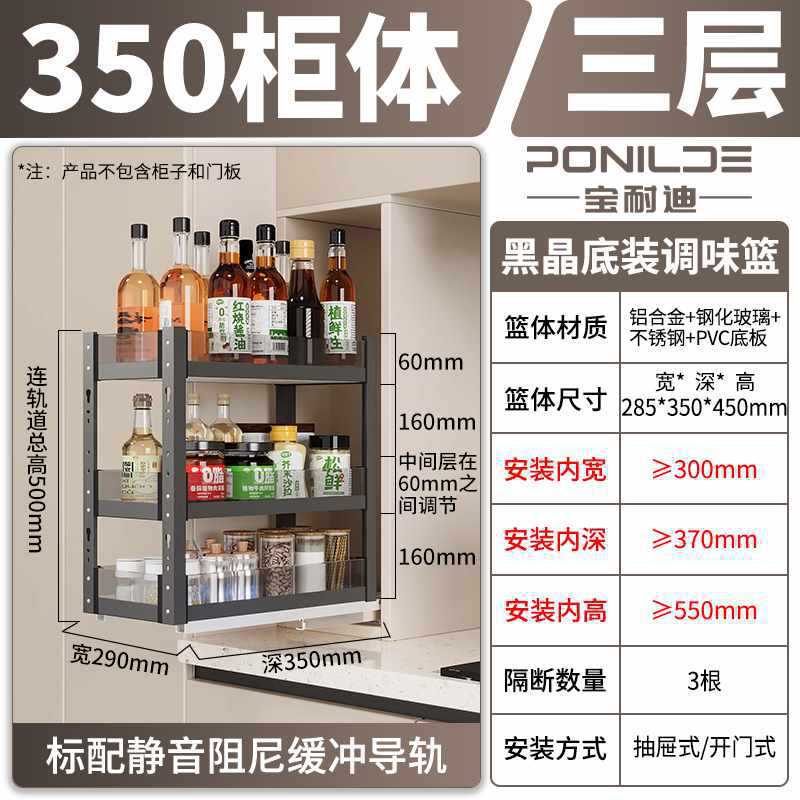 • 깊이 35 - [3단] 블랙 크리스탈 350 캐비닛 바닥 조미료 바구니 [하단 트랙 고정]
