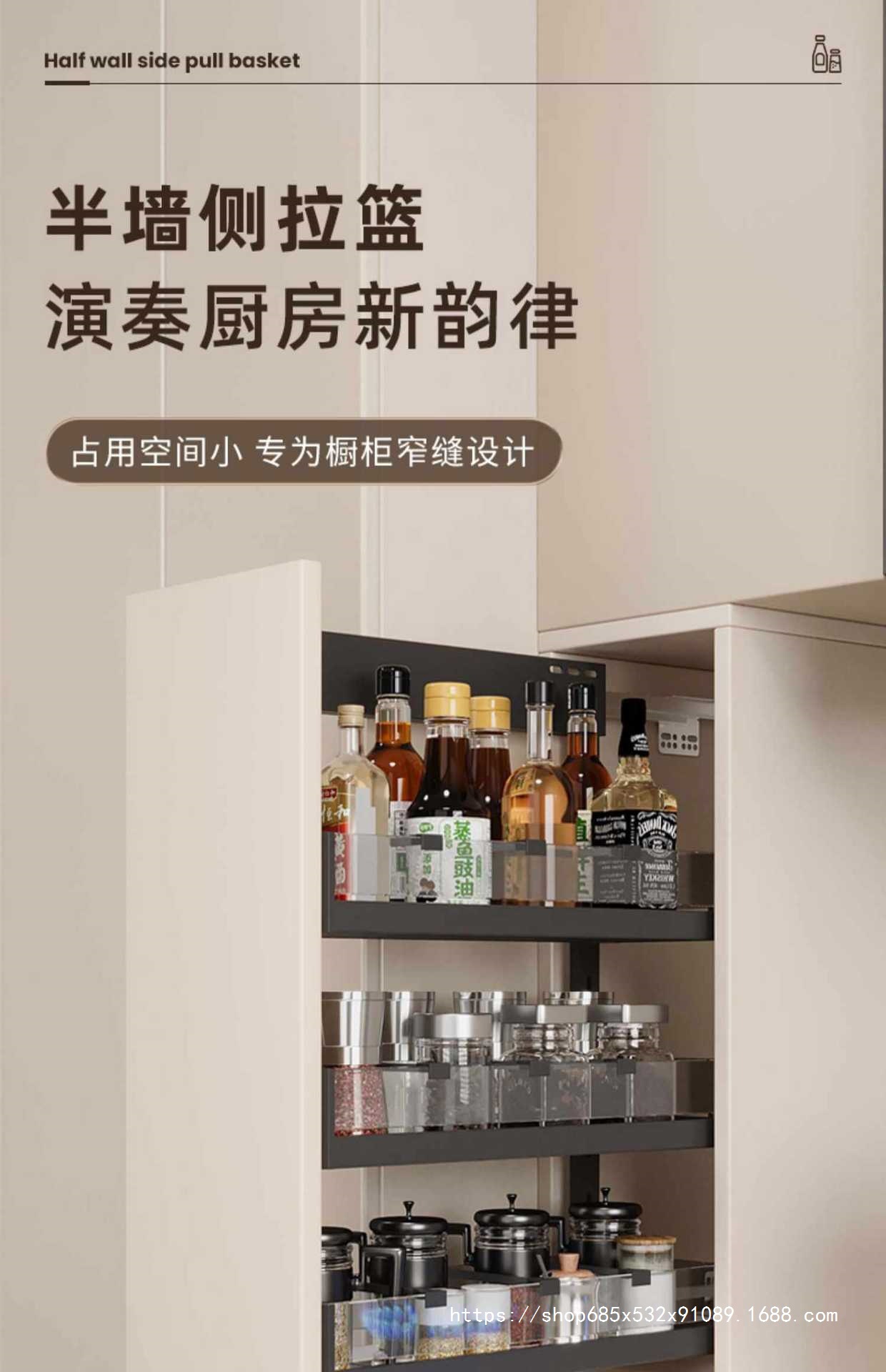 캐비닛 측면 당김 양념 랙 수축 카운터 표면 바구니 주방 낮은 바구니 양념 바구니 매우 좁은 풀 캐비닛 저장 랙
