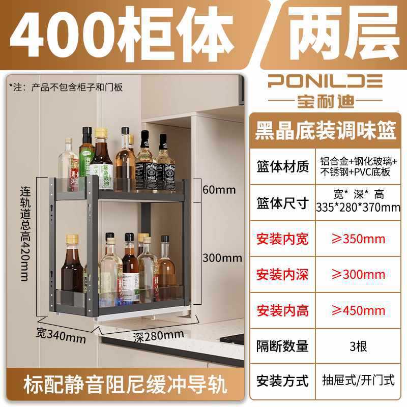 • 깊이 35 - [2단] 블랙 크리스탈 400 캐비닛 바닥 조미료 바구니 [하단 트랙 고정]