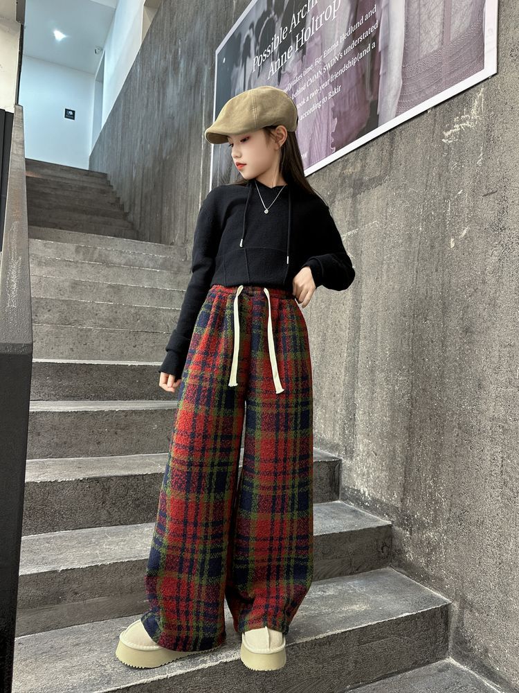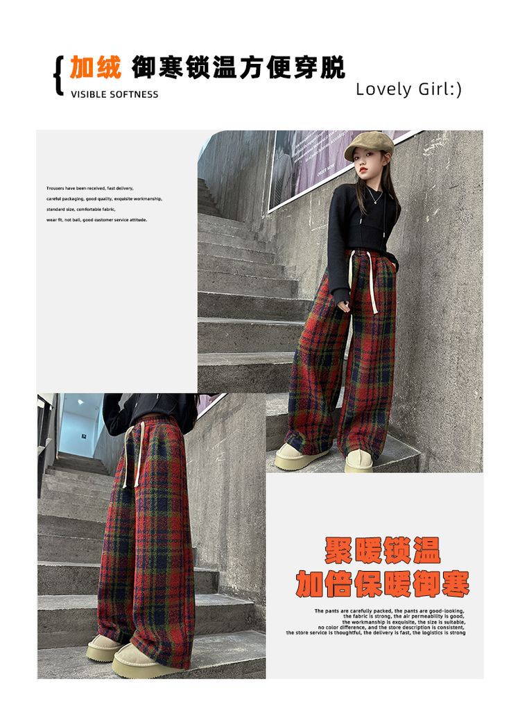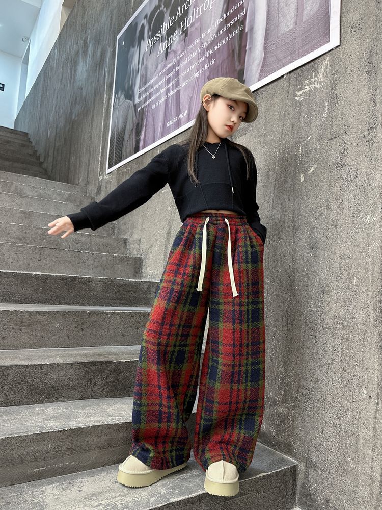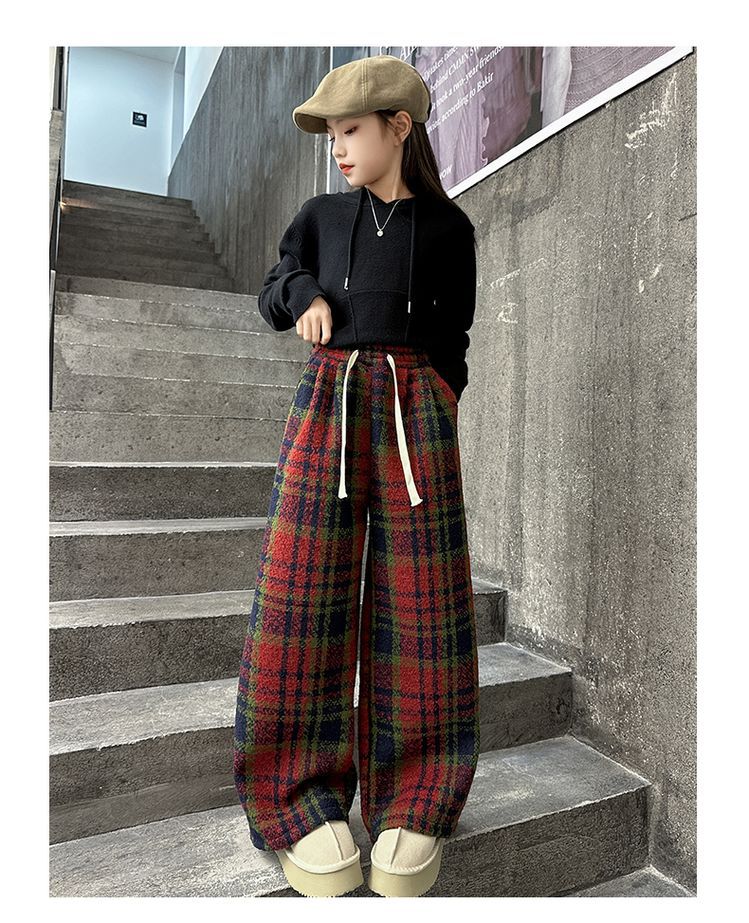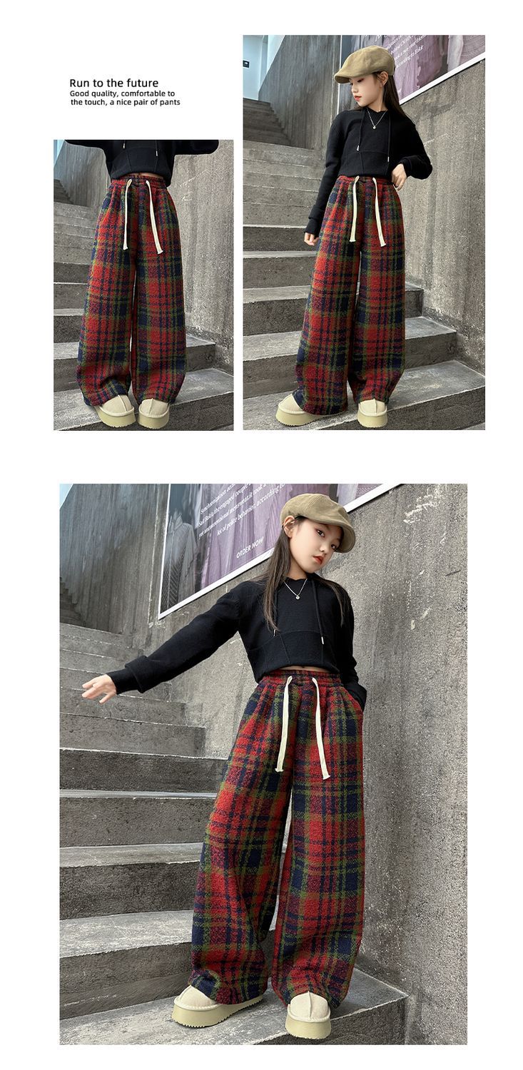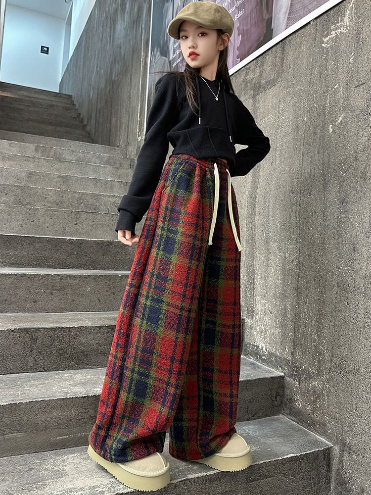여아 캐시미어 바지 외국식 가을과 겨울 어린이 모직 체크 무늬 바지 캐주얼 패션 미디어와 대형 어린이 와이드 레그 팬츠 도매