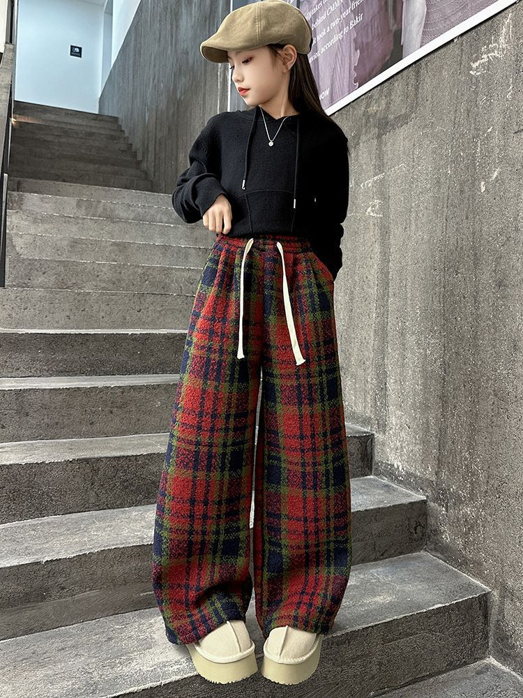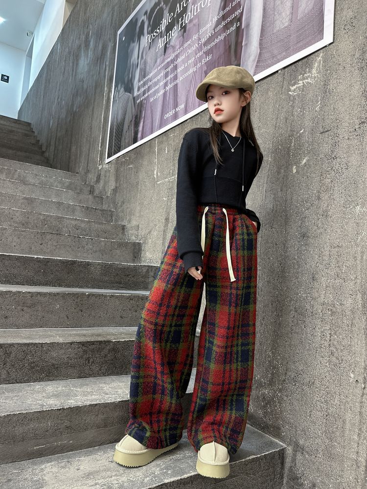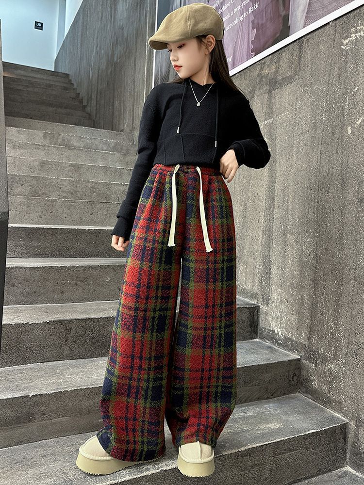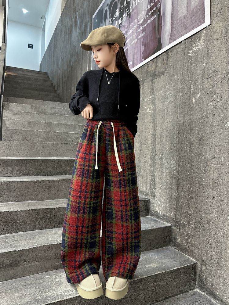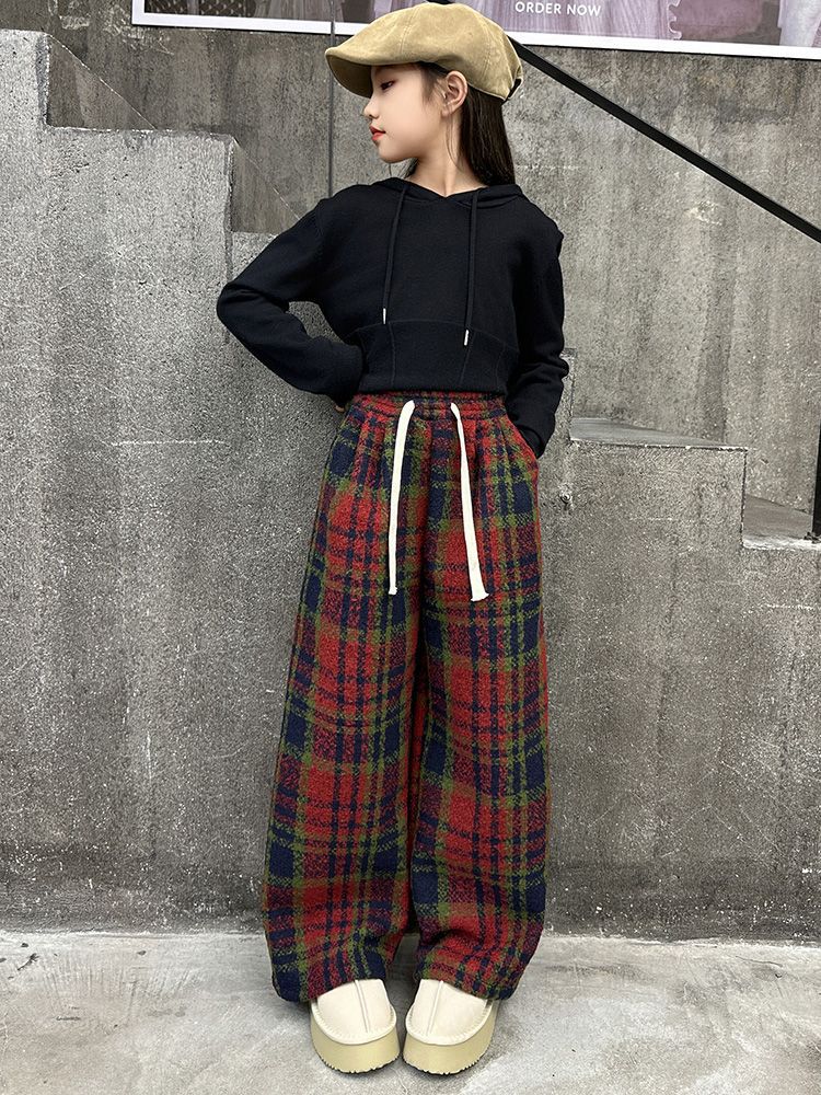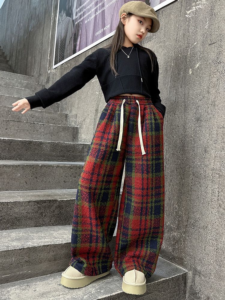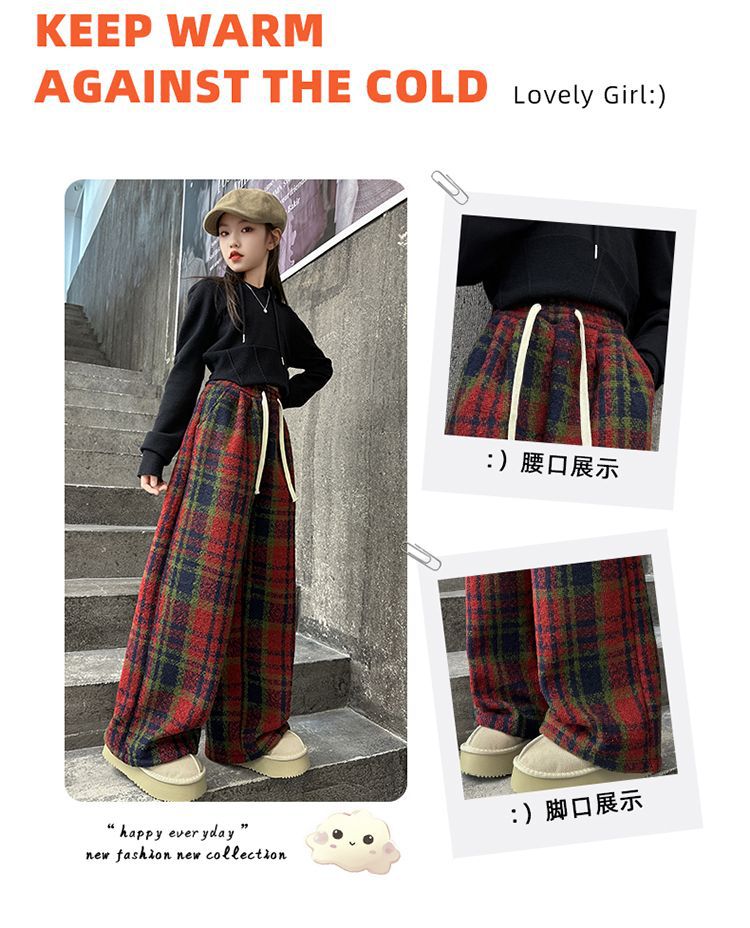 여아 캐시미어 바지 외국식 가을과 겨울 어린이 모직 체크 무늬 바지 캐주얼 패션 미디어와 대형 어린이 와이드 레그 팬츠 도매