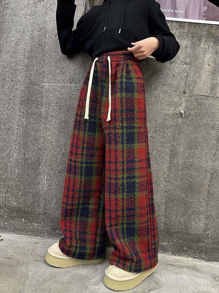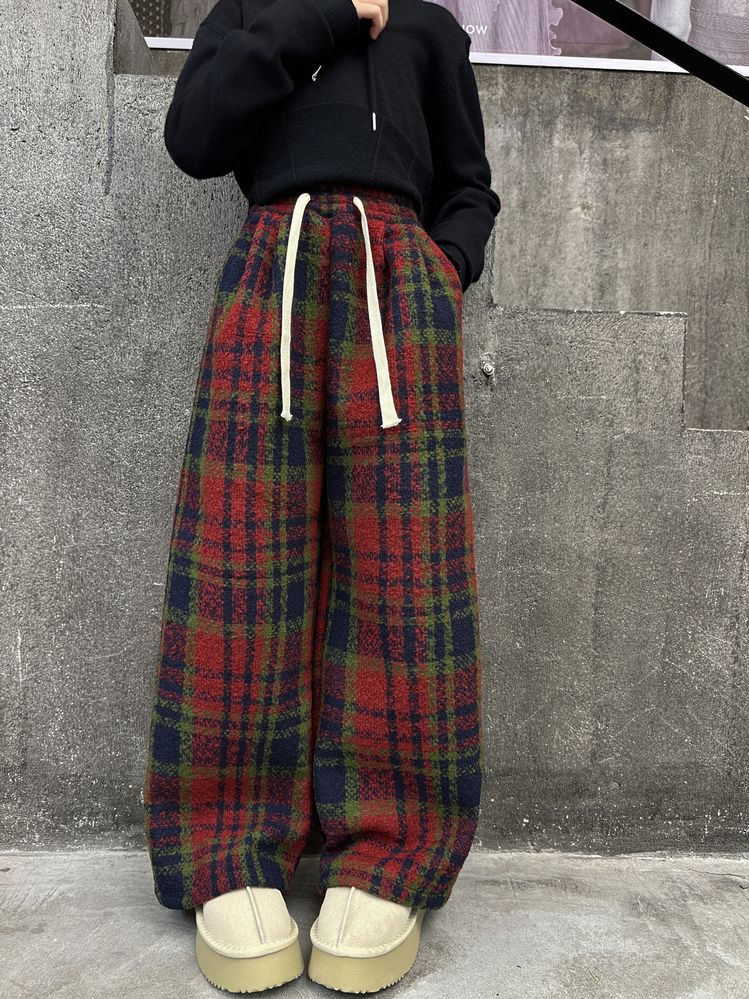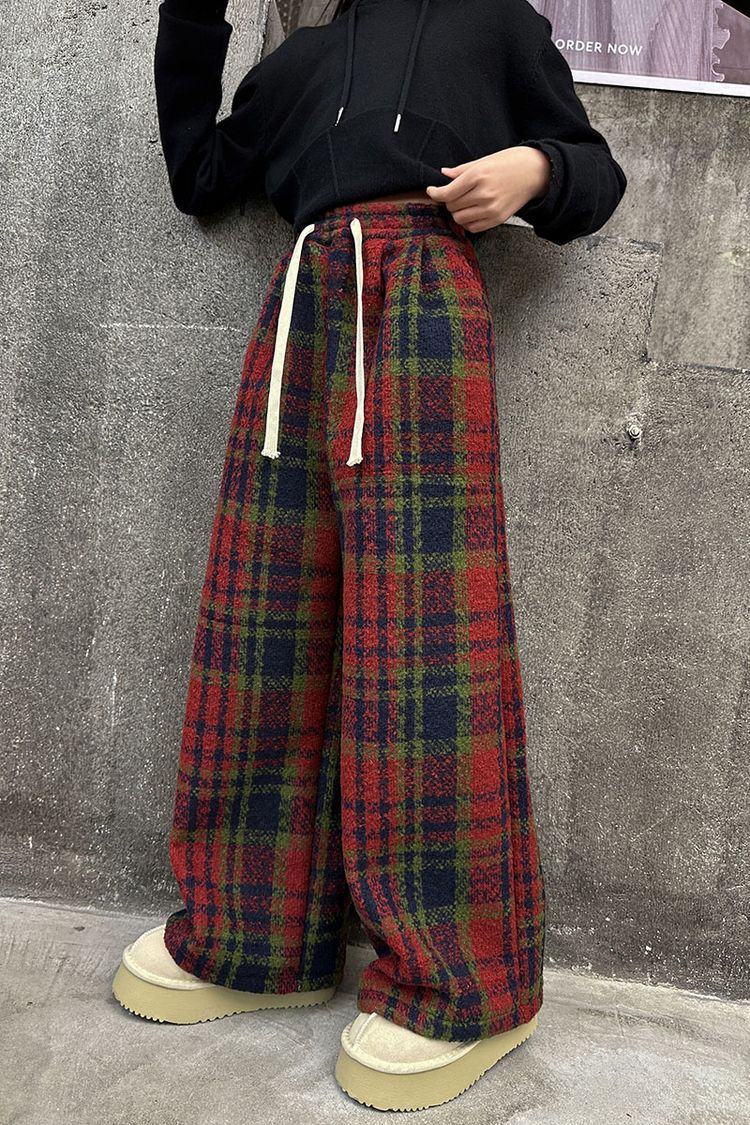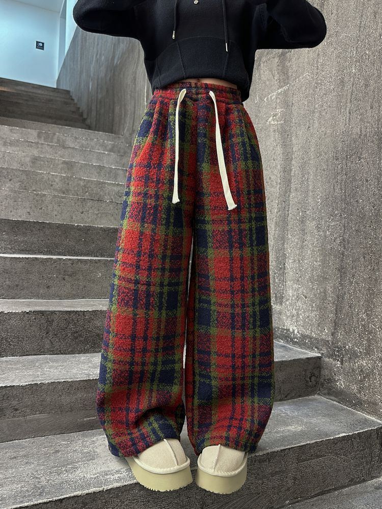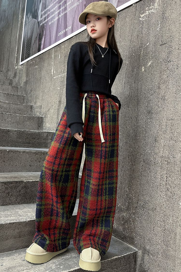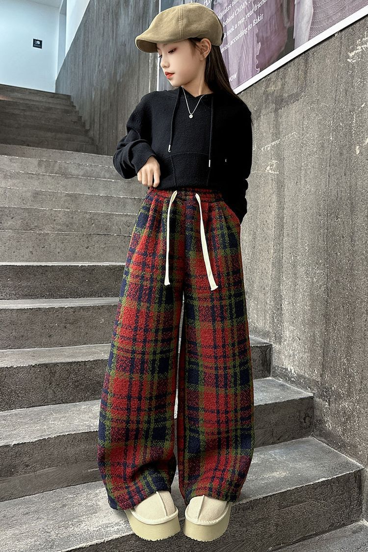여아 캐시미어 바지 외국식 가을과 겨울 어린이 모직 체크 무늬 바지 캐주얼 패션 미디어와 대형 어린이 와이드 레그 팬츠 도매