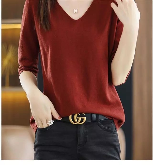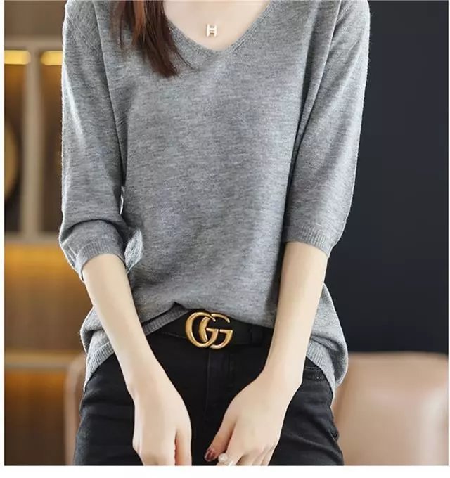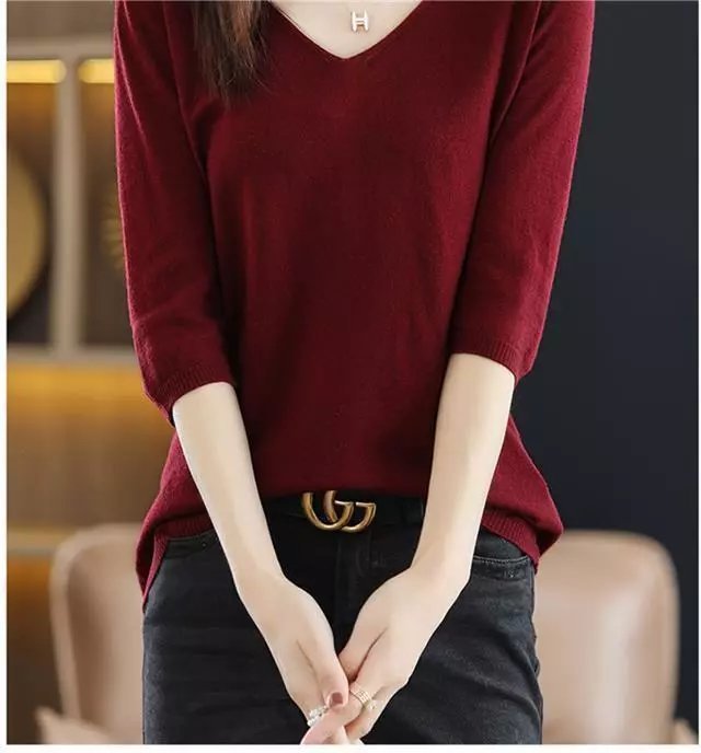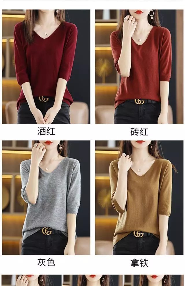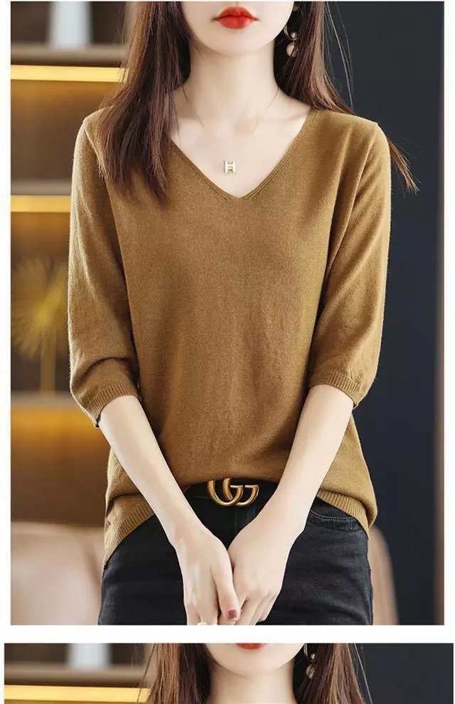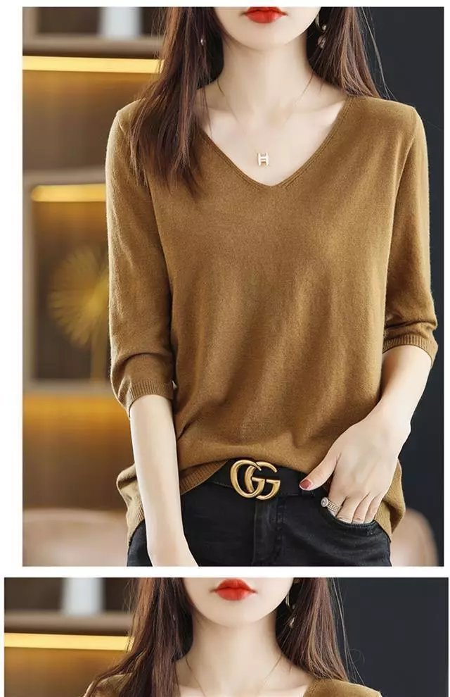 2022 년 봄과 가을 V 넥 풀오버 스웨터 여성 미드 슬리브베이스 셔츠 느슨한 반소매 니트 반소매 여성용 이너 탑스토어 가기