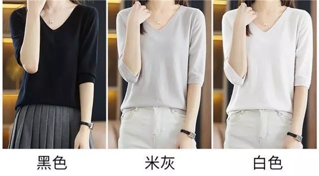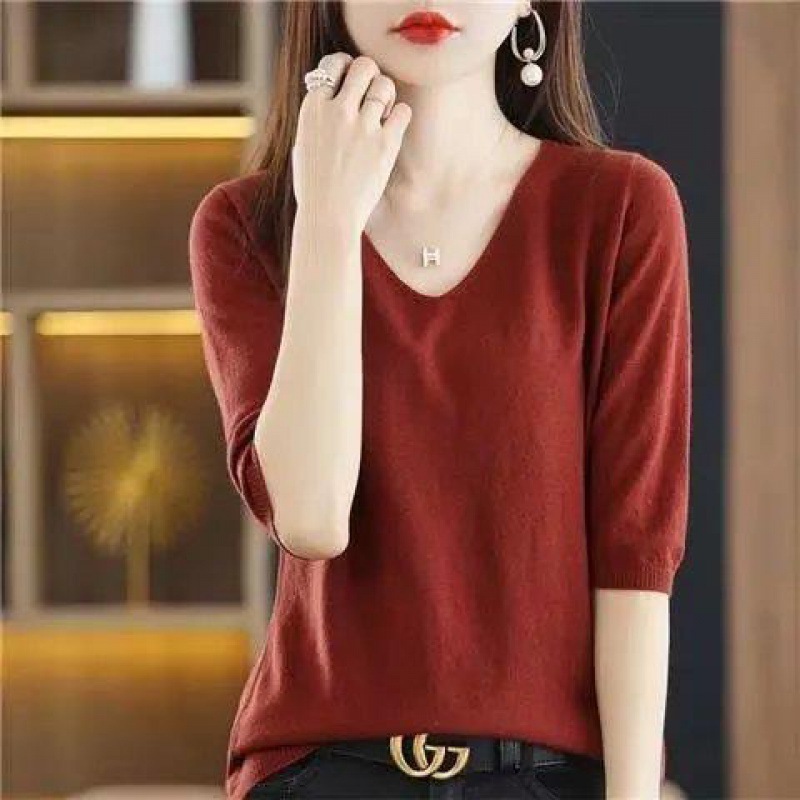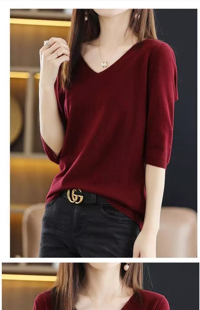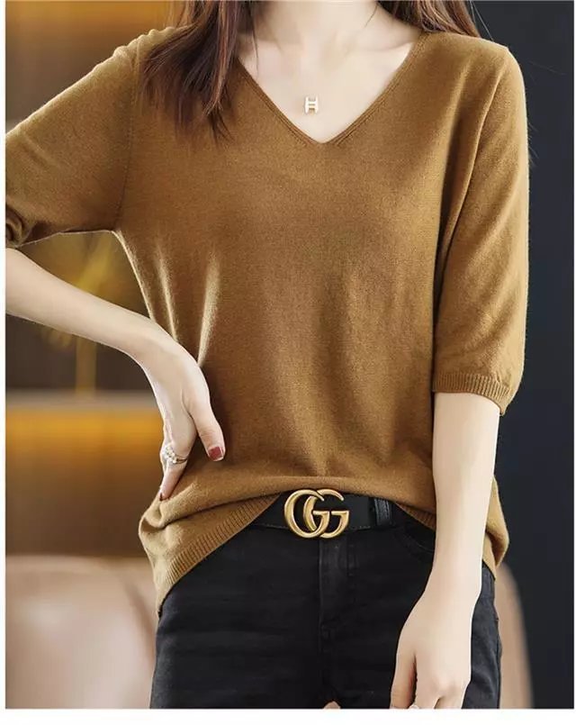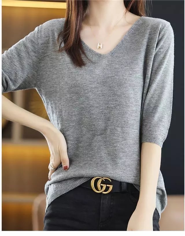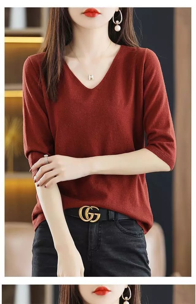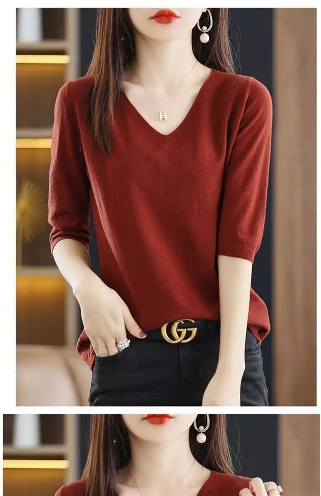 2022 년 봄과 가을 V 넥 풀오버 스웨터 여성 미드 슬리브베이스 셔츠 느슨한 반소매 니트 반소매 여성용 이너 탑스토어 가기