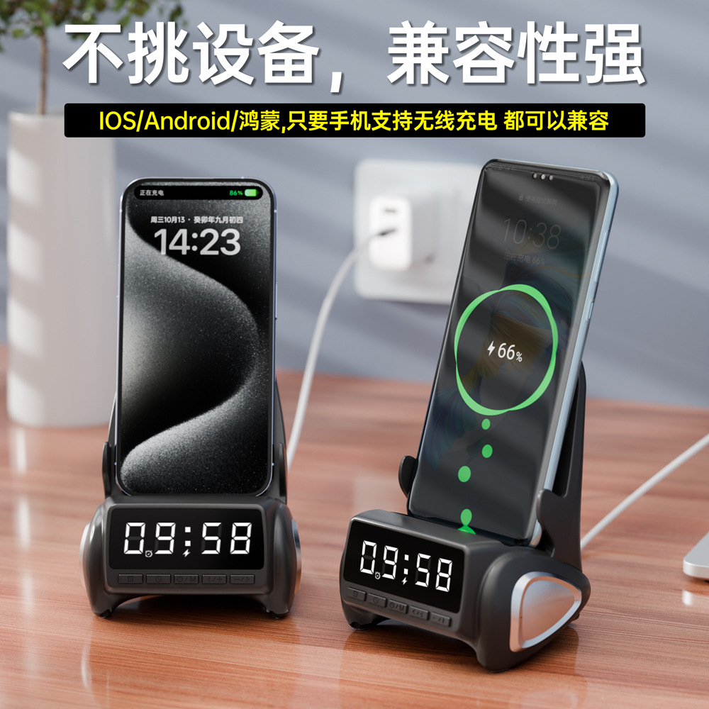 새로운 다기능 유도 스피커 무선 유도 블루투스 스피커 지원 브래킷 알람 시계와 무선 충전 대신 보낼 수 있습니다