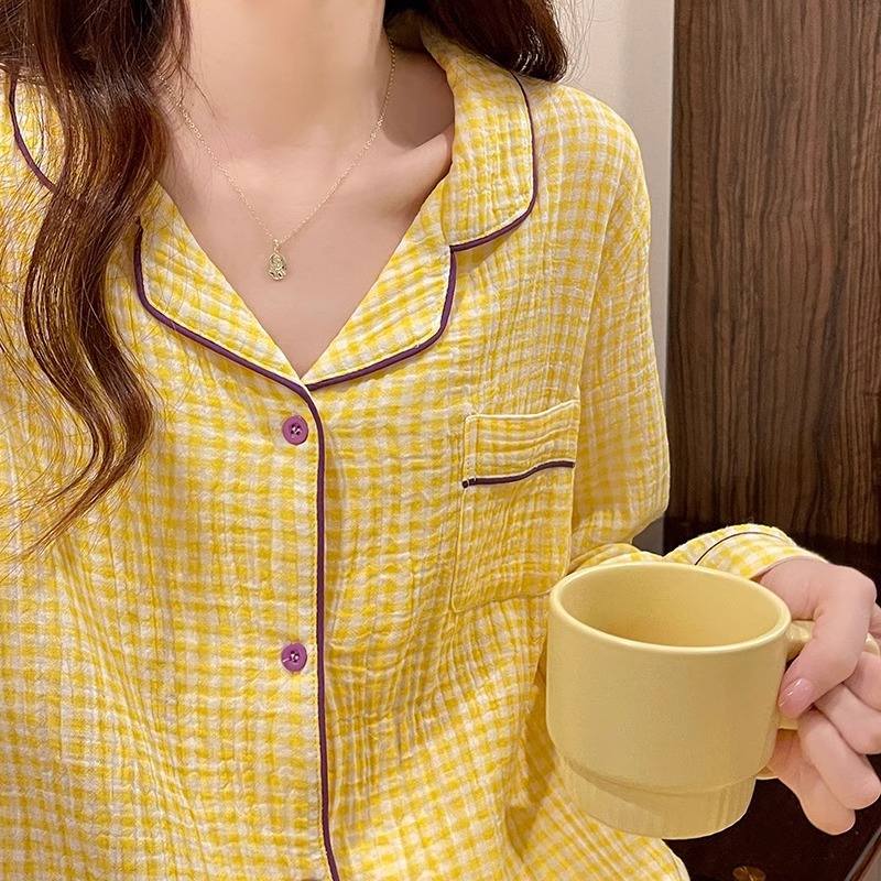 여자 친구 잠옷 여성 Instagram 한국 노란색 격자 무늬 봄과 가을 긴 소매 커플의 간단한 홈 의류 세트스토어 가기