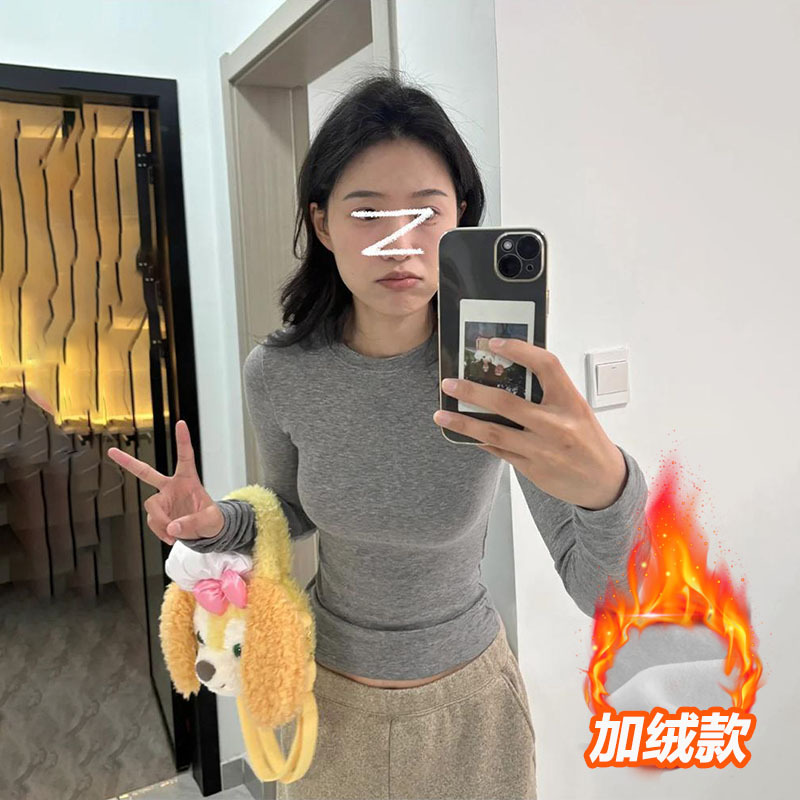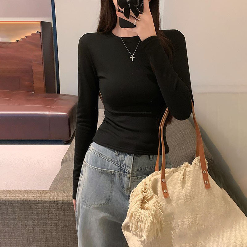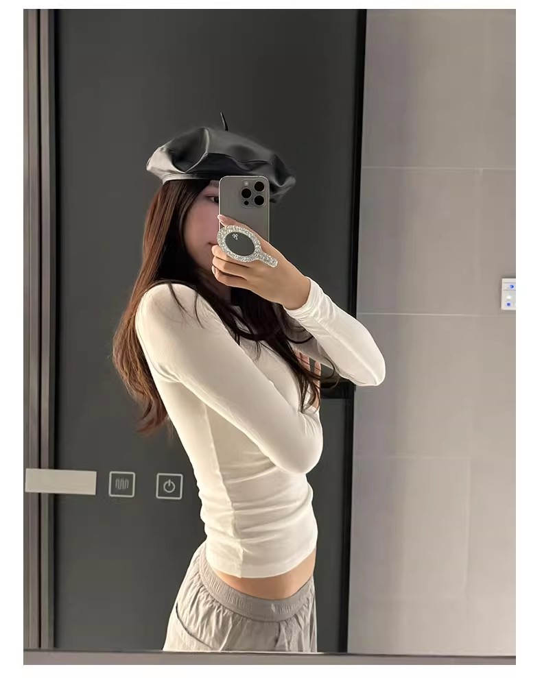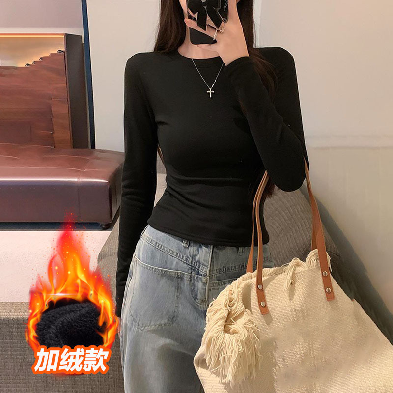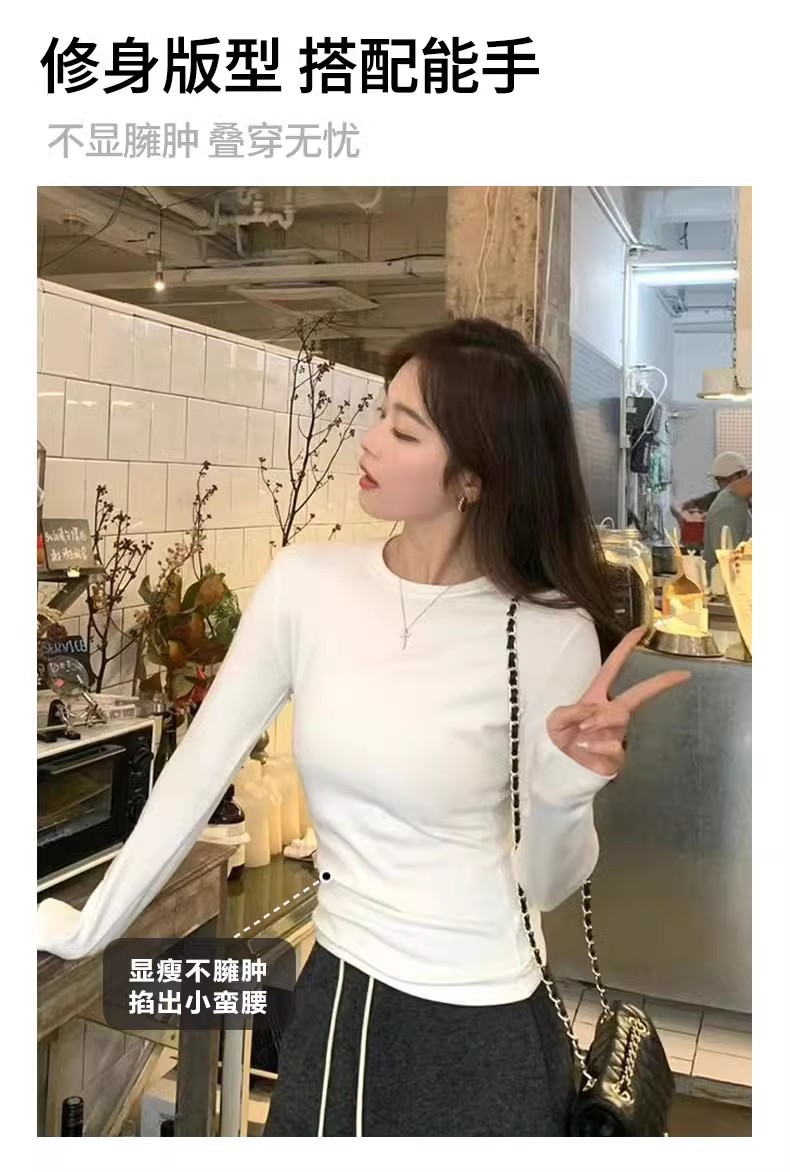 가을 겨울 여성용 라운드 넥 화이트 벨벳 슬림 긴팔 셔츠, 이너웨어 및 아우터웨어, 오른쪽 어깨 허리 2025 뉴 탑