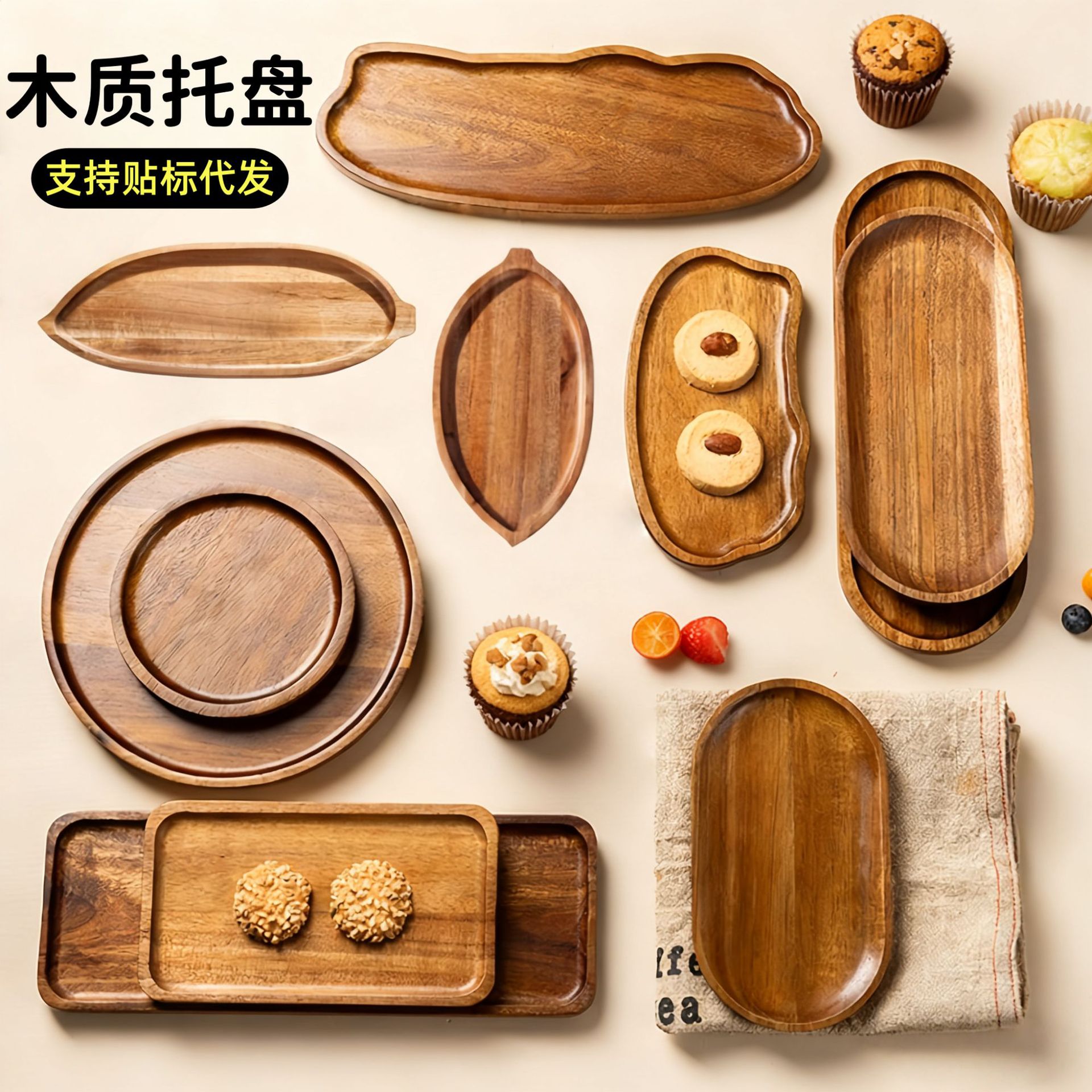 일본식 아카시아 나무 트레이 직사각형 식판 단열 원목 패턴 접시 타원형 빵판 나무 트레이 도매