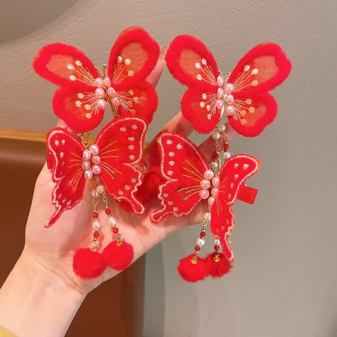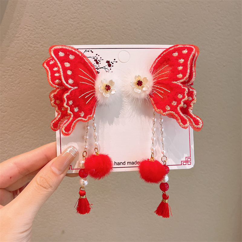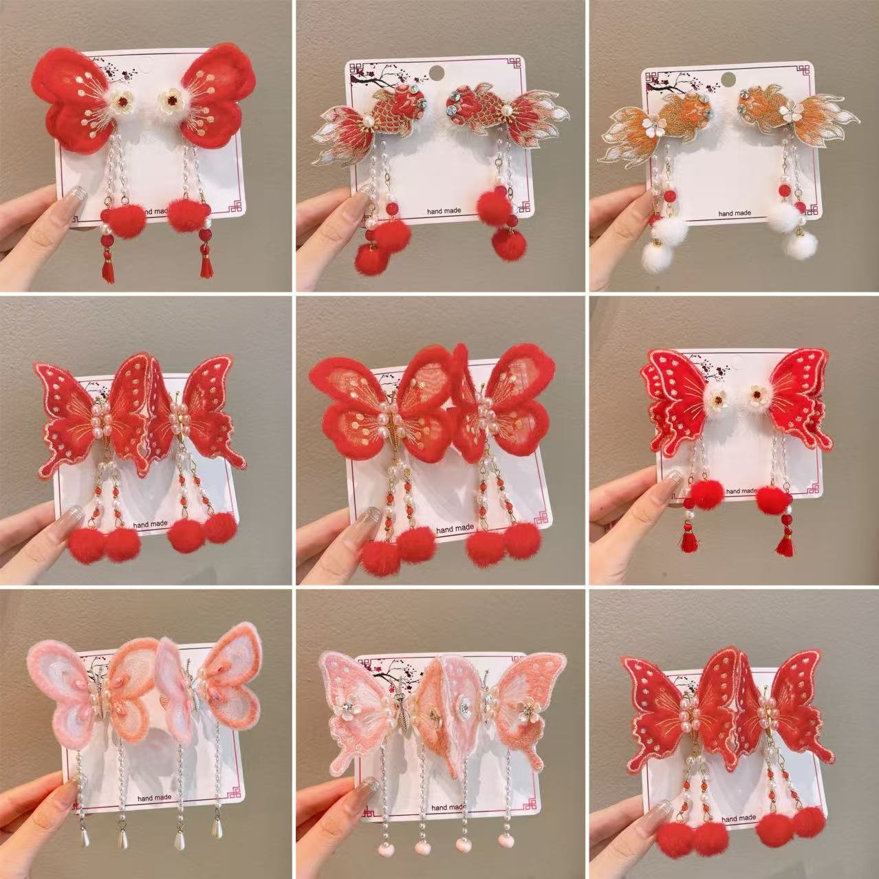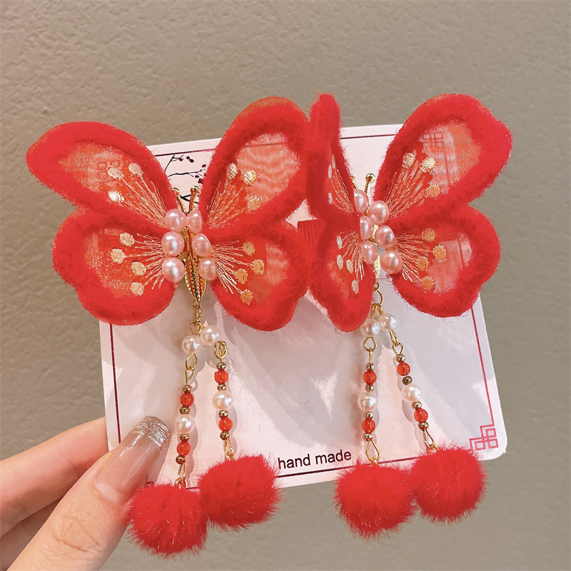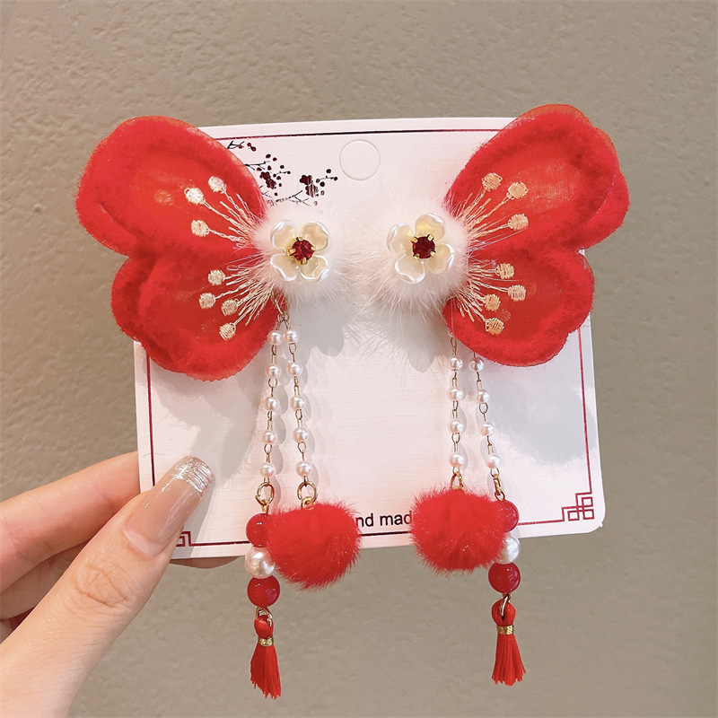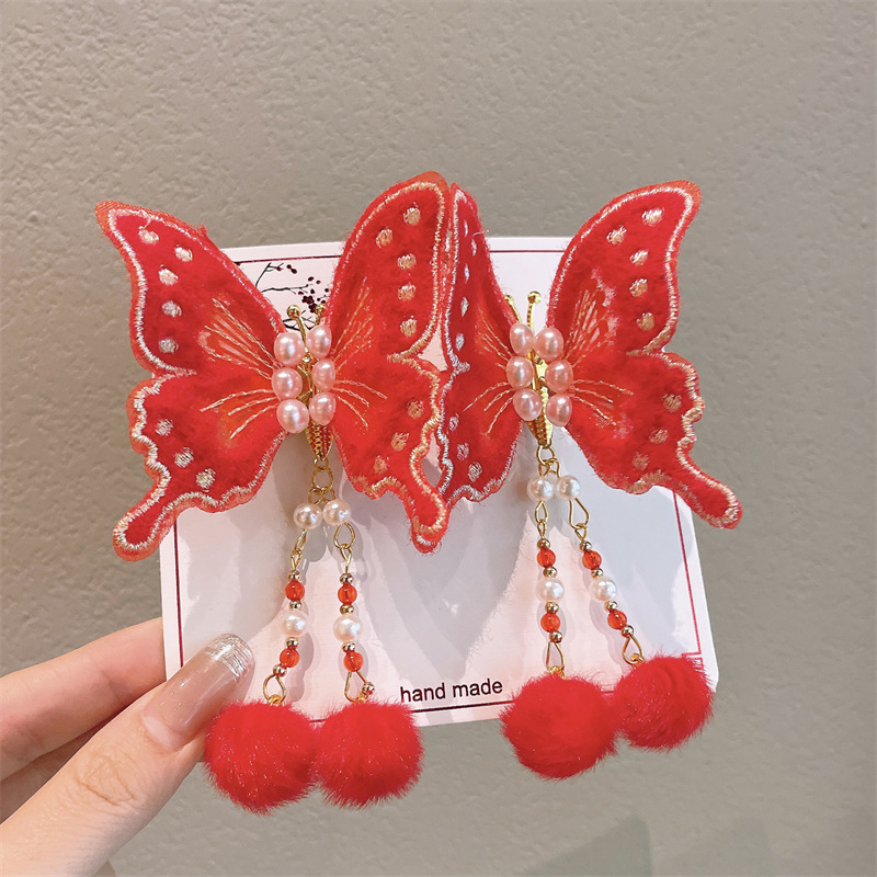 새해 어린이 빨간 활 머리핀 쌍 클립 봉제 술 헤어 핀 클립 걸스 해피 뉴 이어 헤드웨어