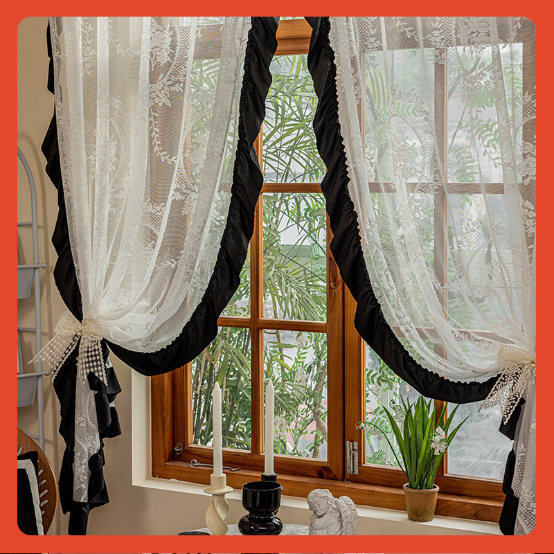 ✅ 프랑스 복고풍 거울 꽃 검은 레이스 소녀 복고풍 궁전 거즈 커튼 빛 럭셔리 창 스크린