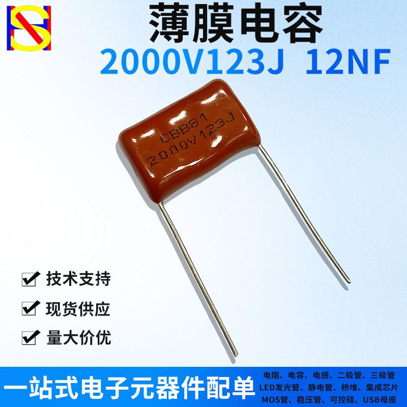 一站式电子元器件BOM配单聚丙烯膜电容器(CBB81) 2000V123J 12NF薄膜电容切脚短脚剪脚编带