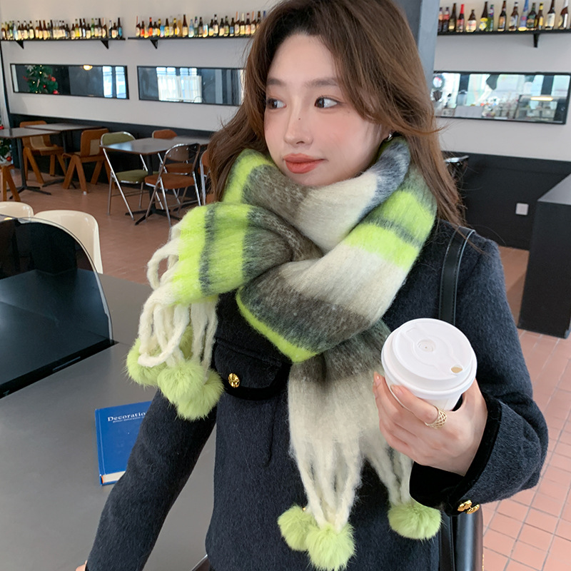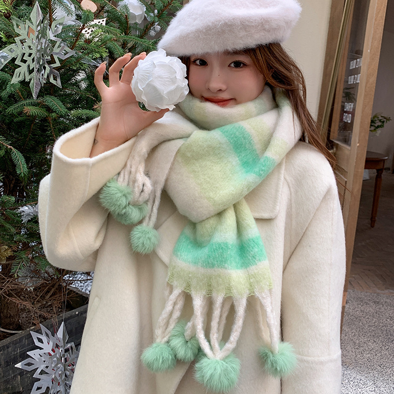 马卡龙色系~韩版时尚百搭女拼色保暖毛球围巾日系多巴胺软糯披肩