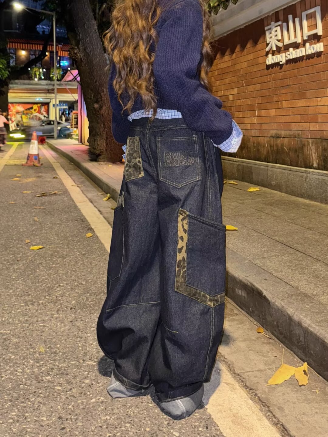 아메리칸 스타일 하이 스트리트 레트로 멀티 백 바지 레오파드 무늬 시미 타르 청바지 남성 및 여성 디자인 감각 느슨한 미드 웨이스트 바지