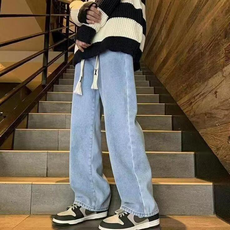 아메리칸 스타일 빈티지 기모 두꺼운 청바지 남자의 가을과 겨울 새로운 홍콩 스타일 느슨한 넓은 다리 바지 모든 경기 캐주얼 긴 바지